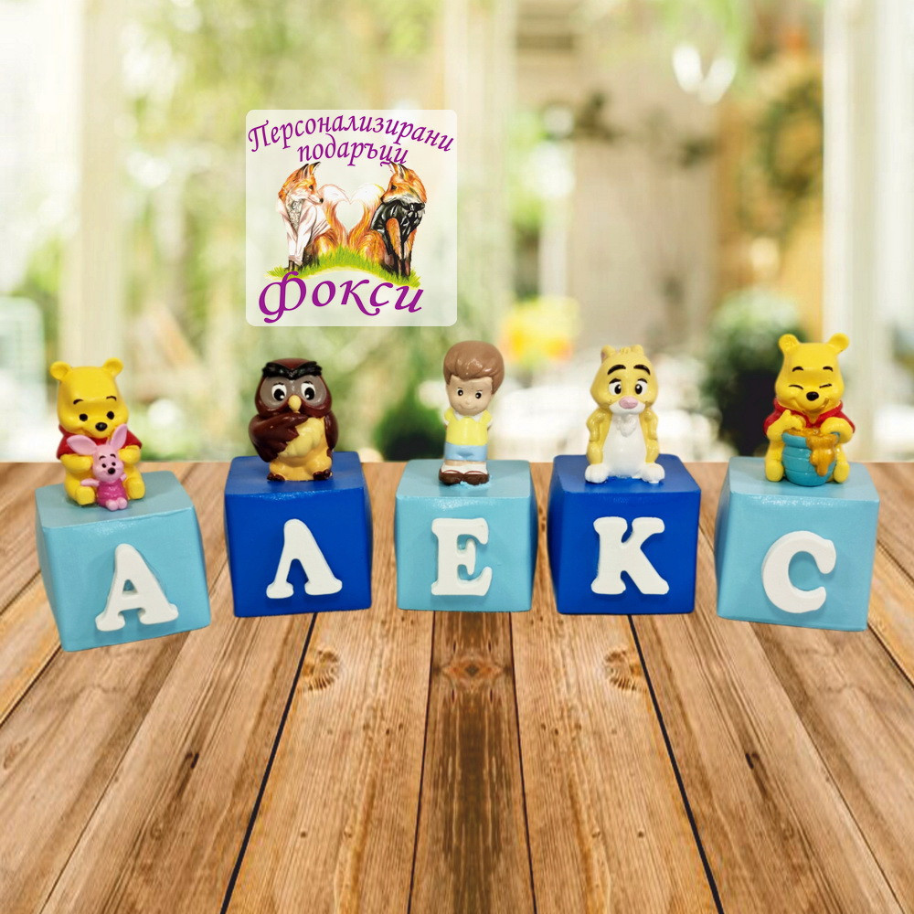 Керамични кубчета с букви за изписване на детско име / Именки, декорирани с фигурки на Мечо Пух и приятели Размер на кубчето 6х6х6 см, височина на букрите 4,5 см, височина на кубчето и фигурката 13 см. Могат да се изработят в различни цветове Чудесен начин да декорирате стаята на вашето дете или да изненадате близки хора с интересен и оригинален подарък за всеки детски празник *** посочената цена е за 1 кубче с 1 буква и фигурка. www.foxy-wed.com