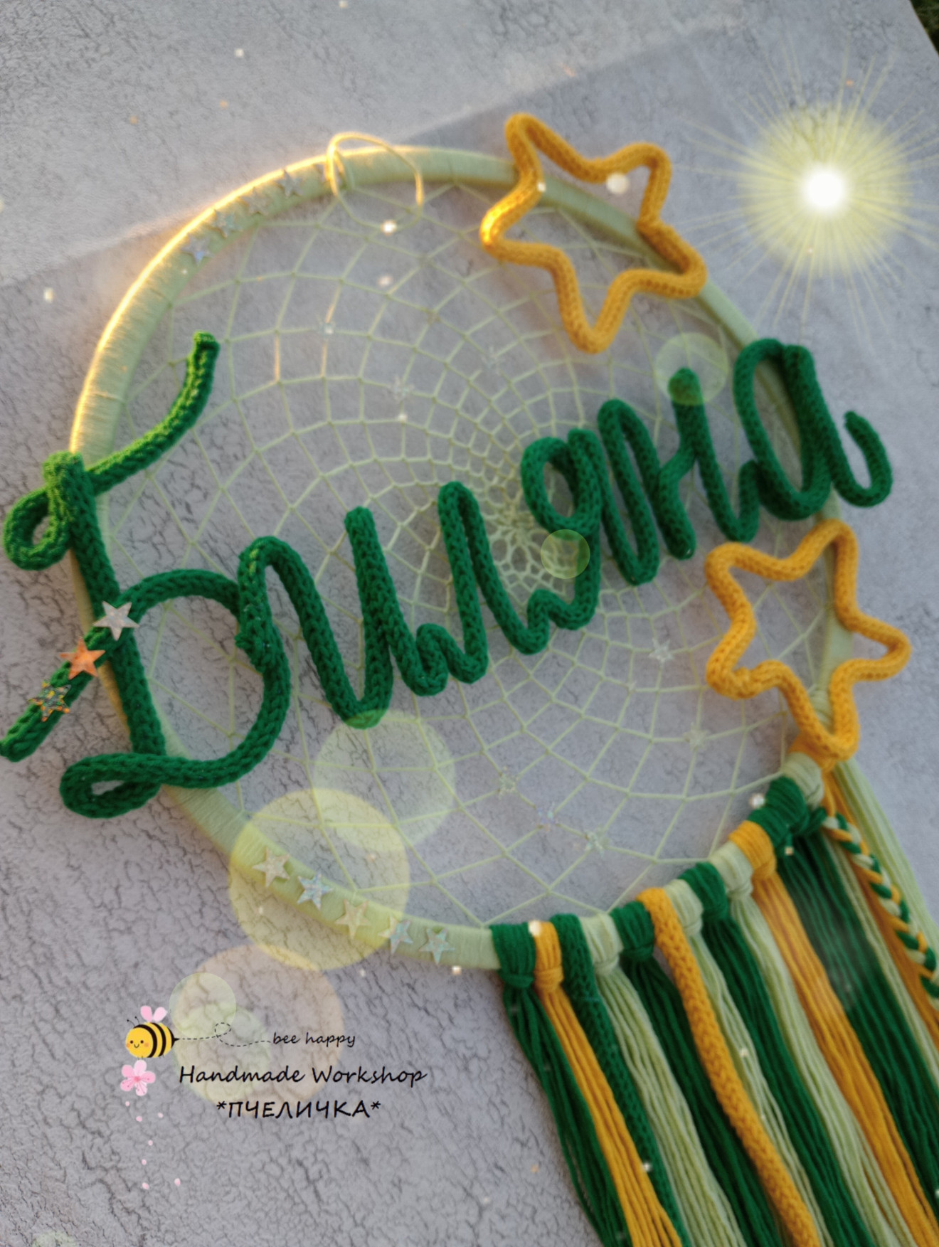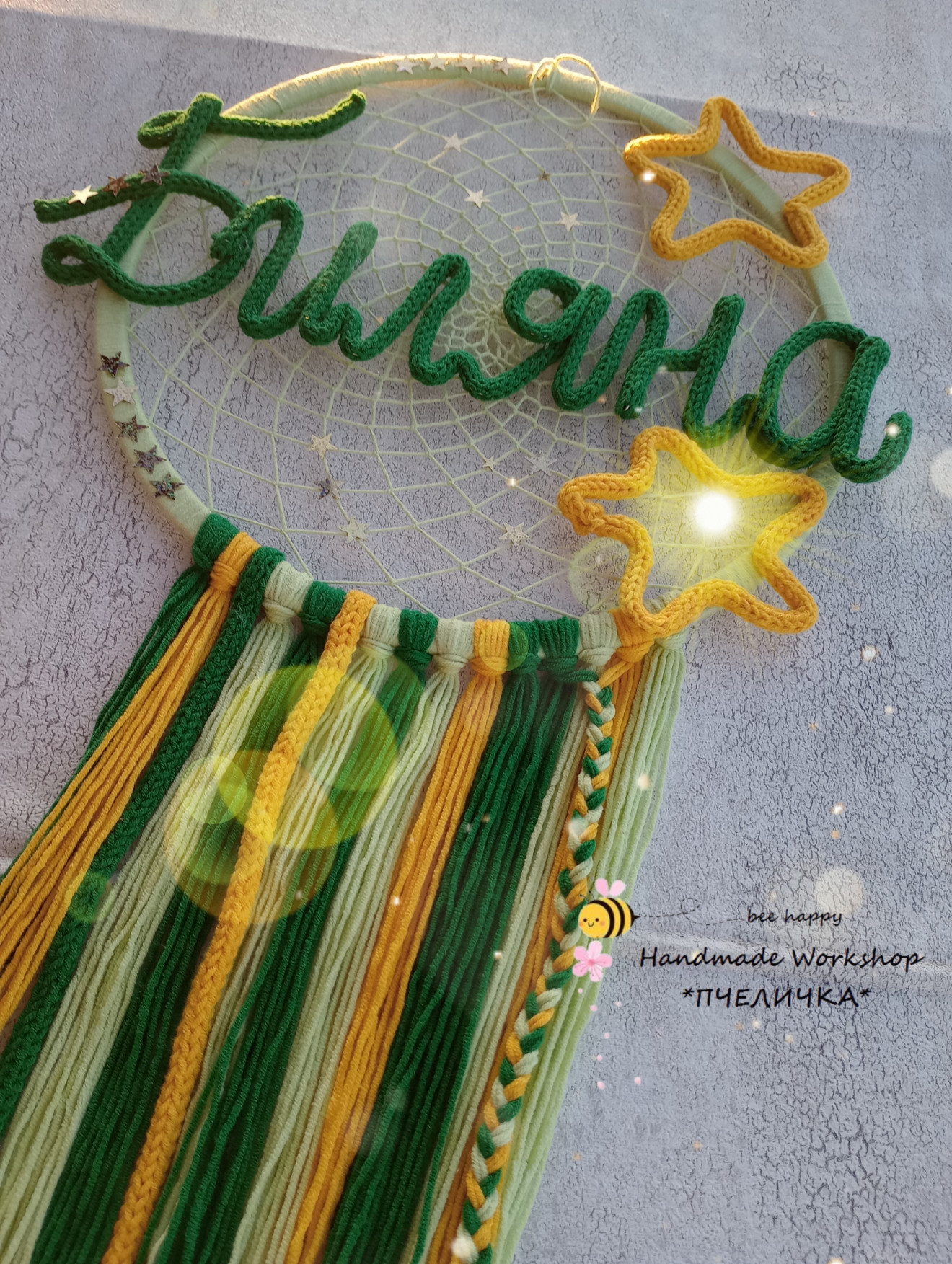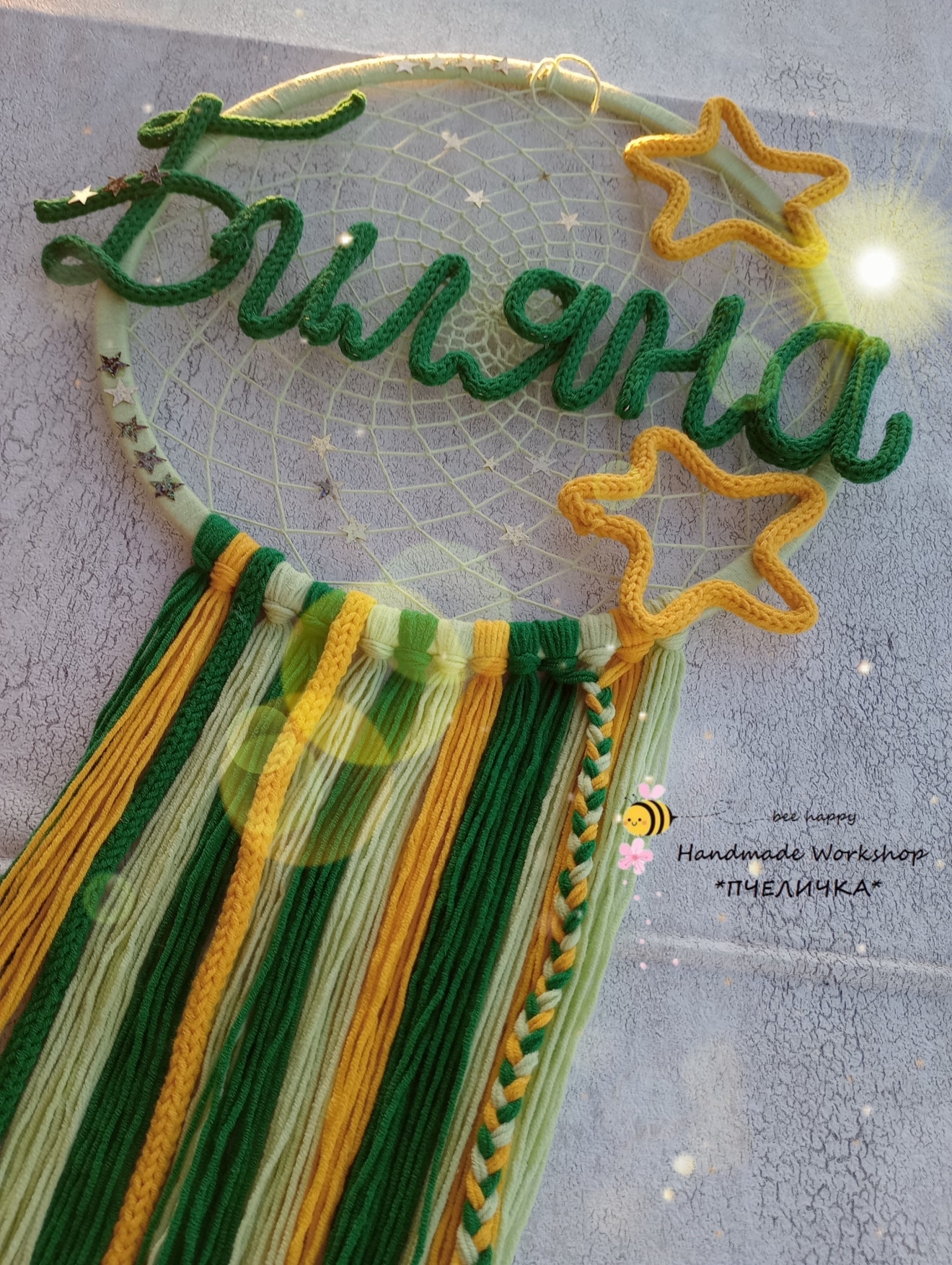 Персонализиран капан за сънища в пролетни цветове! Размер: диаметър 30.5см. ????? Ето още нещо интересно за капаните за сънища. Легендата за тях тръгва от индианските племена. Те са най-характерни за индианците от племето Оджибуе. Те давали на малките деца магически талисмани във формата на паяжини, окачени на обръч и ги поставяли над леглата им. Разбира се, капаните работели еднакво добре и за възрастните, както и за цели семейства. Почти всяка част от капана за сънища има собствено значение: Дървеният обръч е бил или кръгъл, или в сълзовидна форма, някои хора смятат, че изобразява цикъла на живота, а мрежата традиционно е направена по мотивите на паяжината с цел да улавя лошите сънища (или добрите, ако сме фенове на Лакота) и да предпазва сънуващия.