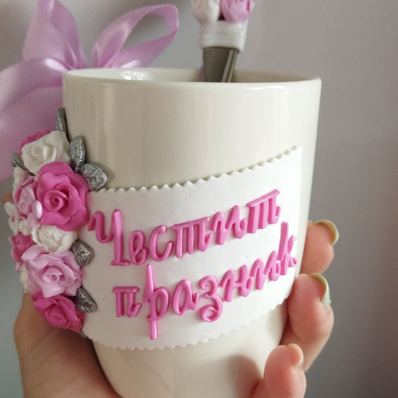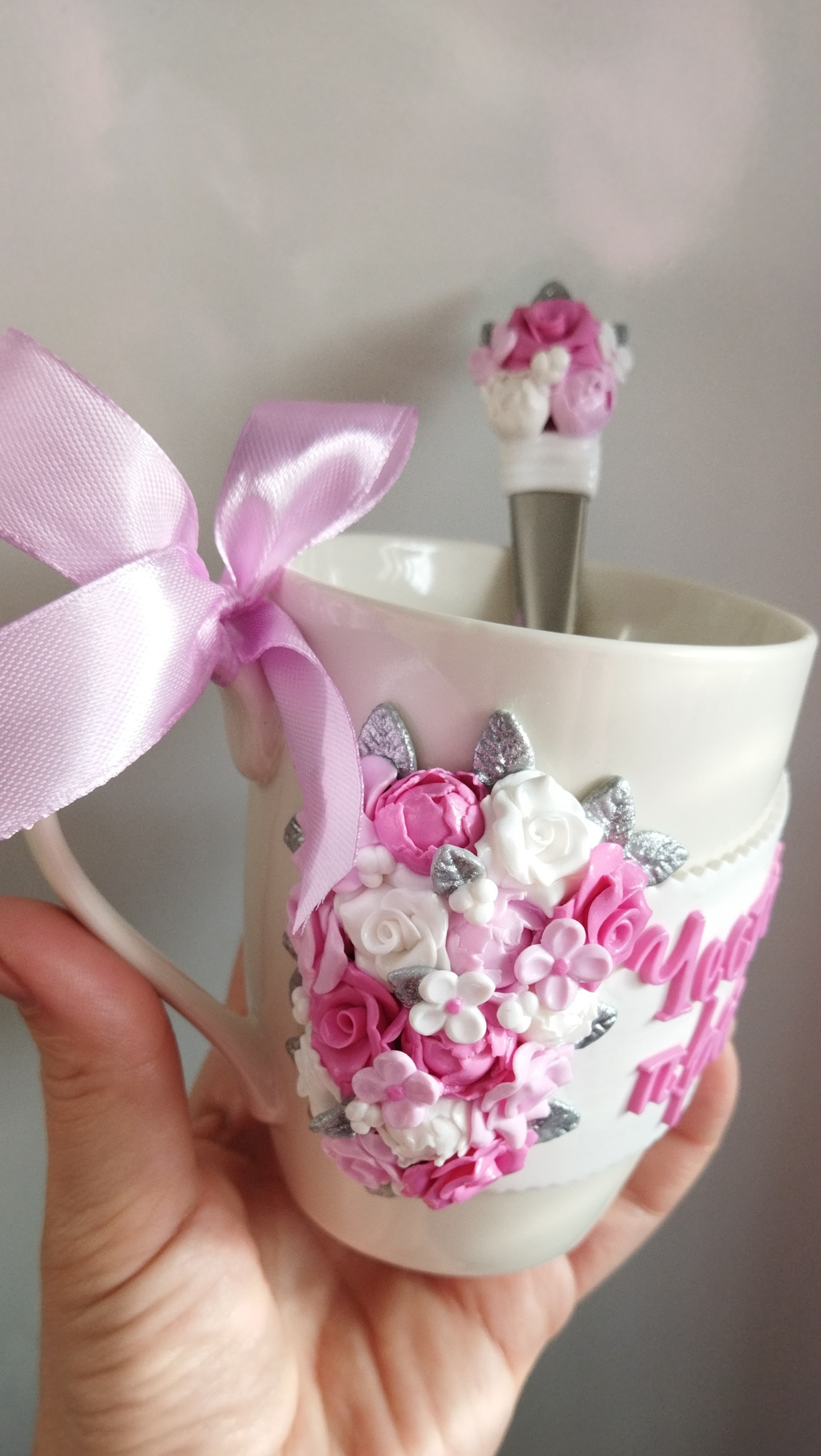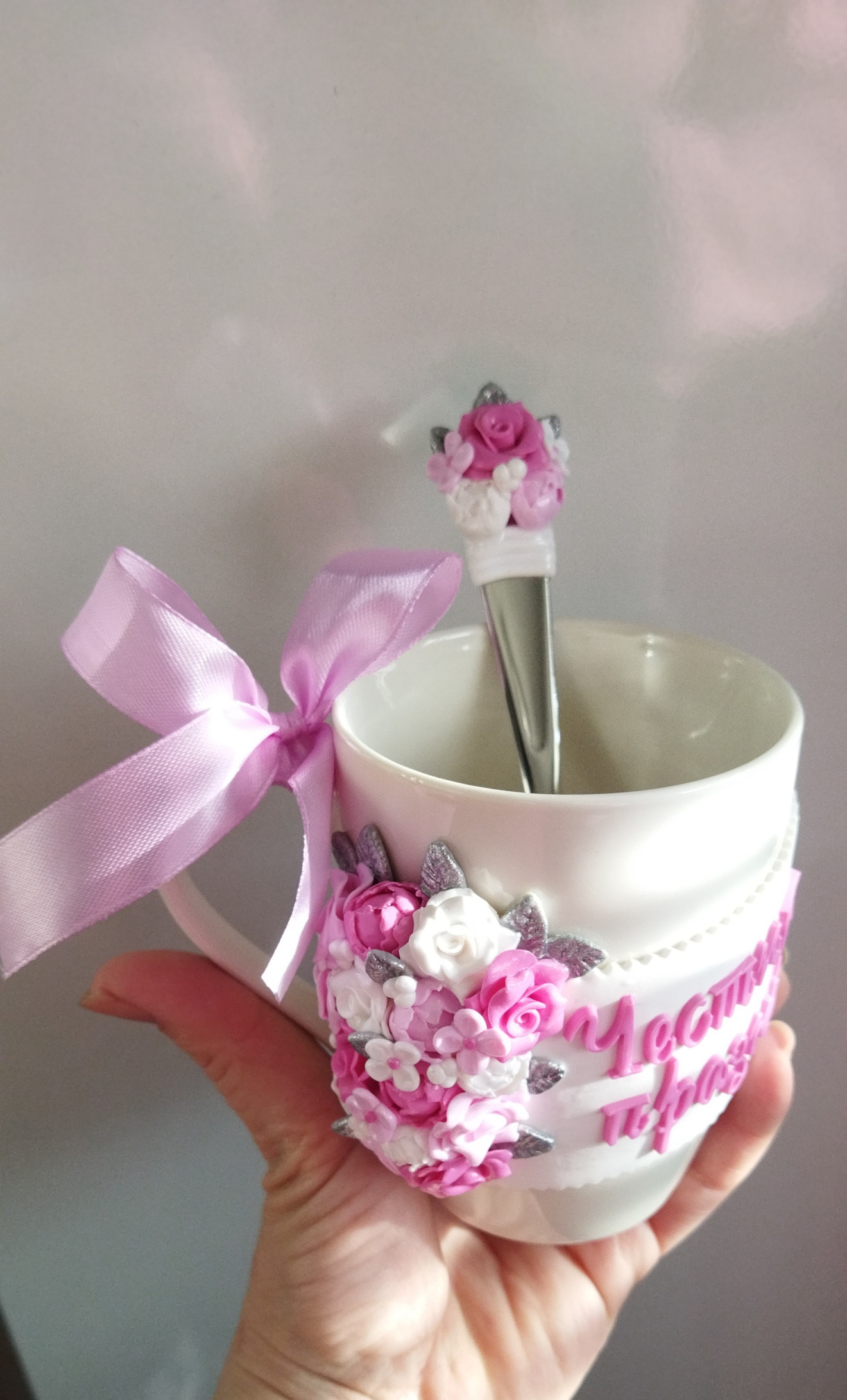 Наличен комплект "Цветя" включващ чаена чаша с текст и чаена лъжичка.