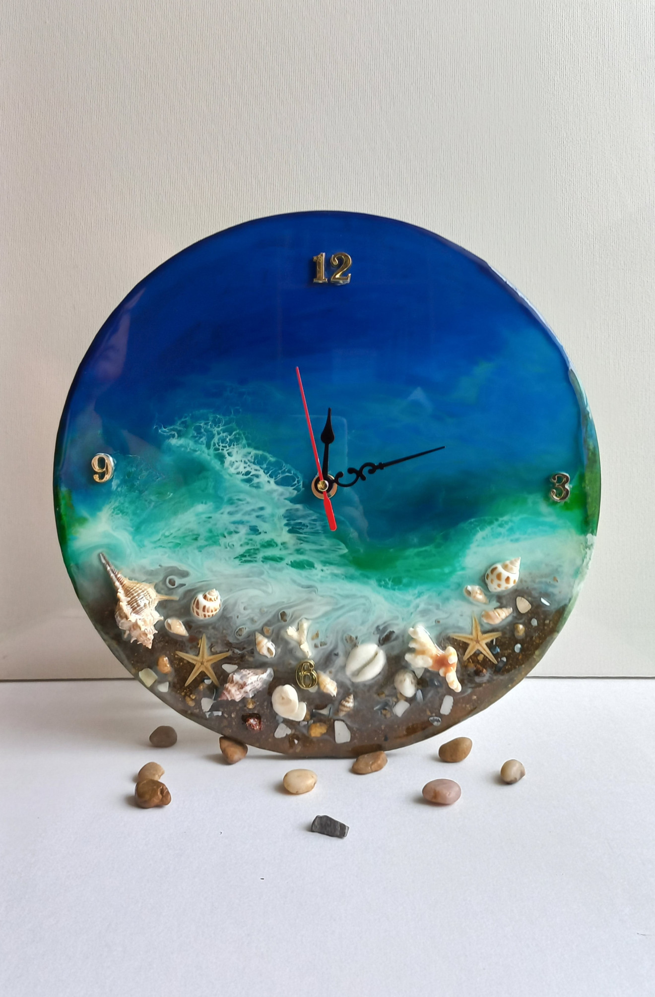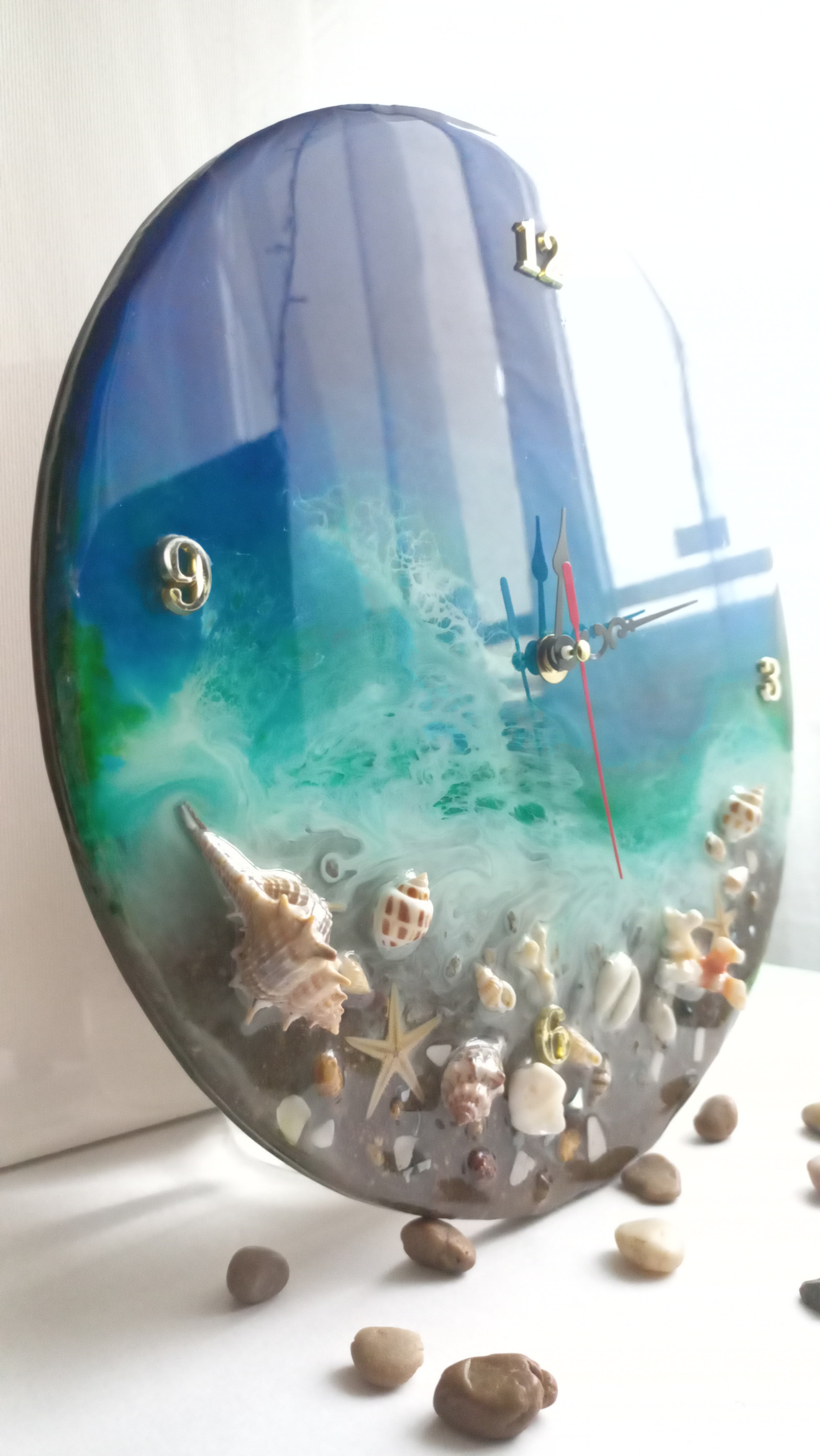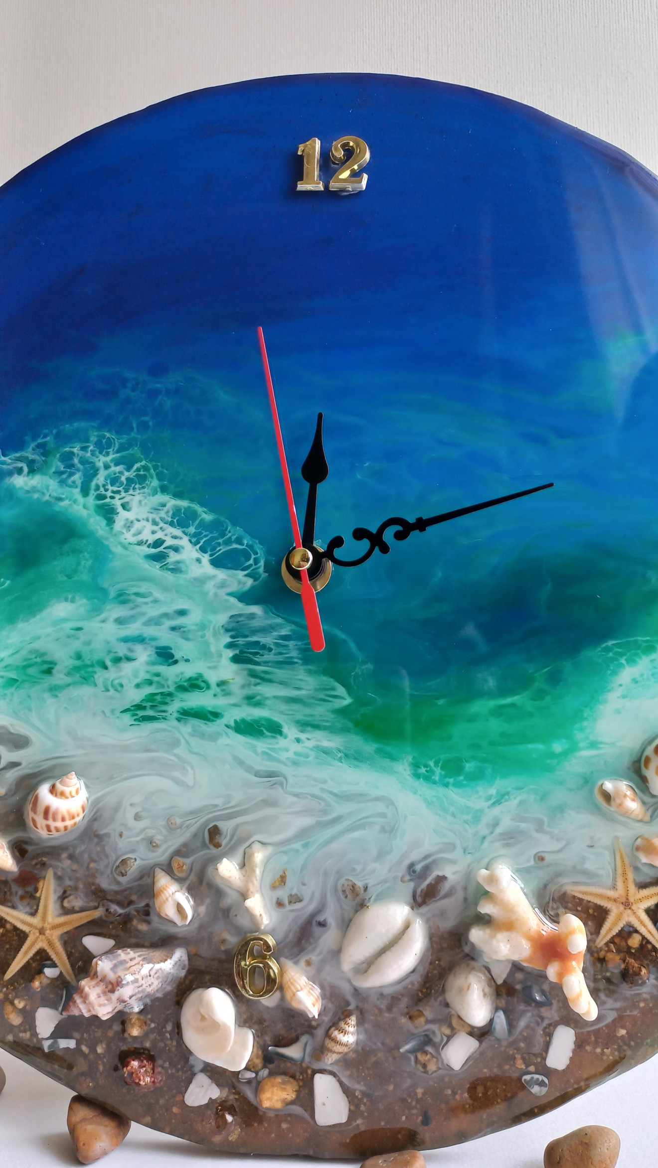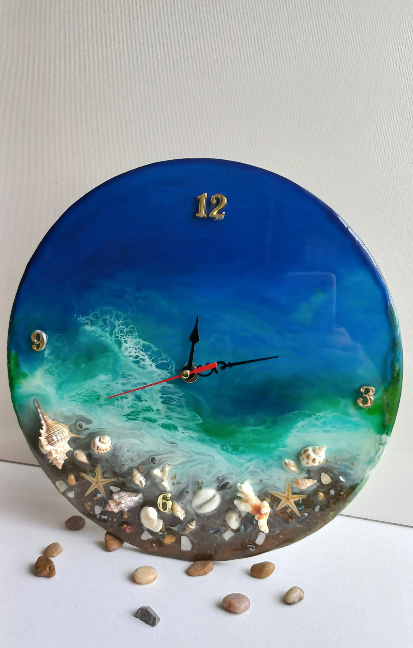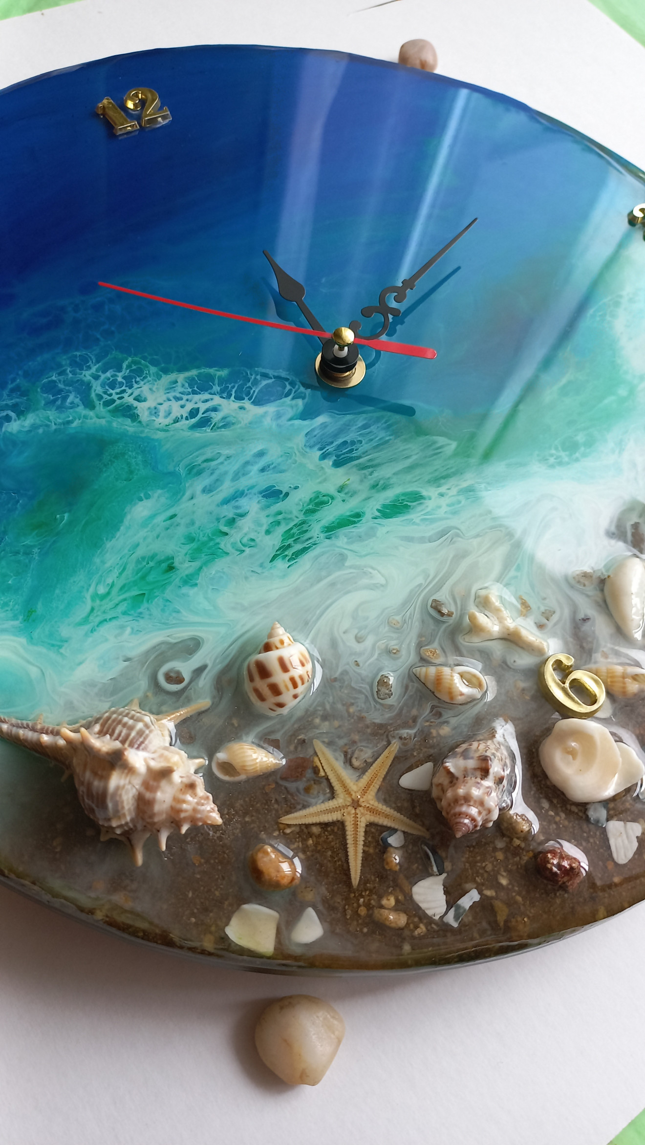 Арт часовник за стена от епоксидна смола, пясък и морски дарове. Ръчно изработен е върху дървена основа Ф30 см. Авторски уникат, изработен от Flora Bijuta Доставка: за сметка на купувача. Този часовник е поръчка, но може да се изработи подобен. Време за изработка 7-8 дни. При интерес и за поръчки, пишете ни на лично съобщение ?