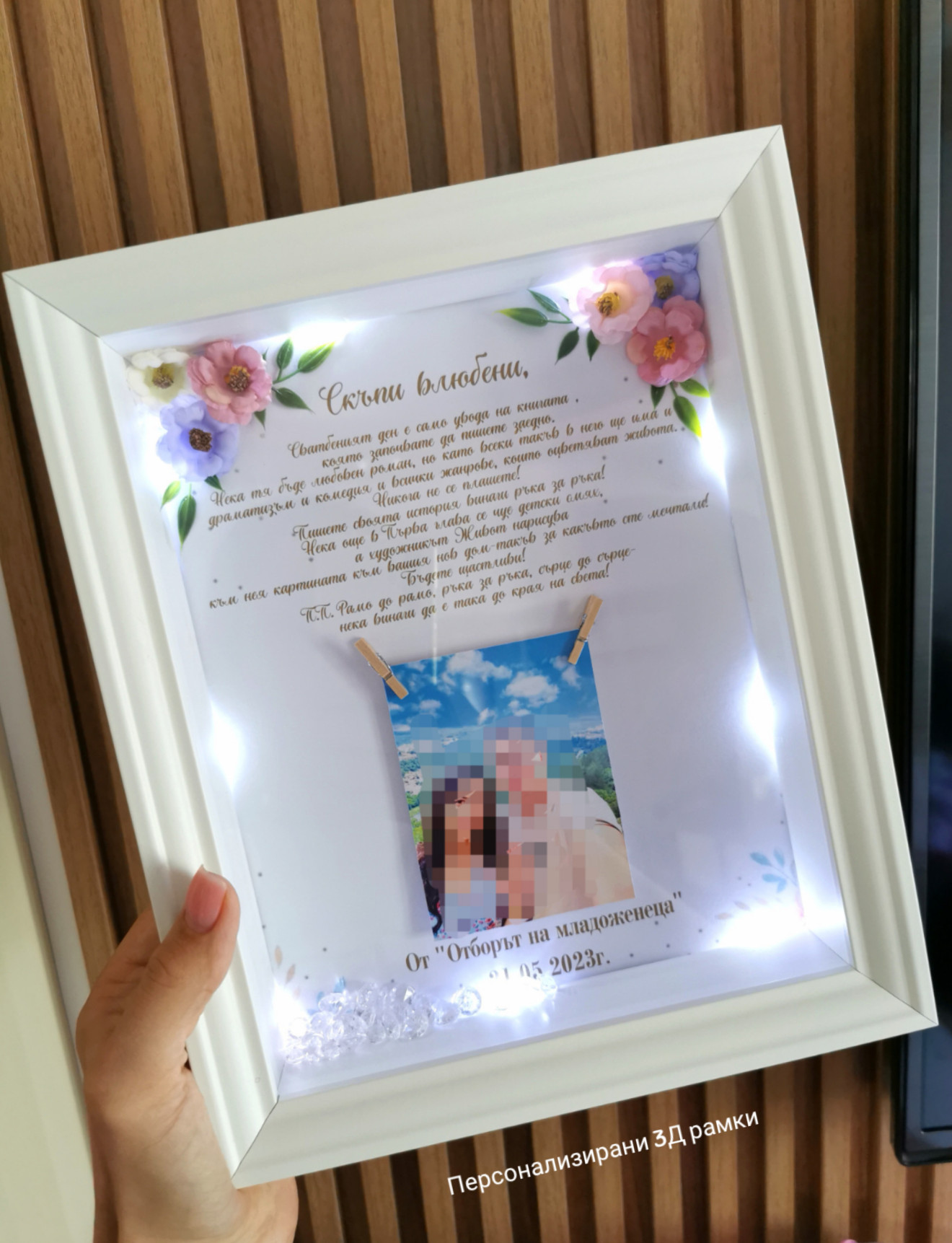 Светеща 3д рамка, подходящ подарък за сватба със снимка и текст по Ваш избор. Може да поръчате и на вайбър 0877434509