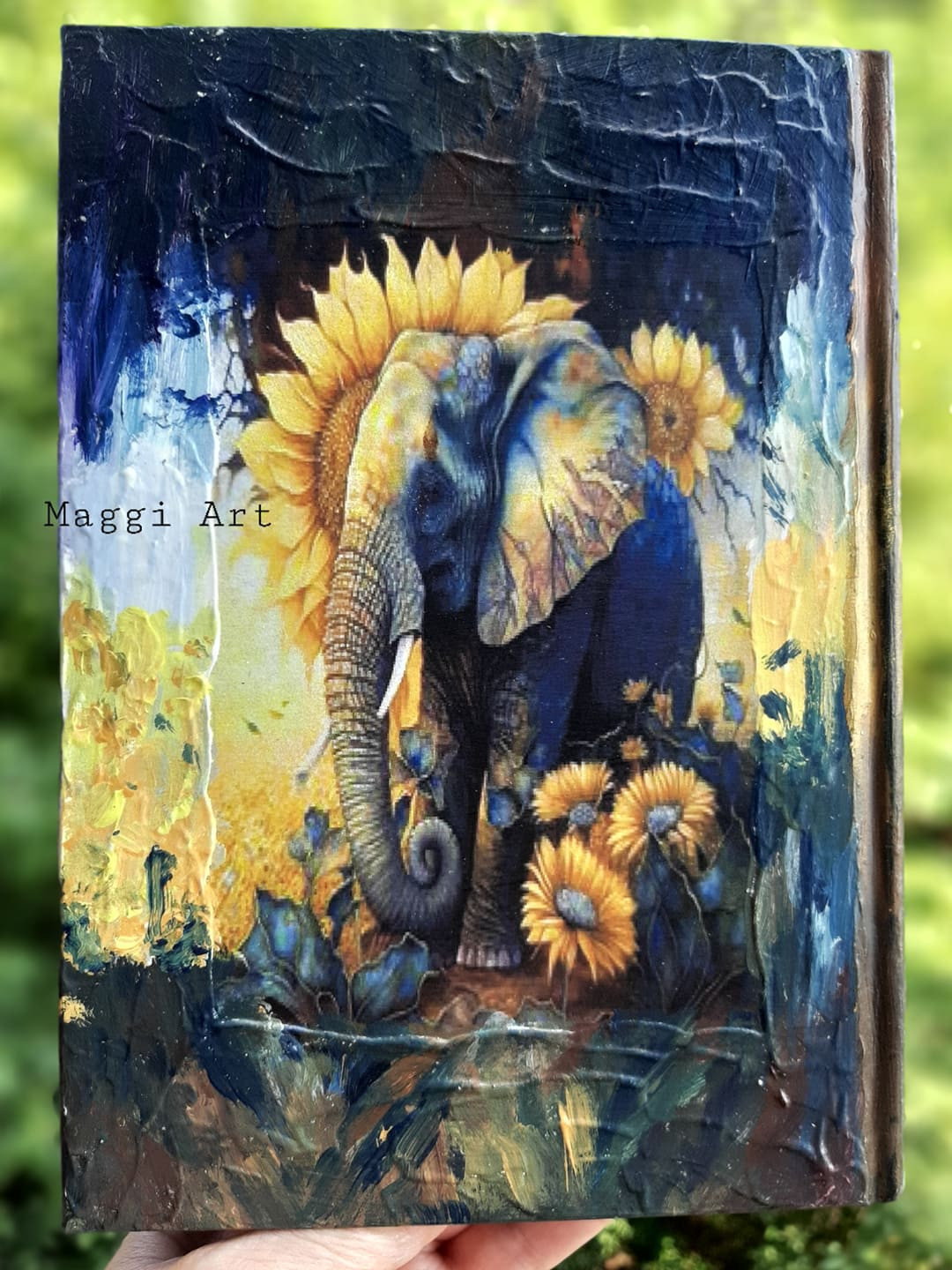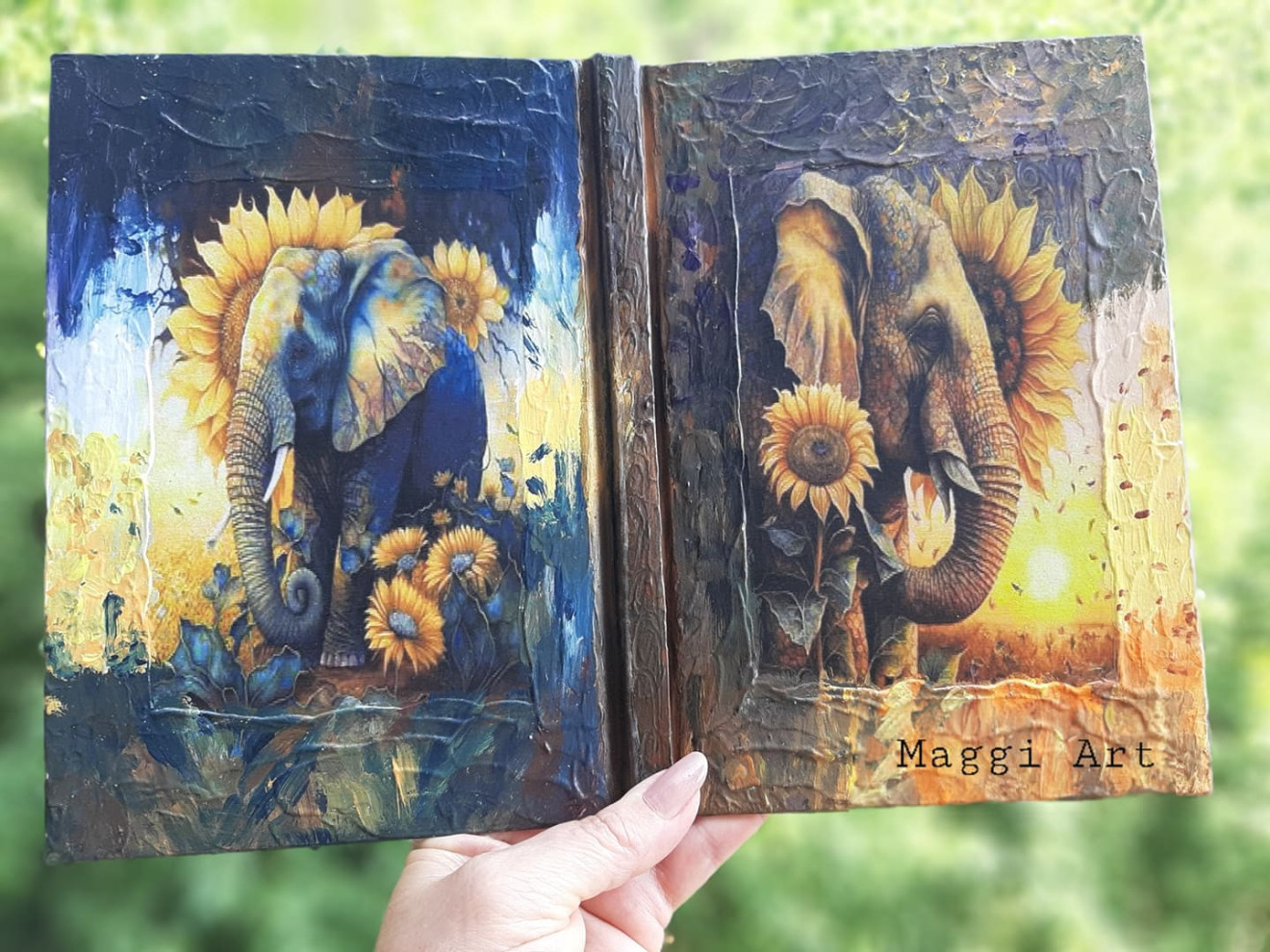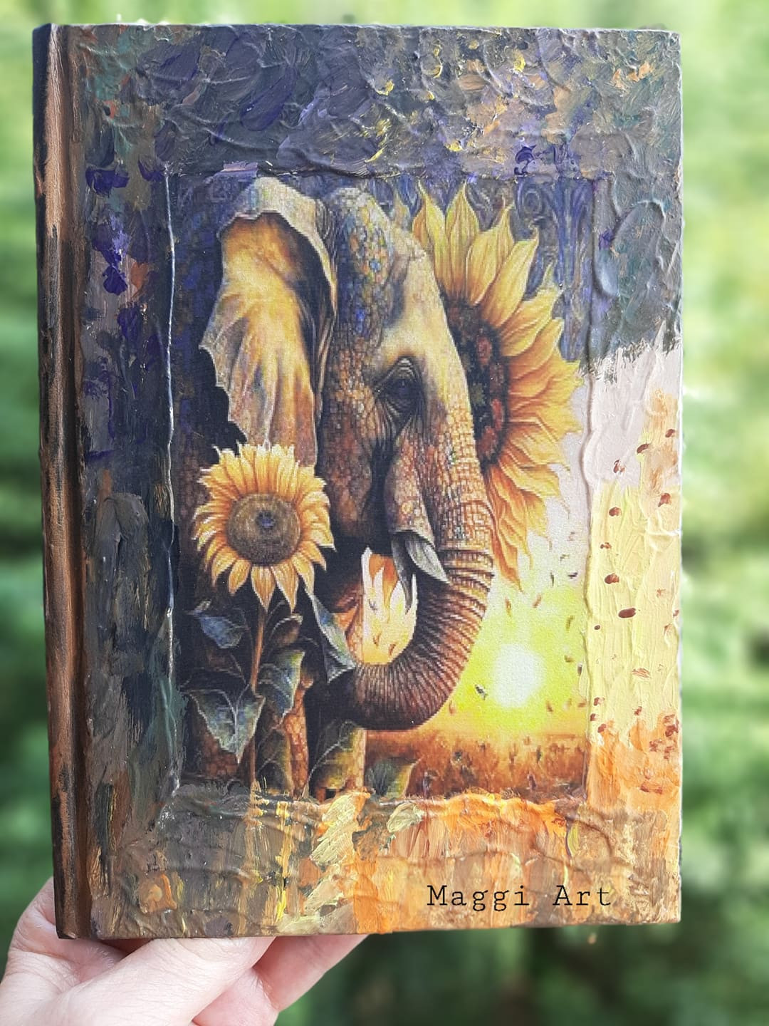 ? Слънчогледът е сред най-очарователните и вдъхновяващи цветя, на които имаме щастието да се радваме. Символиката му се свързва със слънчево настроение, заради способността на това цвете да ни провокира да се усмихваме, да се изпълваме и да излъчваме жизнерадостно настроени. ? ?☀️ ?Слонът е символ на мъдрост и сила. Те са древни символи и важни елементи в културата на много Азиатски страни. ?? ?? Това е и символиката в новият ми ръчно декориран тефтер-дневник. Усмихни се и бъди мъдър и силен! ? ?? Декориран тефтер-дневник изработен с техника-художествен декупаж. Използвала съм акрилни бои,структурни и вакс пасти,контури и лак за устойчивост. Тефтерът е с размер А5 и има 200 луксозни страници за писане.