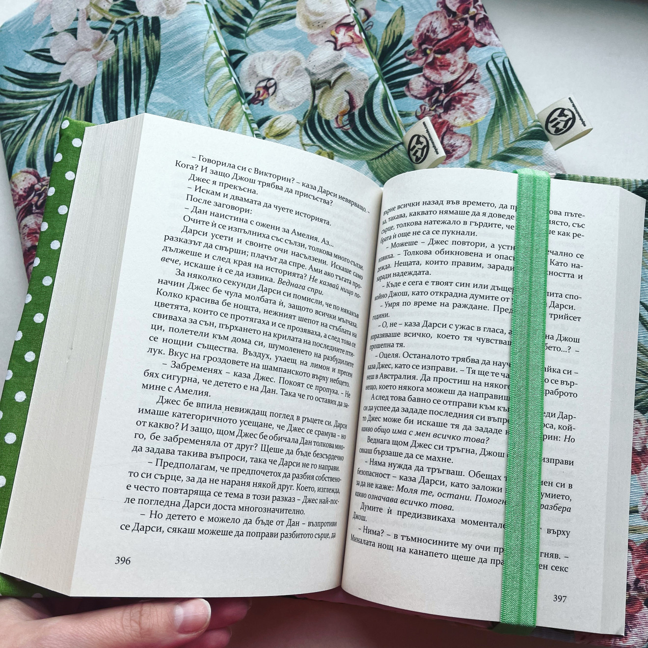 Ръчно изработена текстилна подвързия за книга с регулируем размер. Външна част от хидрофобиран плат, който не задържа вода и петна; и вътрешна част от капитонирана вата за повече мекота и практичност. С ластик за регулиранена размера, който може да използвате и като книгоразделител.