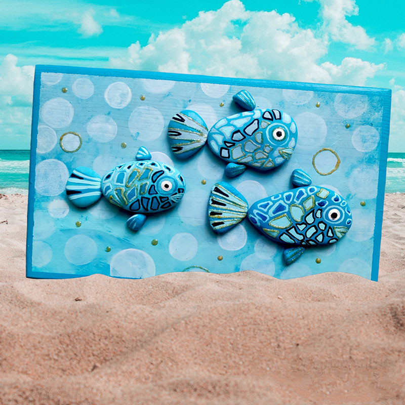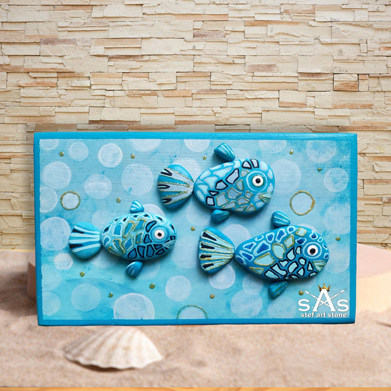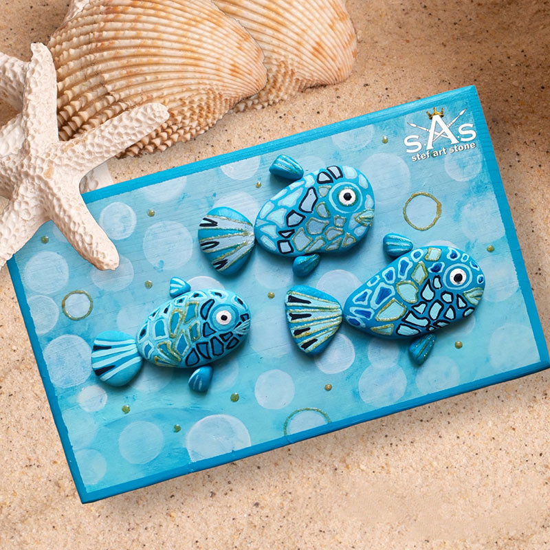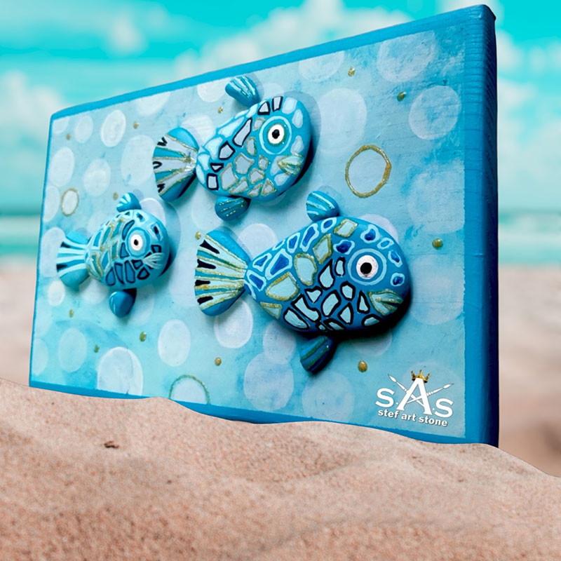 Картина с рисувани камъни - изобразяващи игриви морски рибки. Създадена с внимание към детайлите, тази картина ще внесе уникално усещане за морето във всяко помещение. • Фонът в тюркуазено-син цвят създава атмосфера на спокойствие и свежест. Изработена върху основа от висококачествено дърво, тази картина се отличава със здравина и елегантност. • Ярките акрилни бои добавят живост и дълбочина на изображението. С размери 25/15 см, тя е подходяща за окачване във всяко помещение - от спалнята до хола. • Основата на Картина с Риби - морски камъни е дърво с дебелина 2 см, защитена и обработена допълнително, за да устои на времето. • Използвани са висококачествени акрилни бои на водна основа, което ги прави напълно безвредни. За максимална устойчивост на боите е използвано защитно покритие, което позволява и почистване с хладка вода. • Картина с Риби - морски камъни 25х15 ще пристигне при вас готова за окачване и в кутия, която я прави много удобна за подходящо декориране като подарък , както и за безопасно транспортиране. • СЕРТИФИКАТ за автентичност от автора. • Изпращането е с куриерска фирма Еконт • Плащането с наложен платеж при получаването. / с опция преглед / • За бърза поръчка телефон: 0876 668603