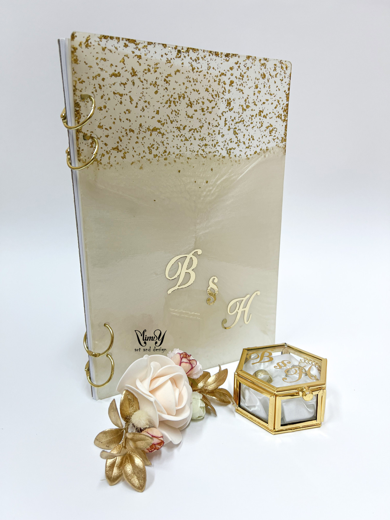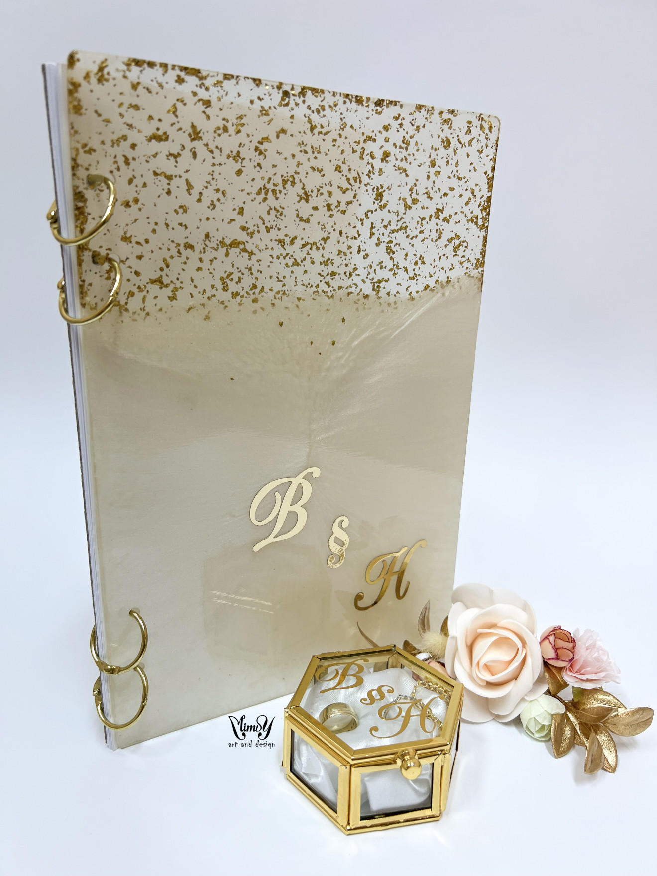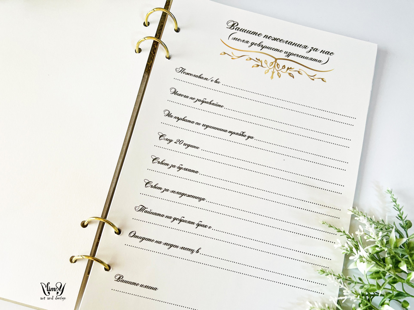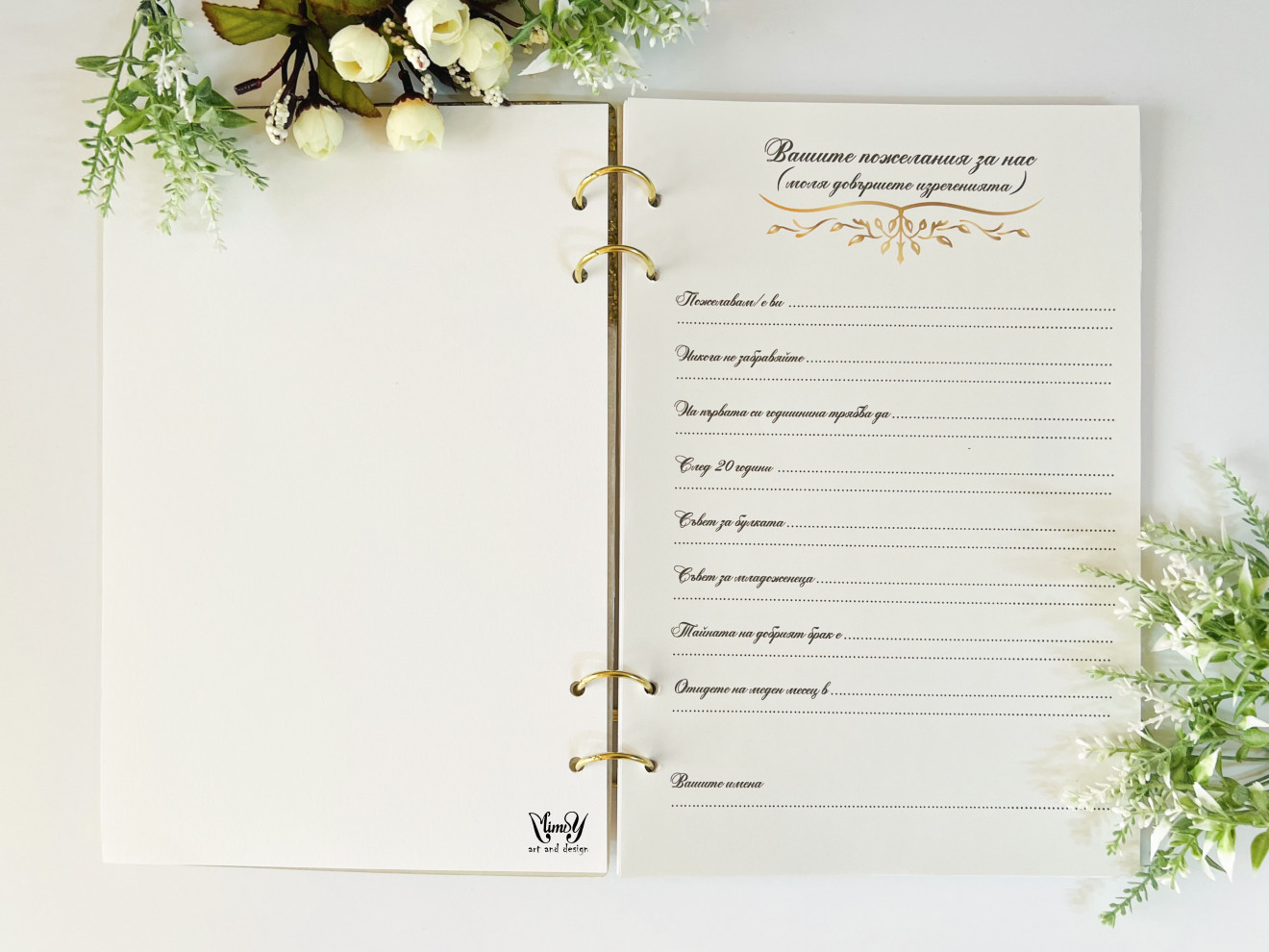 Сватбен албум с персонализирана луксозна корица и текс по избор. Съдържа 50 бр. листа с едностранен печат на вашите въпроси.