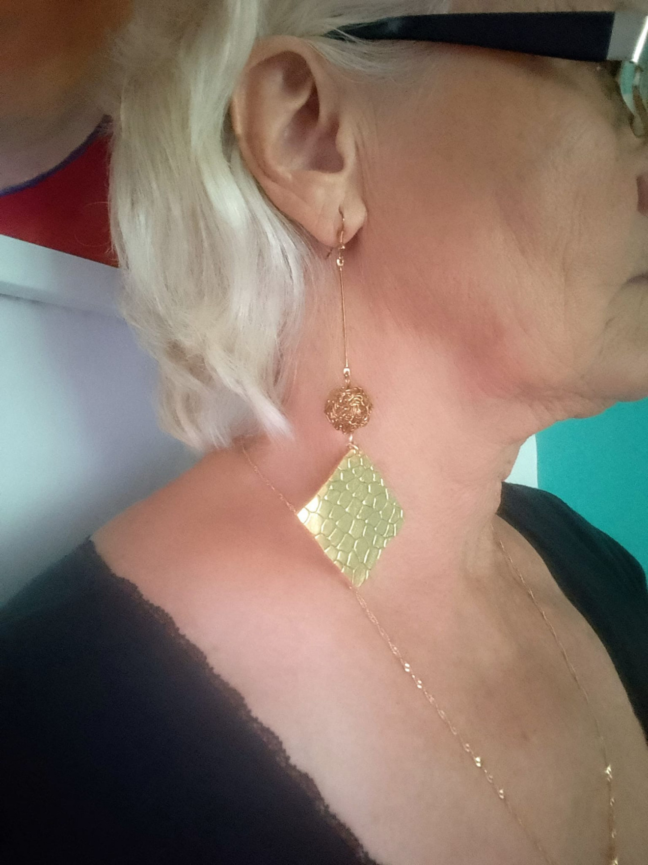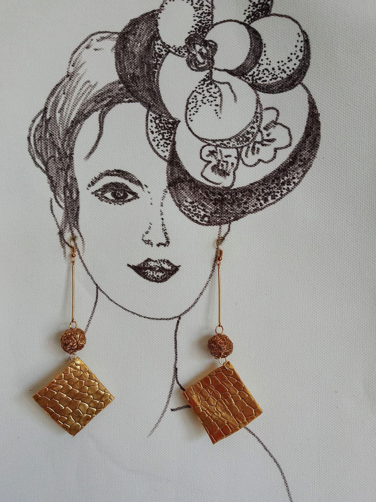 Златисти обици от естествена кожа. Метални елементи в цвят старо злато. Дължина на обицата: 12,5 см. Размер на кожения квадрат: 3,5/3,5 см.