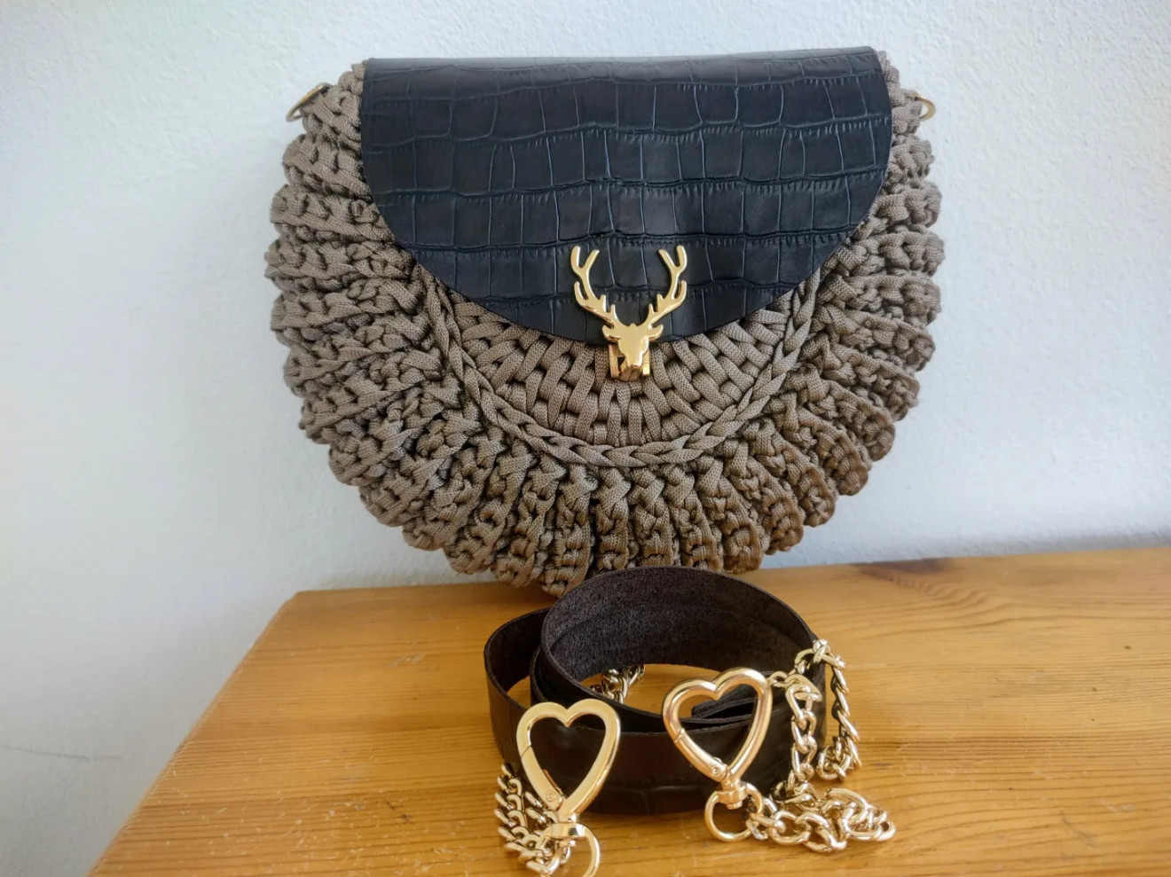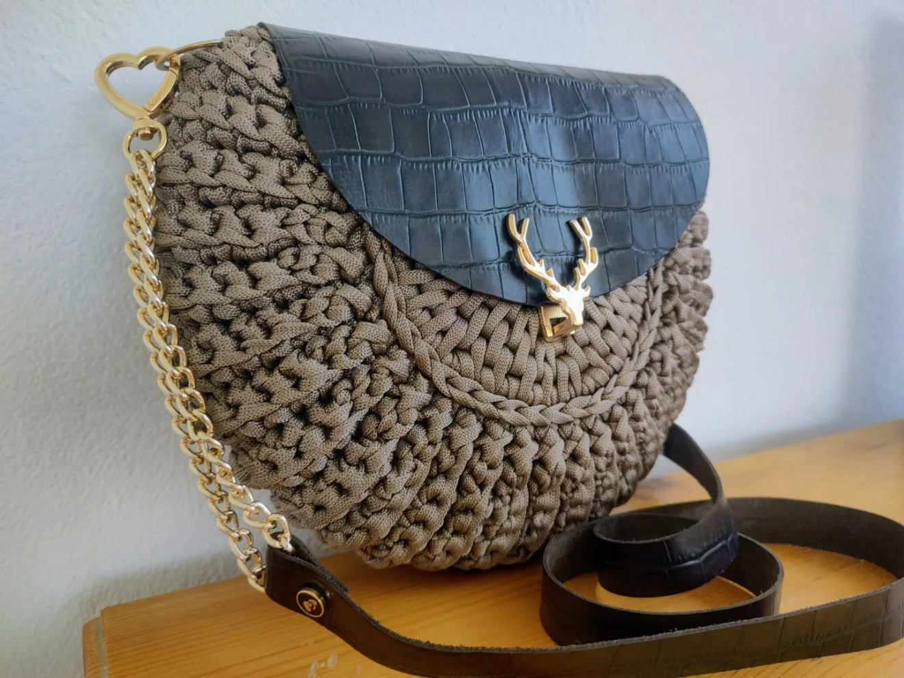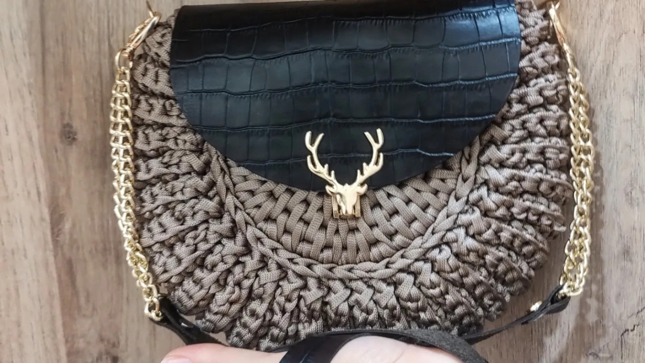 Комбинация от полиестерно макраме с лъскава нишка и естествена кожа в тъмно кафяво с златисти метални елементи