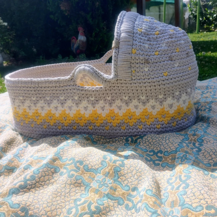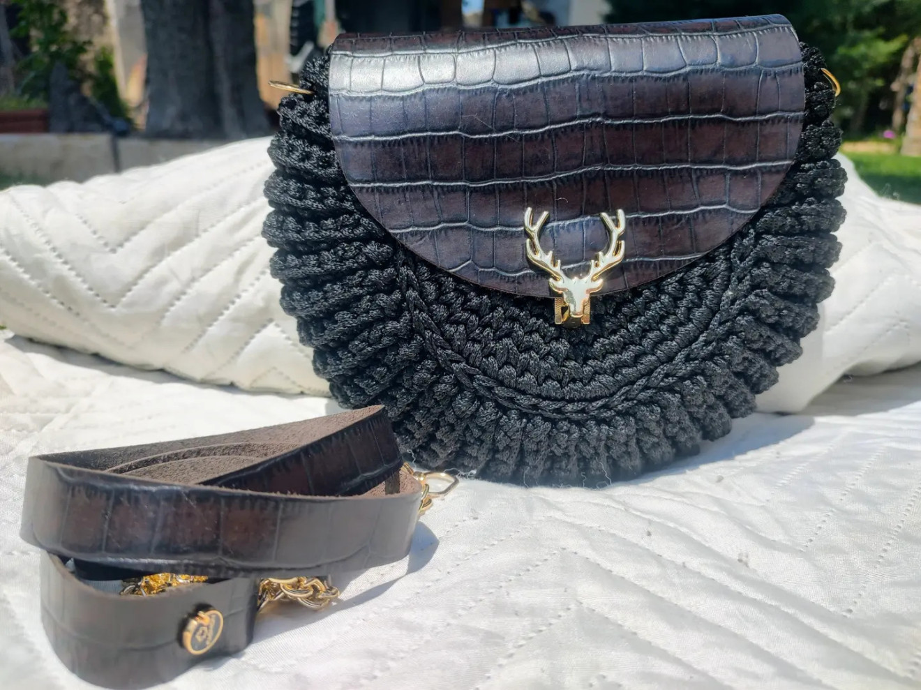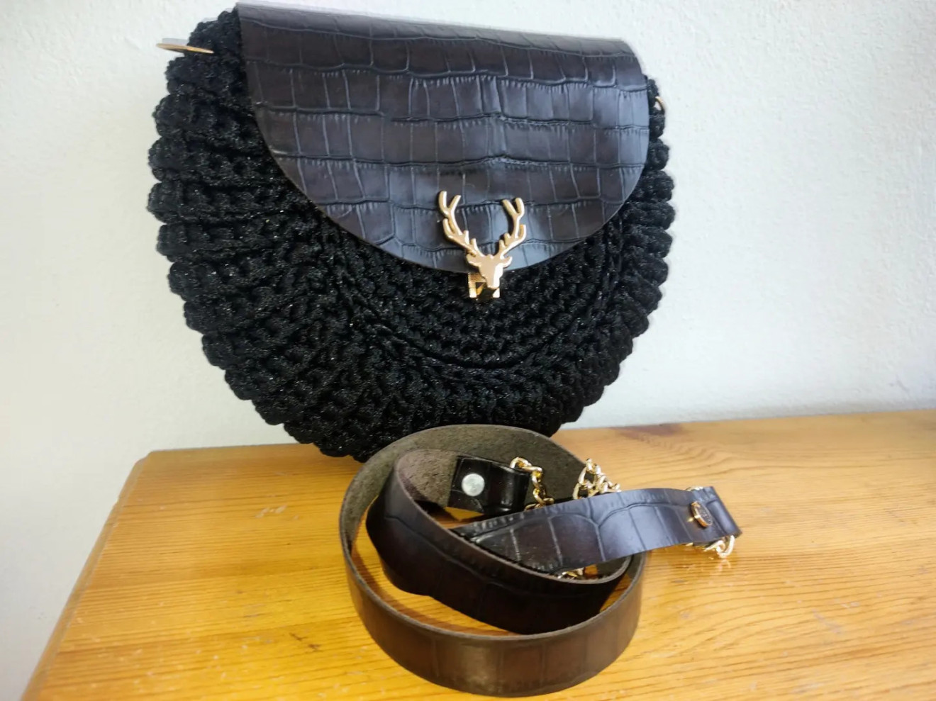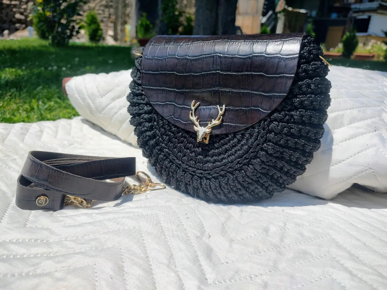 Комбинация от полиестерно макраме с лъскава нишка и естествена кожа в тъмно кафяво с златисти метални елементи