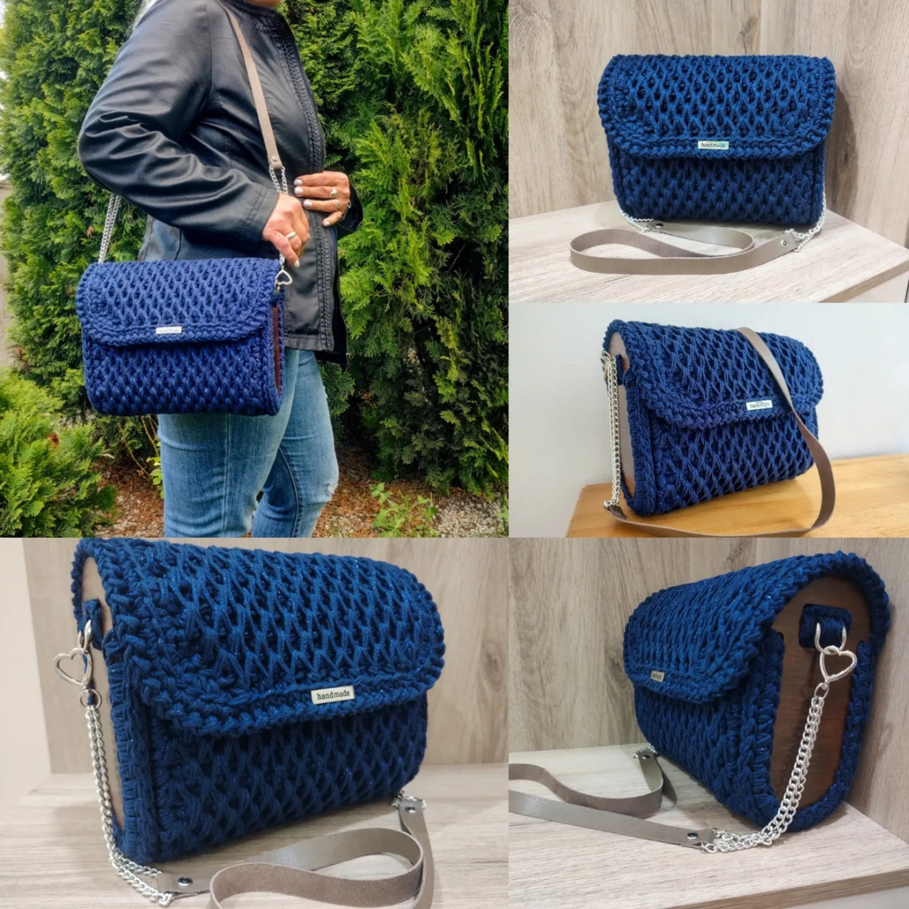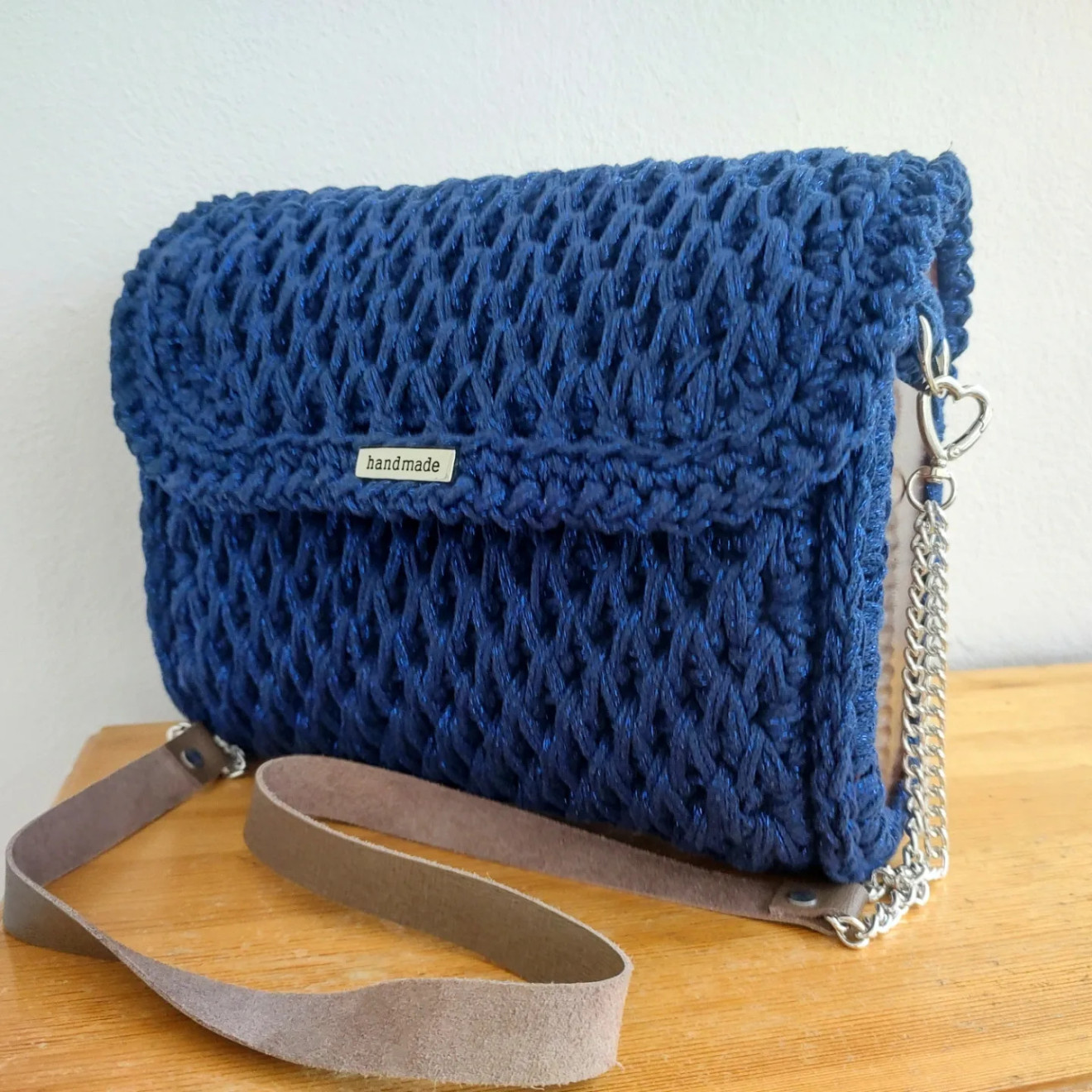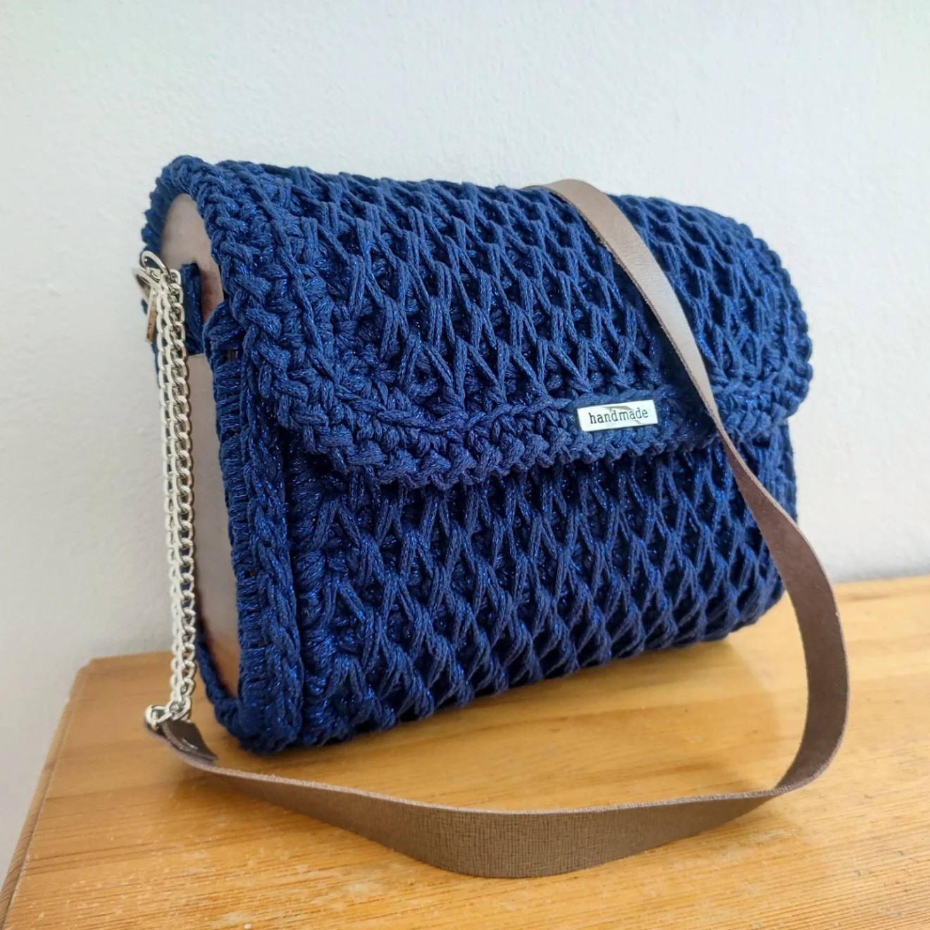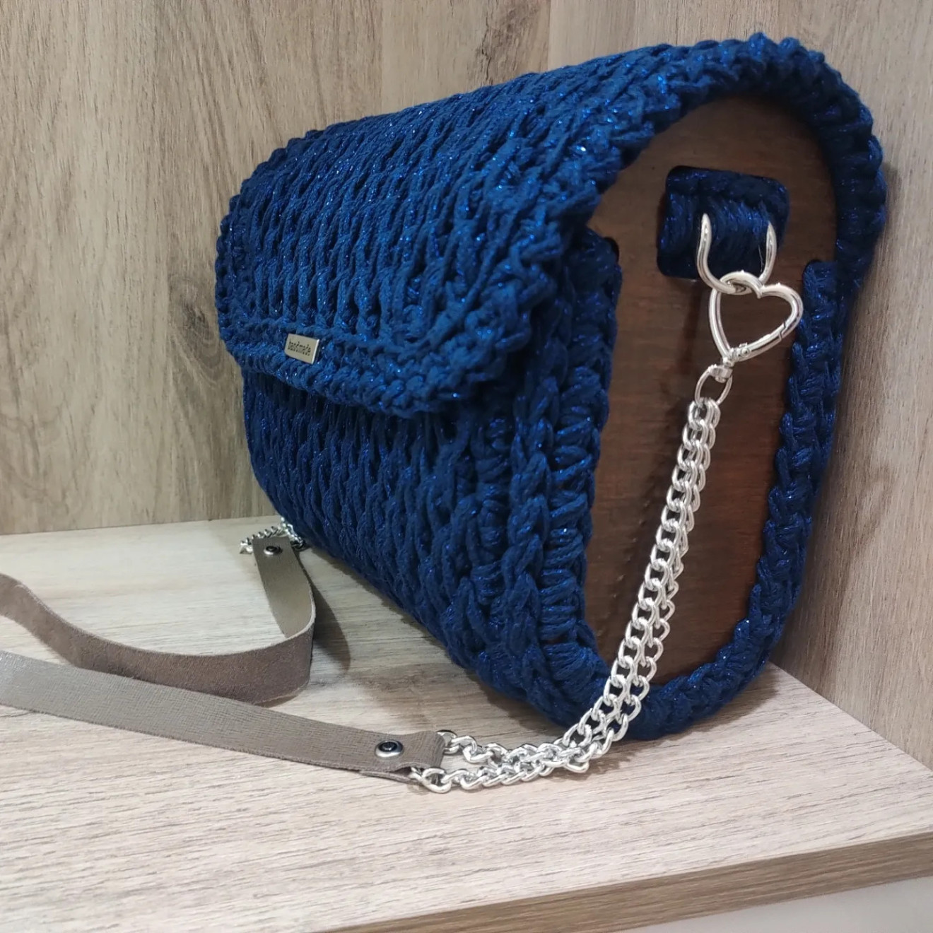 Плетена чанта с дръжка за през рамо от естествена кожа и в комбинация с синджир, памучно макраме с ламе в тъмно синьо, затваряне -магнитни копчета