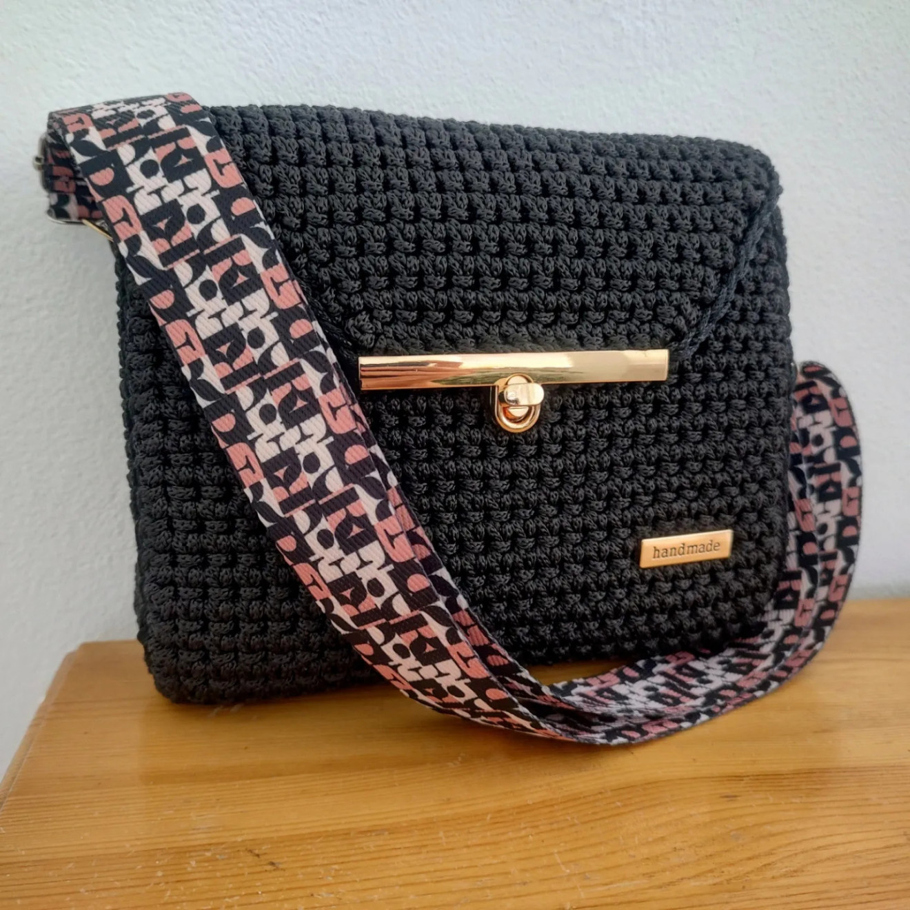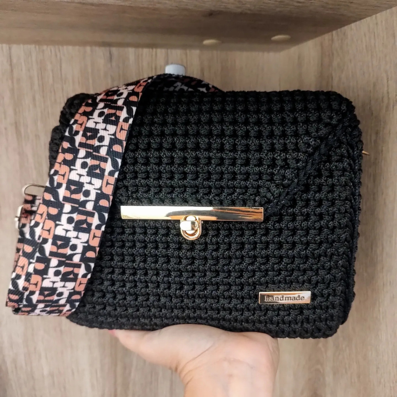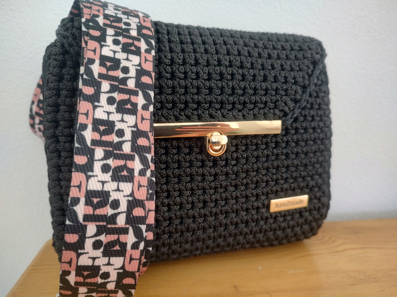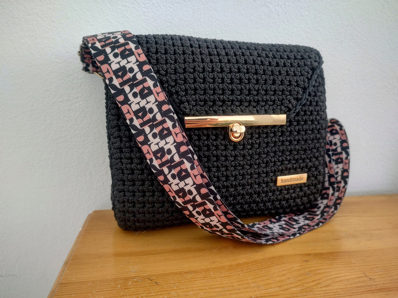 Полиестерно макраме в комбинация с златисти метални елементи и текстилна дръжка за през рамо