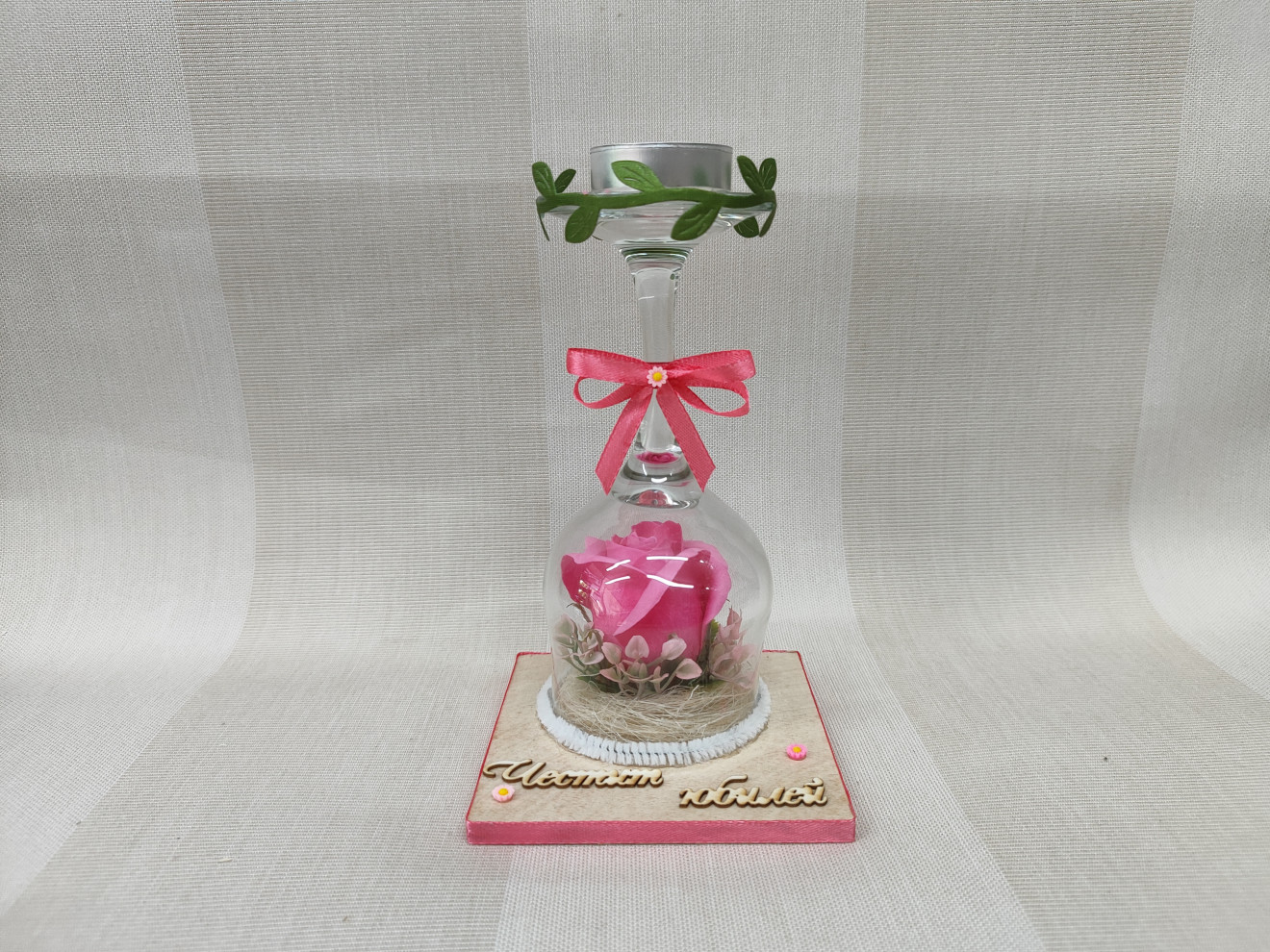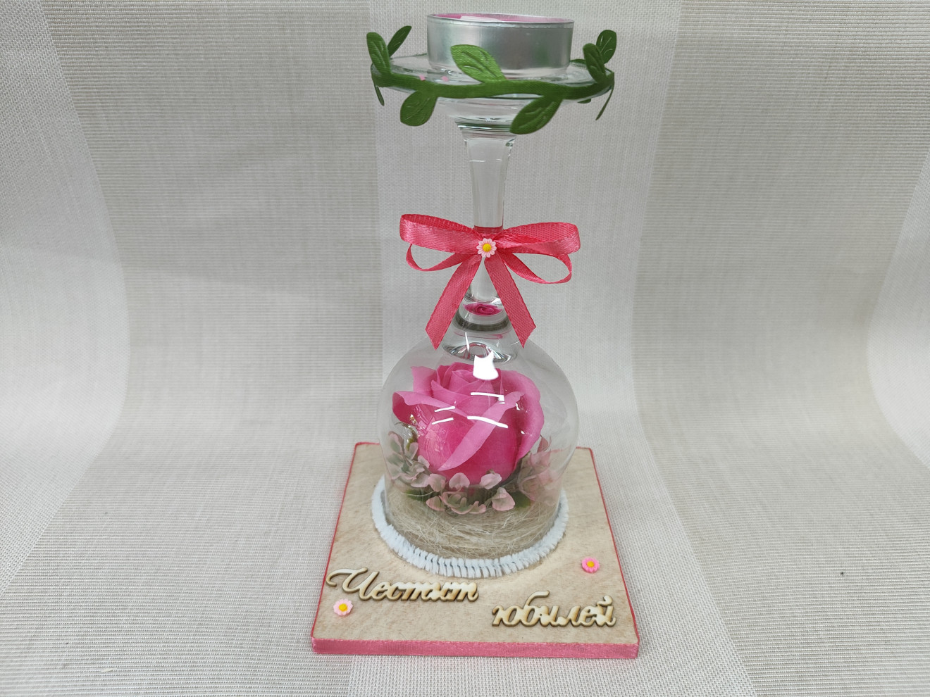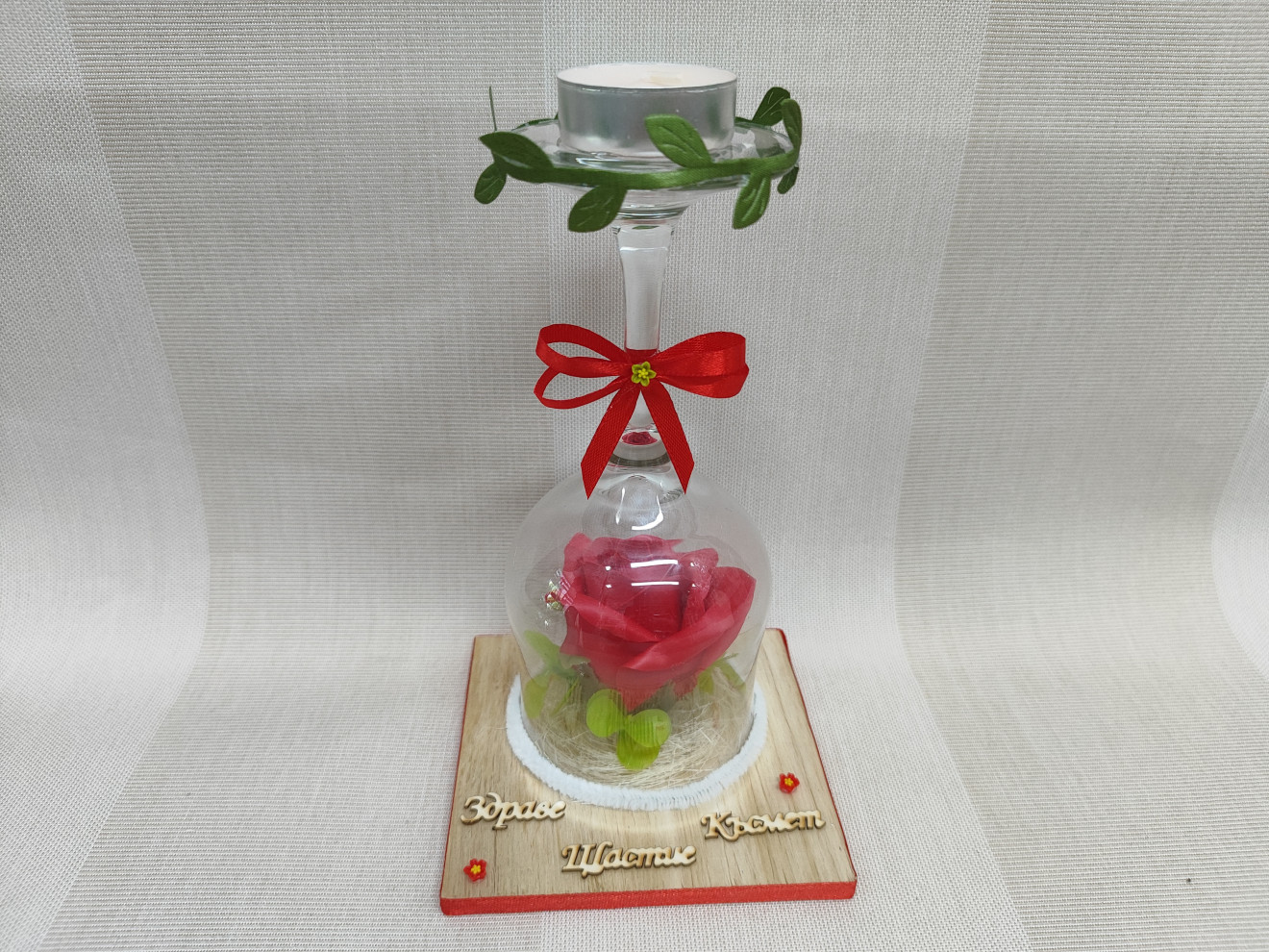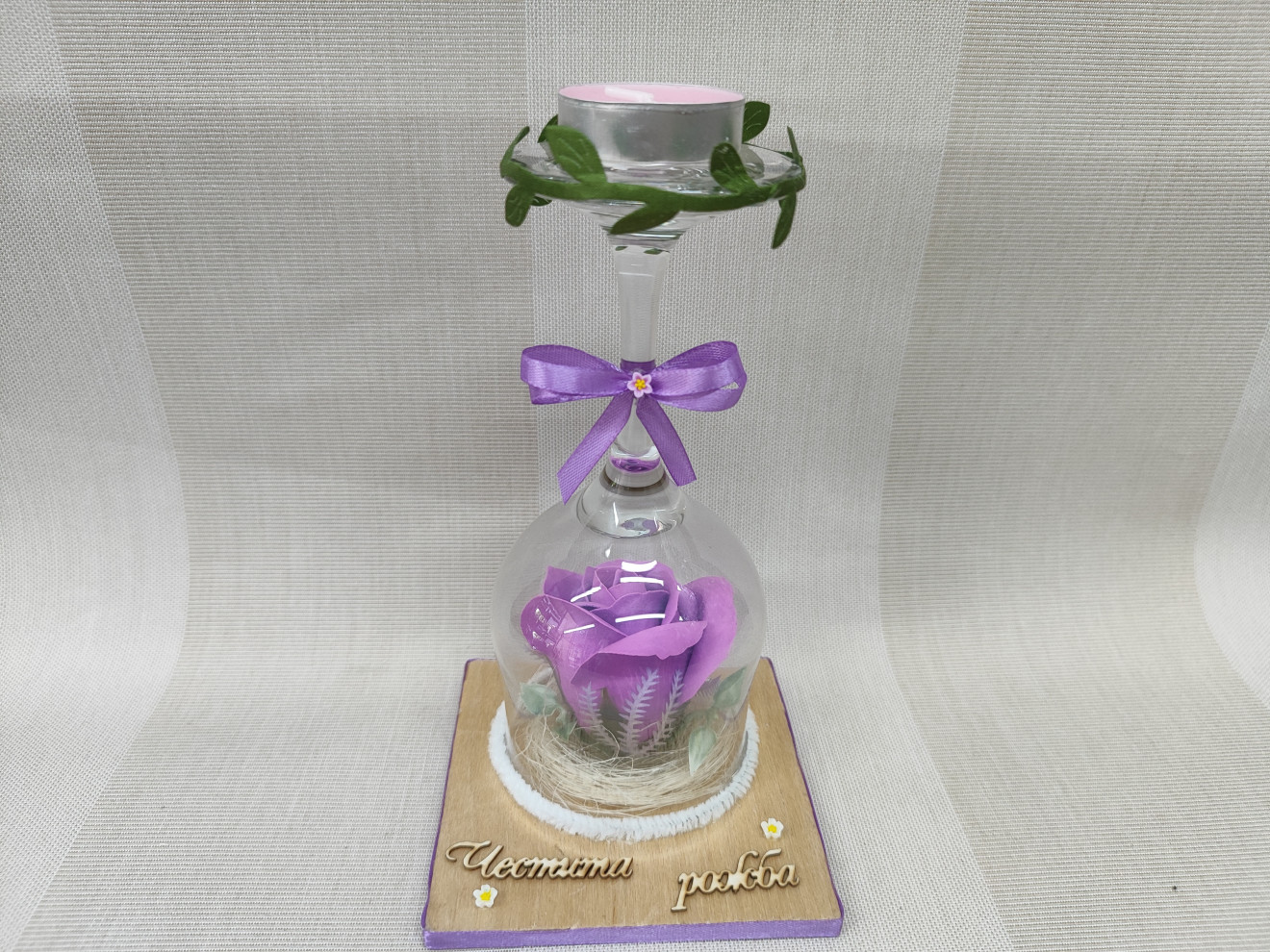 Свещник със сапунена роза.Текстът е по желание според повода. размери: 10смх10см височина:16см цена 11лв.