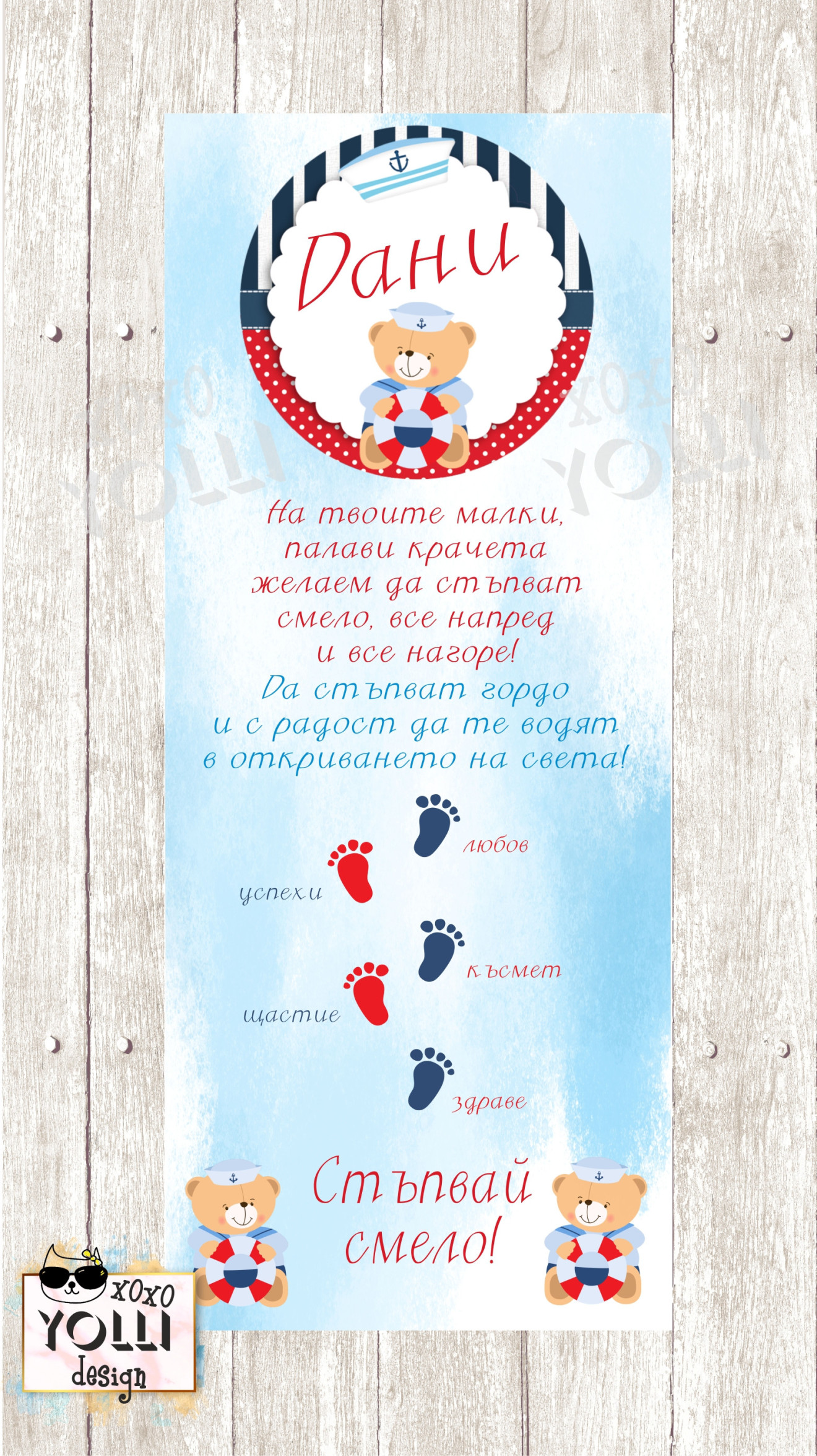 Прохождането на детето безспорно е един от на-чаканите и вълнуващи моменти. Затова трябва да бъде удостоен с красиво платно, по което детето да мине, за да стигне до наредените предмети, наречени с професии. Платната се отпечатват на винил с размер 120/50 см. Цветът и дизайнът на надписите е по ваш избор. Моля, напишете в коментар при поръчката името на детенцето. Стандартното време за изработка е 1-2 работни дни. При желание от ваша страна да бъде изпратено в същия ден + 3 лв към основната цена. Като можете да ни уведомите в коментар към поръчката, че искате експресна поръчка.