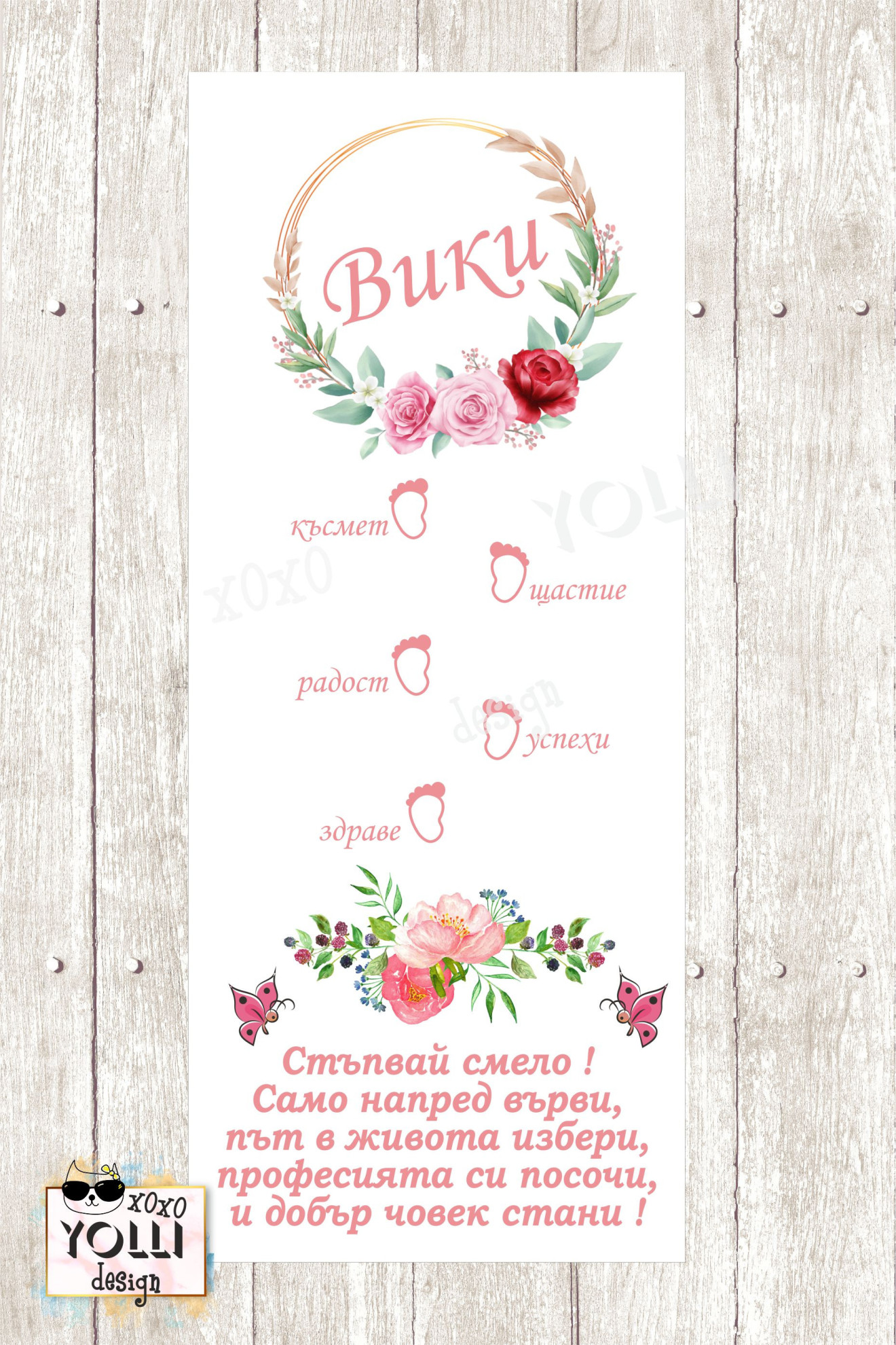 Прохождането на детето безспорно е един от на-чаканите и вълнуващи моменти. Затова трябва да бъде удостоен с красиво платно, по което детето да мине, за да стигне до наредените предмети, наречени с професии. Платната се отпечатват на винил с размер 120/50 см. Цветът и дизайнът на надписите е по ваш избор. Моля, напишете в коментар при поръчката името на детенцето. Стандартното време за изработка е 1-2 работни дни. При желание от ваша страна да бъде изпратено в същия ден + 3 лв към основната цена. Като можете да ни уведомите в коментар към поръчката, че искате експресна поръчка.