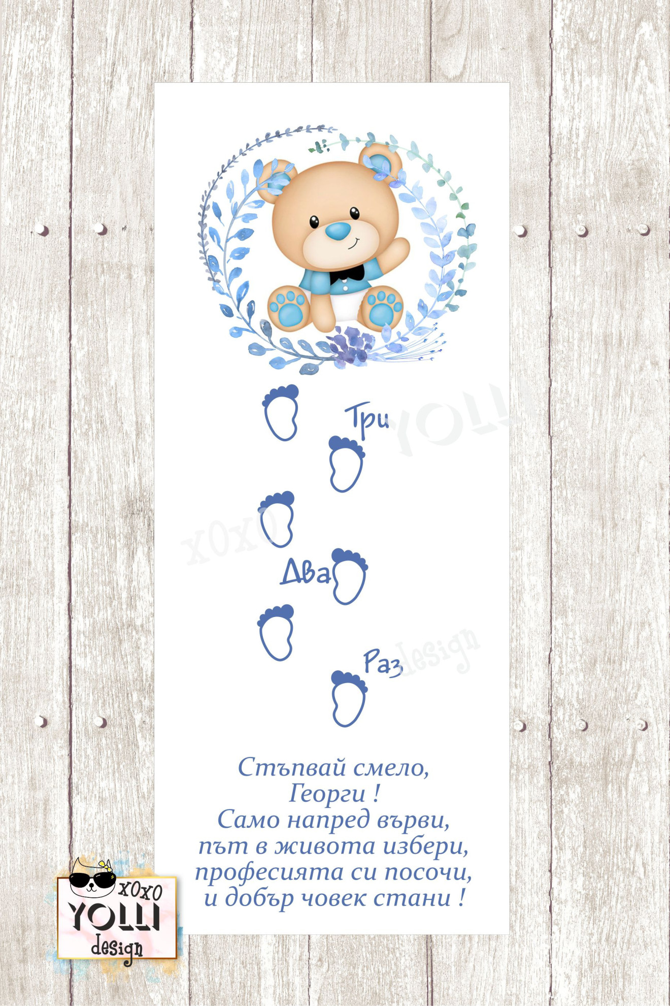 Прохождането на детето безспорно е един от на-чаканите и вълнуващи моменти. Затова трябва да бъде удостоен с красиво платно, по което детето да мине, за да стигне до наредените предмети, наречени с професии. Платната се отпечатват на винил с размер 120/50 см. Цветът и дизайнът на надписите е по ваш избор. Моля, напишете в коментар при поръчката името на детенцето. Стандартното време за изработка е 1-2 работни дни. При желание от ваша страна да бъде изпратено в същия ден + 3 лв към основната цена. Като можете да ни уведомите в коментар към поръчката, че искате експресна поръчка.