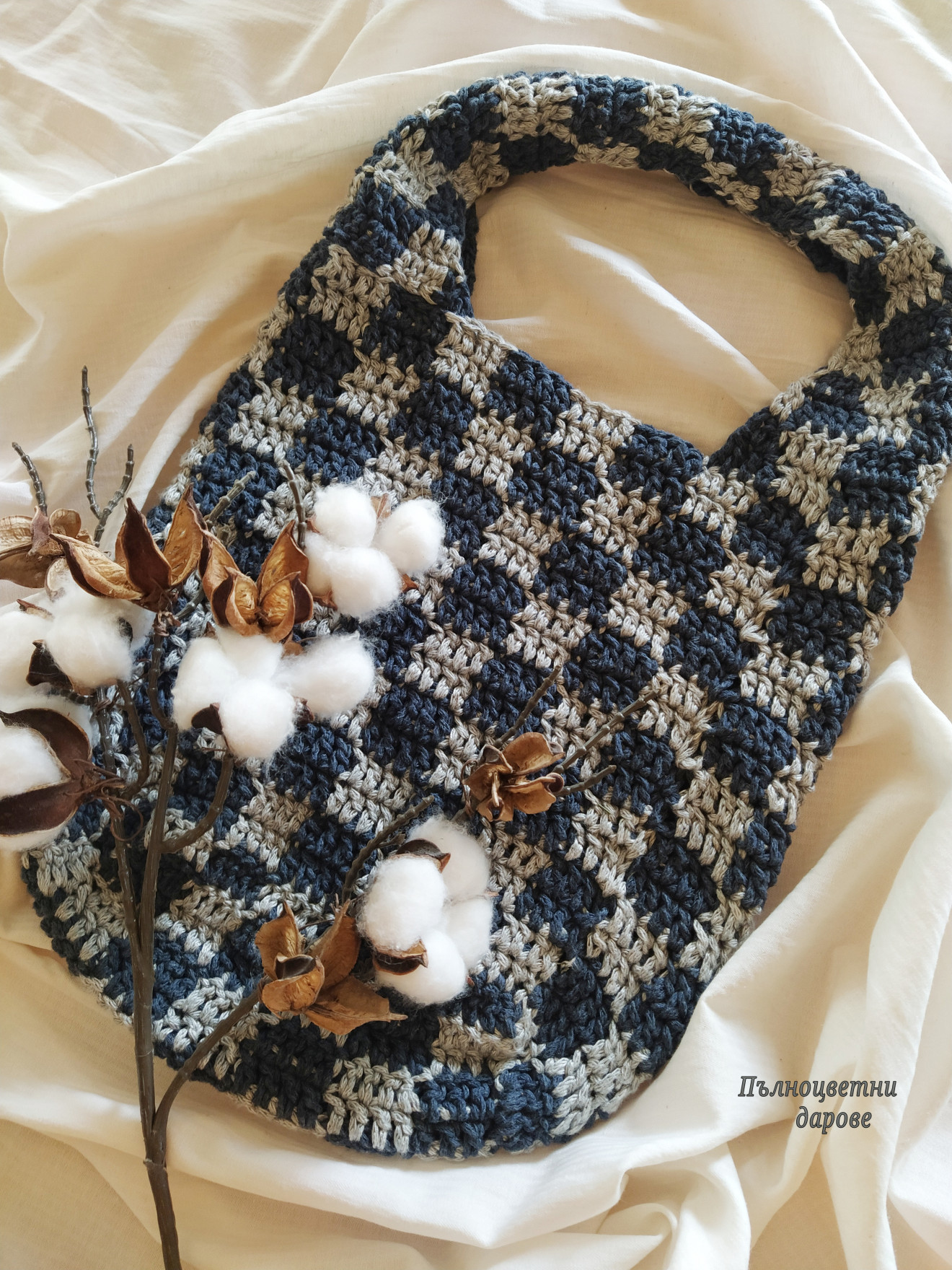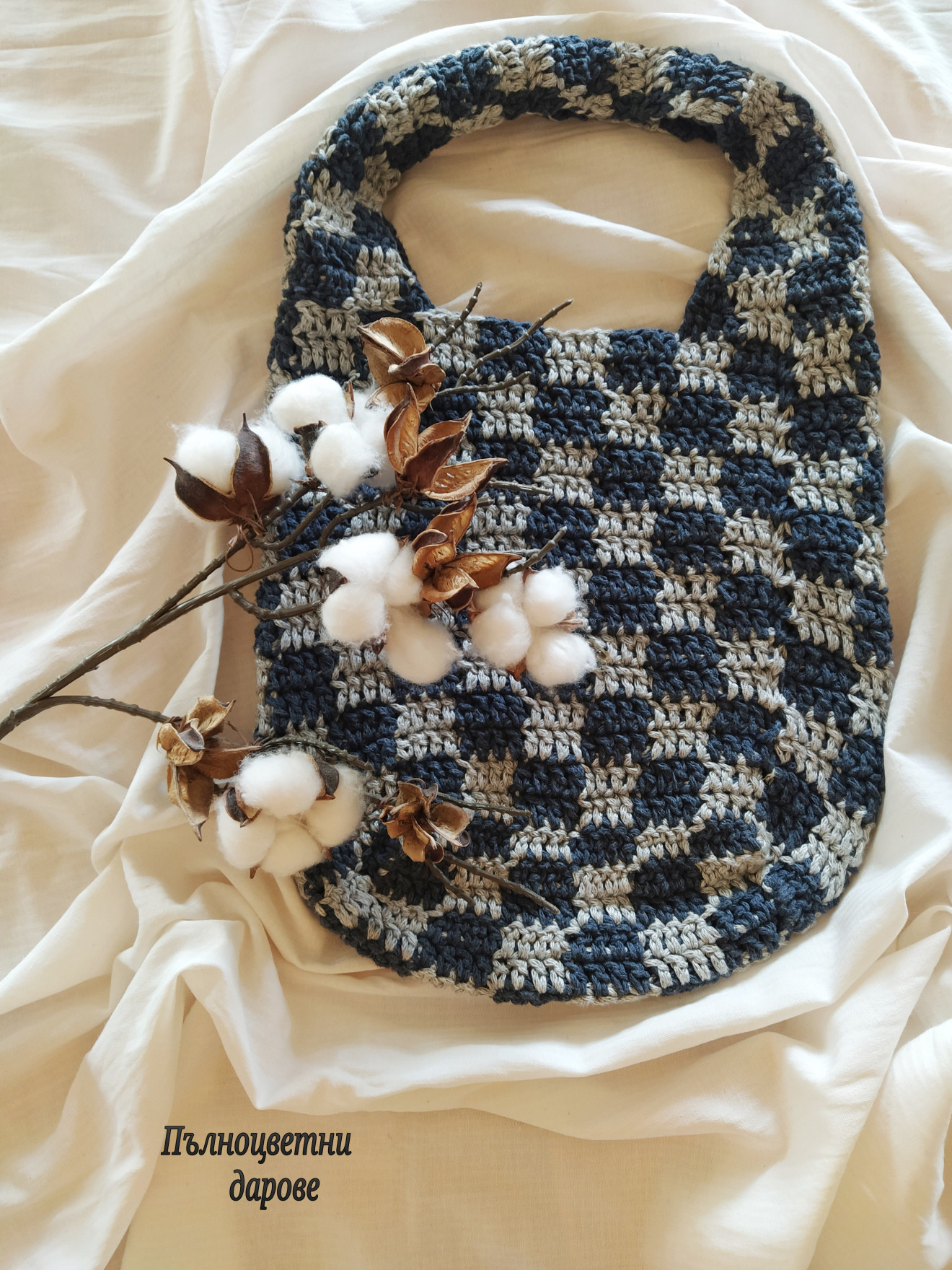 Ръчно изработена шахматна дамска чанта в два нюанса синьо. Тънко твърдо памучно въже. Чантата е изключително здрава и стегната, защото шарката изисква плетене с две нишки едновременно. Семейно проверена във времето. Използваме една, когато пътуваме извън града. Носим в нея всичката техника, когато сме на плажа. Също обувки и спортни принадлежности. И книги, разбира се. ????? Дълбочина 32 см. Ширина 30 см. Може да се добави подплата и закопчаване с магнитно копче или цип. Може да се пере в пералня. Пристига опакована в кутия с панделка и детайли за пране и поддръжка. Напишете съобщение, ако желаете друга комбинация от цветове или подобна едноцветна.
