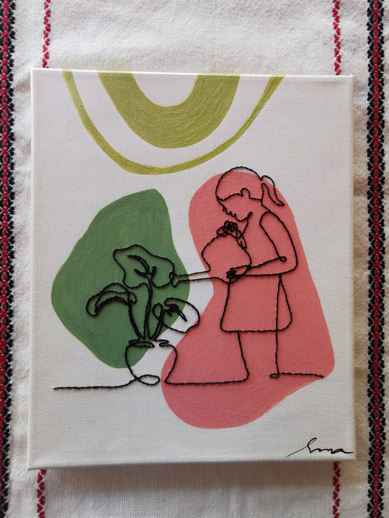 Картината е ръчно рисувана с акрилни бои, бродирана на ръка, завършена с матиращ лак за по-голяма защита от външни атмосферни влияния. Картината може да бъде изработена в различен размер, различни цветове и бродерия. Ако тази точно Ви харесва може да бъде напревена по подобен начин, но не изцяло същата.