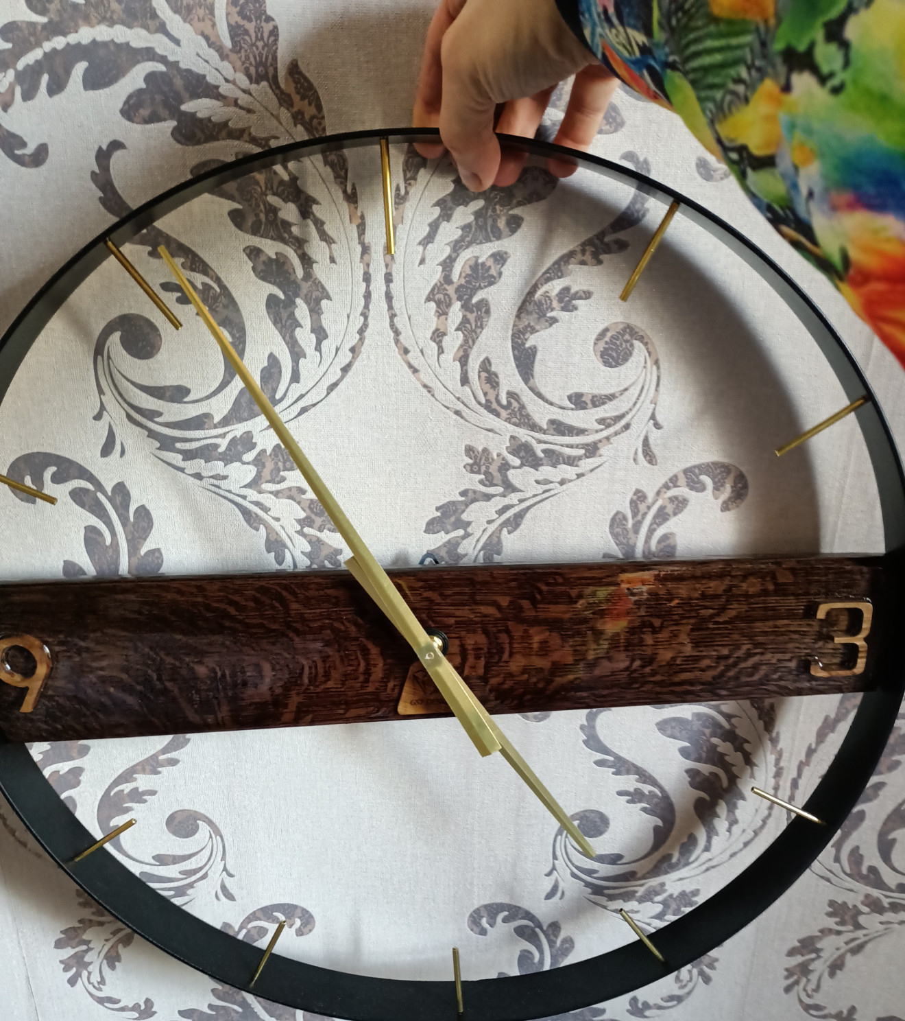 НАМАЛЕН/ Ръчна изработка На живо изглежда прекрасно и стилни/ Мой запазен дизайн Метална шина 4см. Месинг отделения цвят злато без заваряване с меден нит Стар дъб от бъчва обработен с епоксидна смола Цифри от орех Тих безшумен качествен механизъм Алуминиеви стрелки големи минават отгоре по ръба на отделенията(по поръчка може и дървени+30лв) Размер:53см-4см Скрит монтаж за стената в дървото не се вижда при окачване Цената е за големия размер 53см,може да се направи по ваш размер!