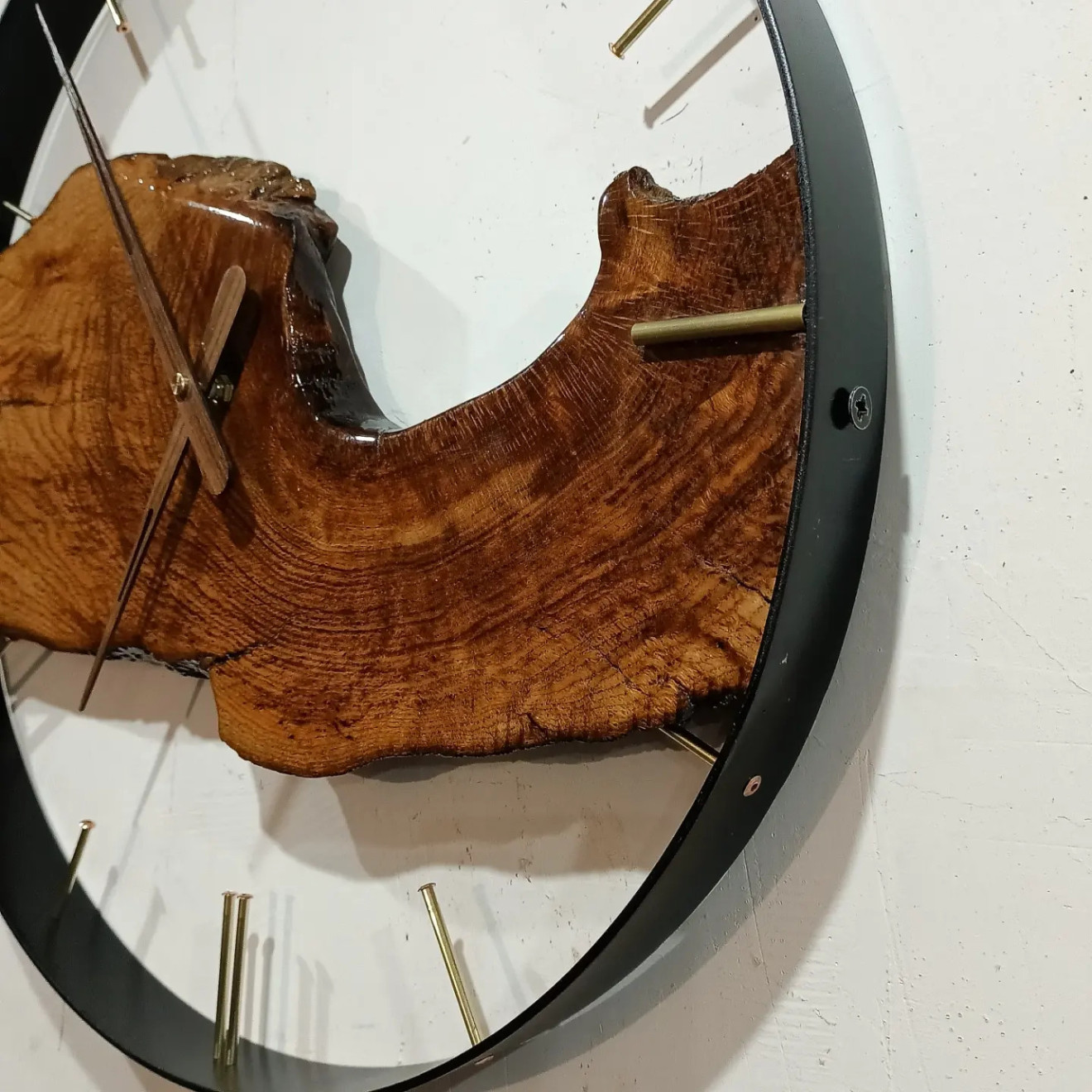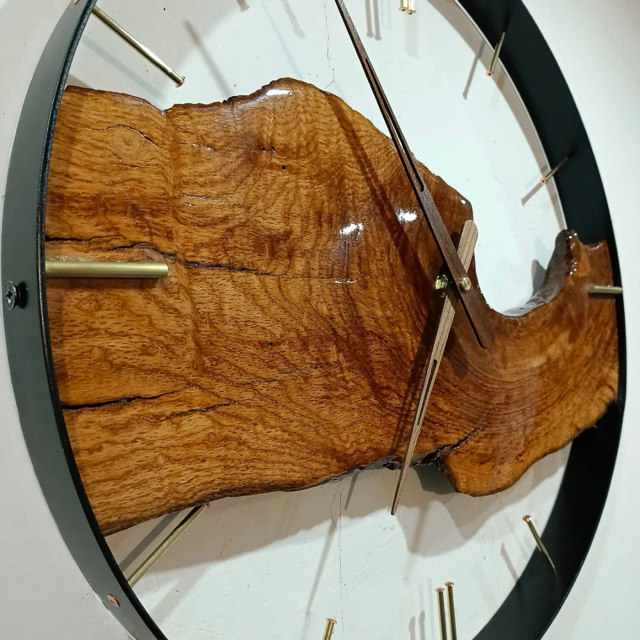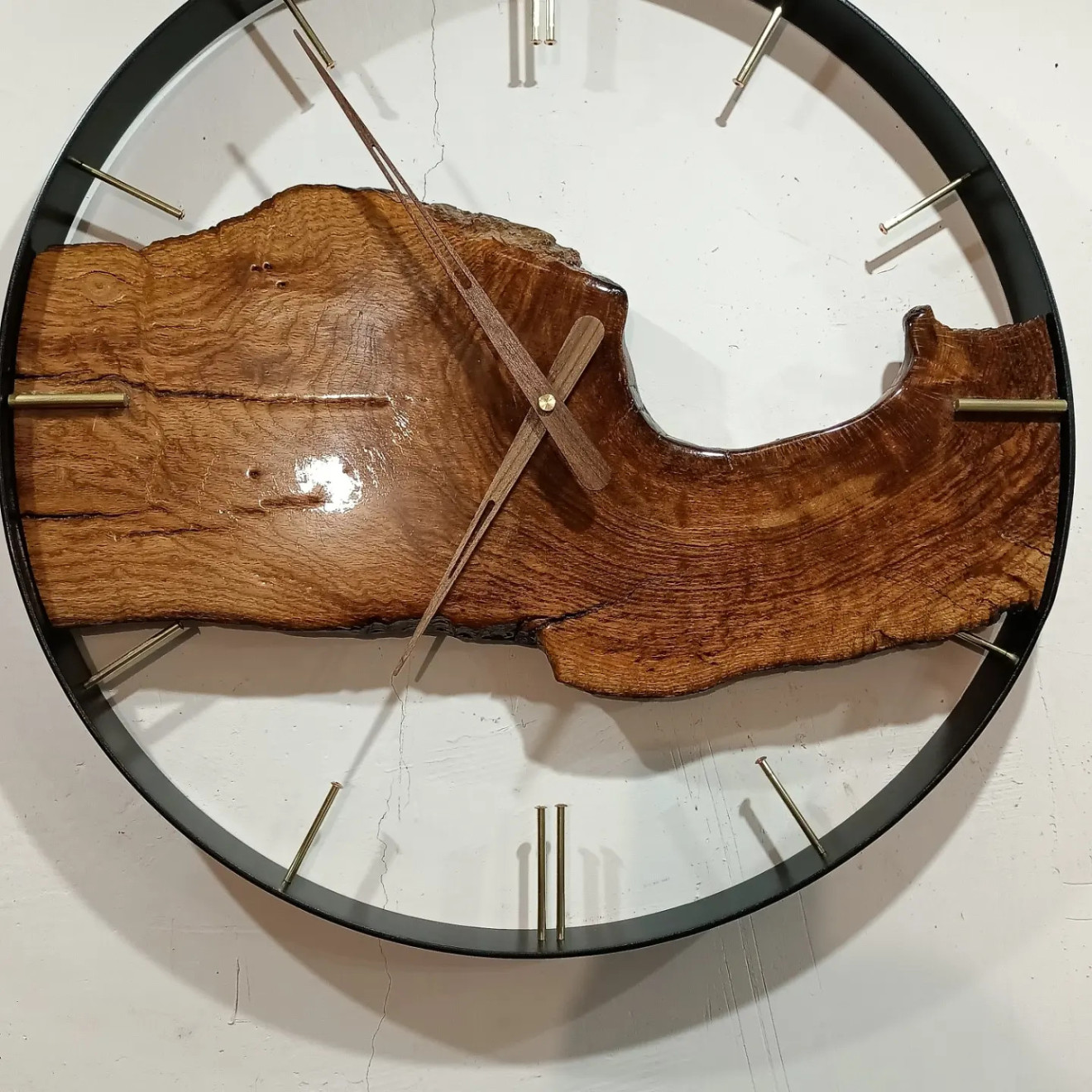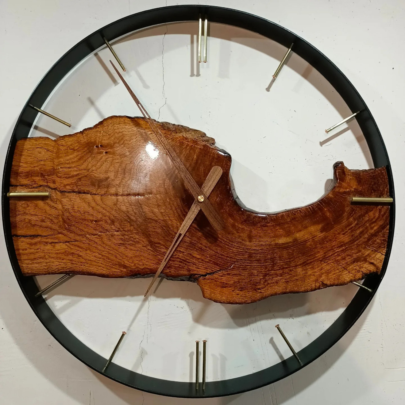 Прави се по поръчка подобен! Голям Стенен часовник Изцяло Ръчна изработка Мой запазен Дизайн Gst-Design С месинг и медни митове(месинг е полиран до цвят като злато) Метална шина 4см. Тих и плавен качествен механизъм Големи Дървени орех Стрелки,може и алуминиеви цвят злато! Рустик Дъб над 150г. Покрит с епоксидна прозрачна смола Може да се гравира нещо по ваше желание ! Може да се направи в размер по ваше желание по поръчка!Пишете ми или звънете на 0885176163-Георги Стайков