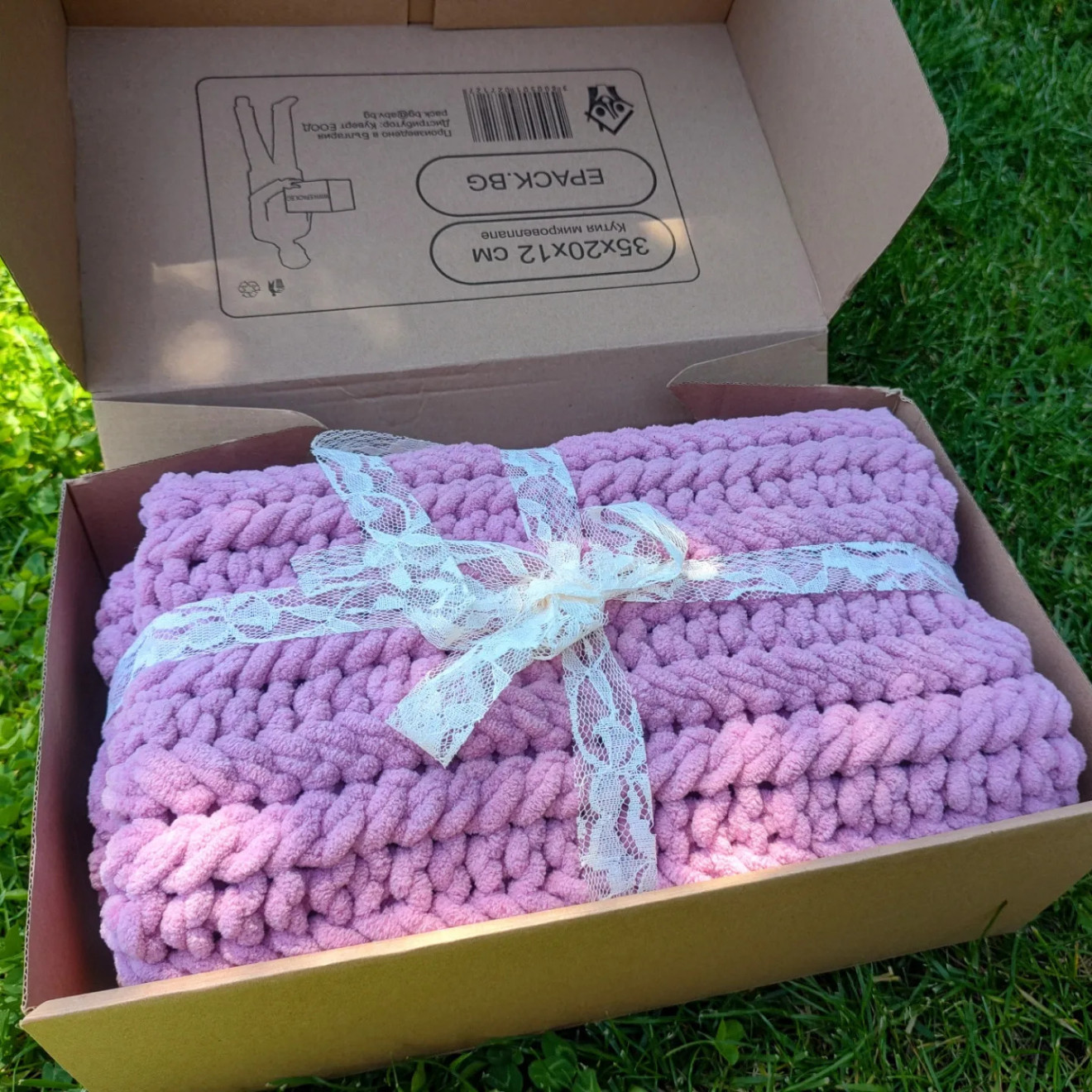 Изплетено с пръсти от мека хипоалергенна прежда Ализе пуфи файн, в цвят пепел от рози. Размер: 80 см / 100 см