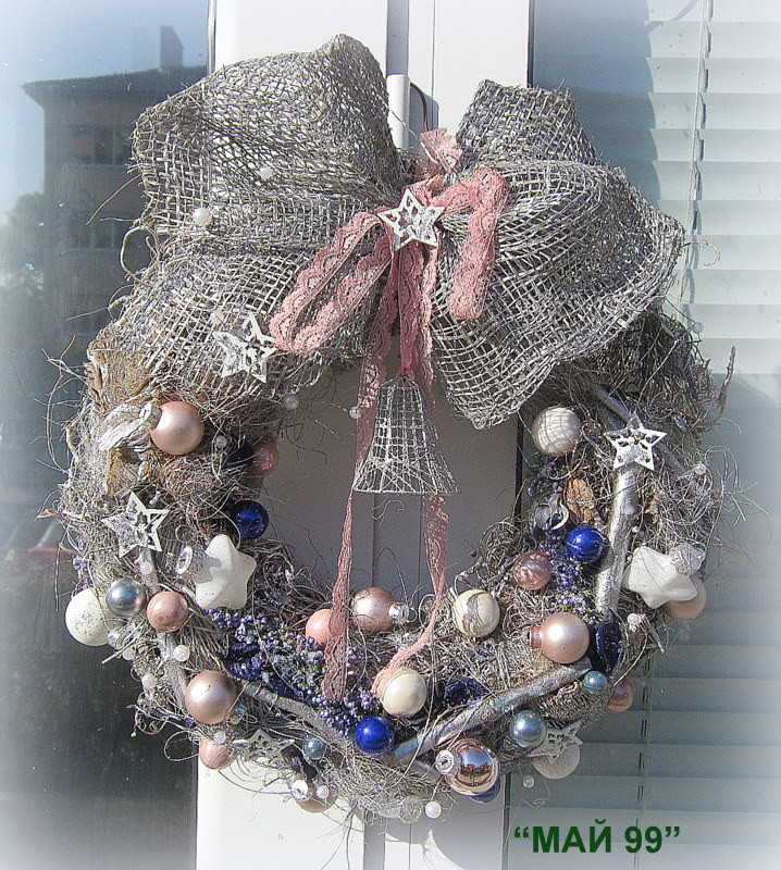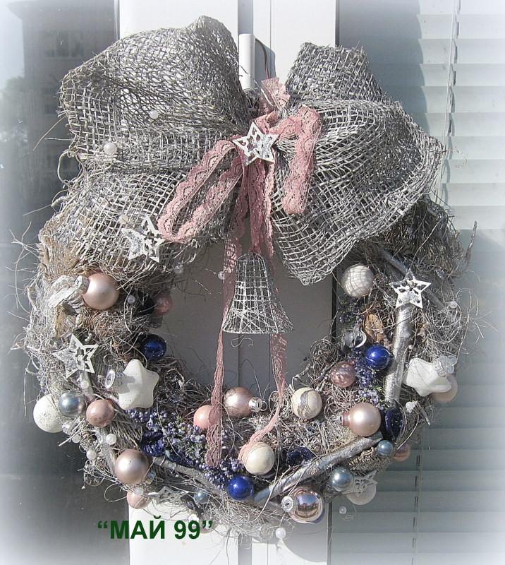 Арт коледен венец ф 35 см.от посребрени кокосови влакна,сухи и природни материали и елементи,мини коледни топки в бяло,бледо розово и лила,бели дървени звездички,сребърна панделка зебло,розова дантела и сребърна камбанка. Различен,ефектен и елегантен!