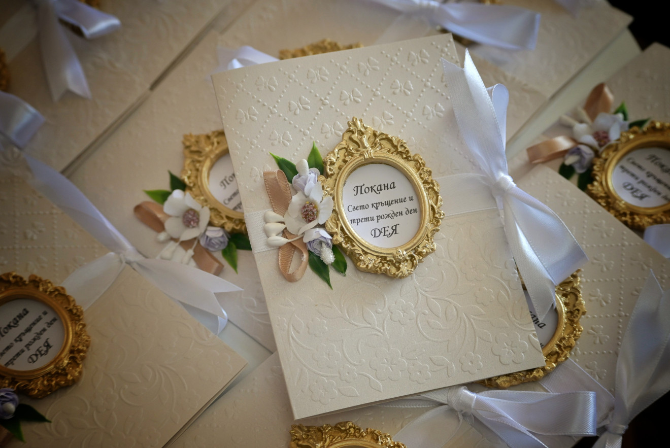 Ръчно изработени покани от перлен картон,декорирани с цветя керамични елементи