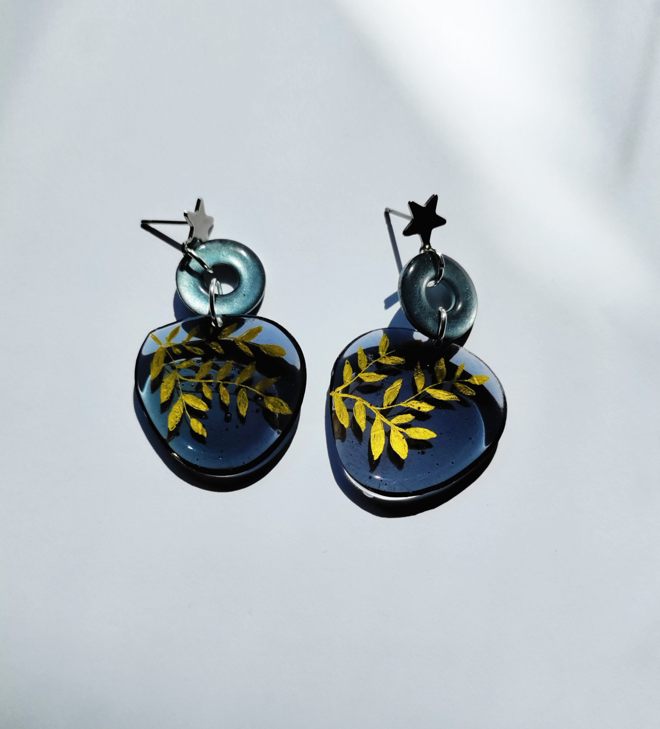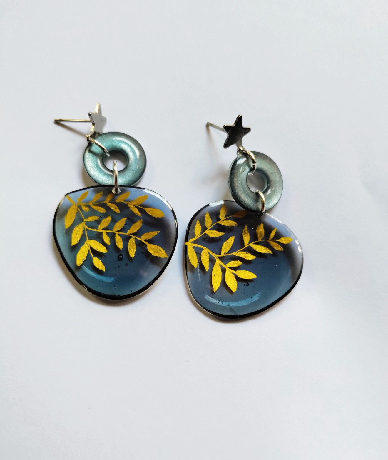 Обеци на винт от сребристи звездички, шайбички и ръчно рисувана плочка от смола. Елегантни, ефирни, в есенни нюански С подаръчна кутийка