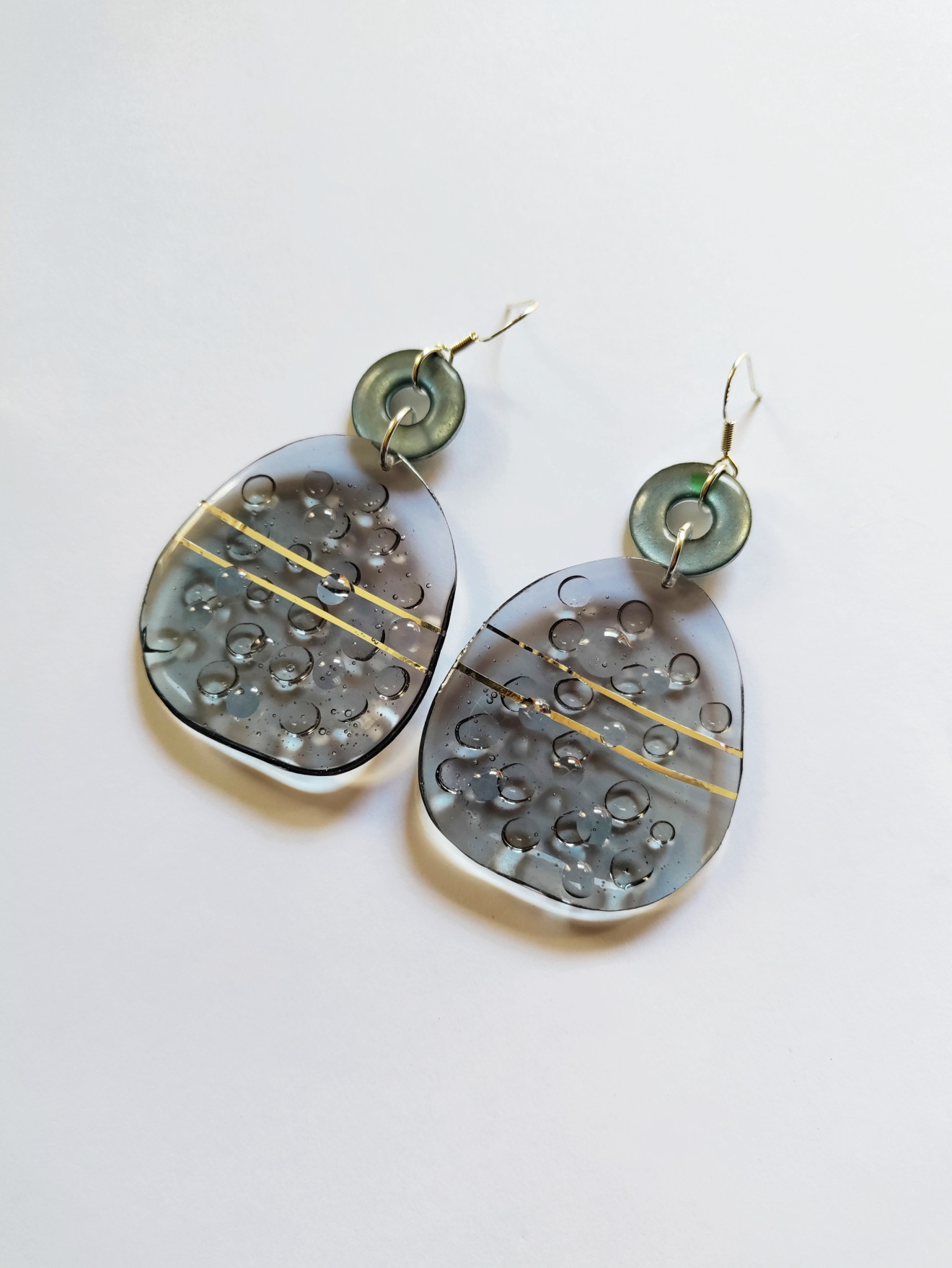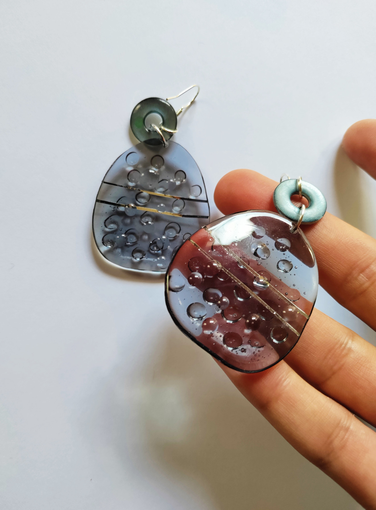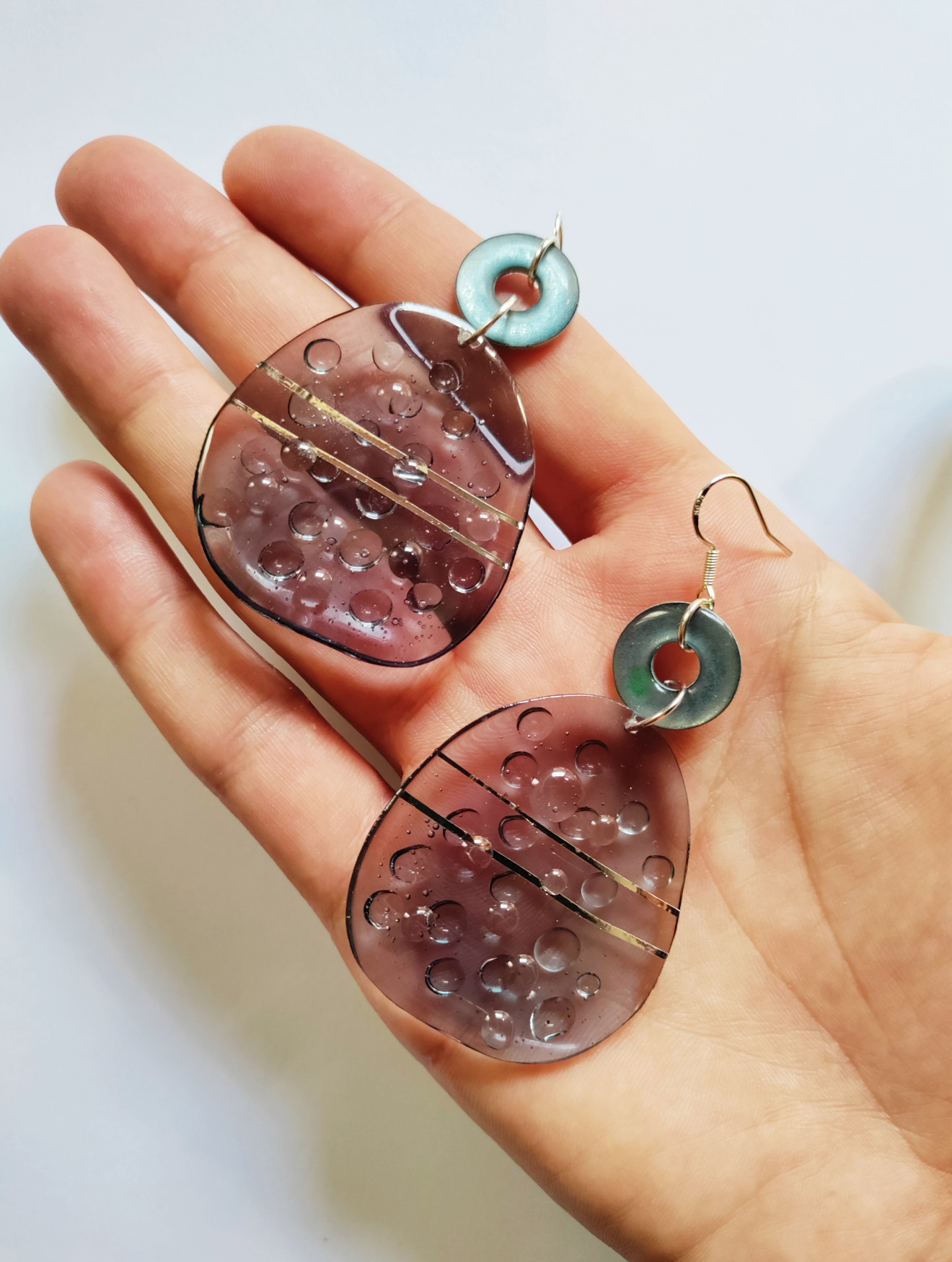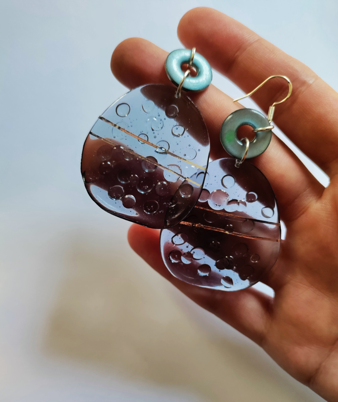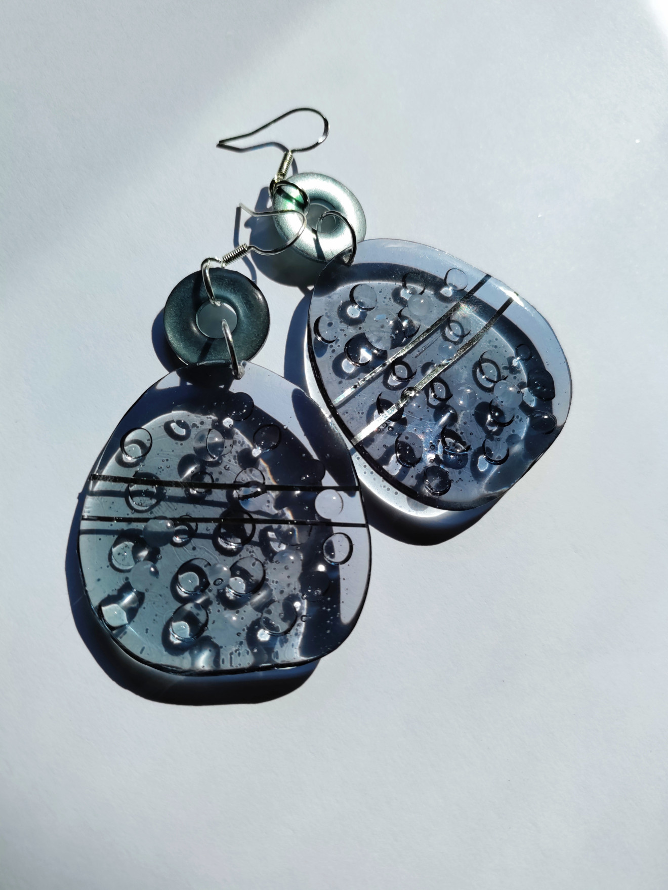 Големи обеци от смола с вградени сребристи нишки и капчици