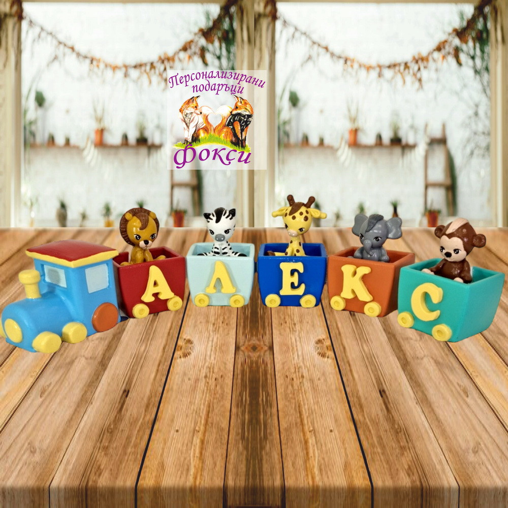 Керамично влакче с букви за изписване на детско име / Именки Сафари Могат да се изработят в различни цветове Чудесен начин да декорирате стаята на вашето дете или да изненадате близки хора с интересен и оригинален подарък за всеки детски празник *** посочената цена е за 1вагон с 1 буква и фигурка. *** локомотивът се заплаща като допълнителен елемент към броя вагони и върху него не се поставя буква