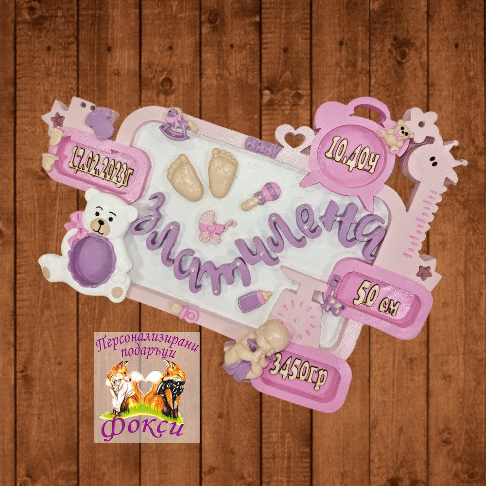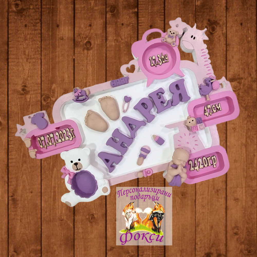 Бейби пано Рамка Жираф Керамично бейби пано Рамка Жираф, с изписани данните на бебето - име, дата и час на раждане, тегло, ръст. Украсено с декоративни бебешки фигурки и рамка за снимка меченце може да се изработи в различни цветове от посочените - за момче или за момиче размер 22 х 29 см
