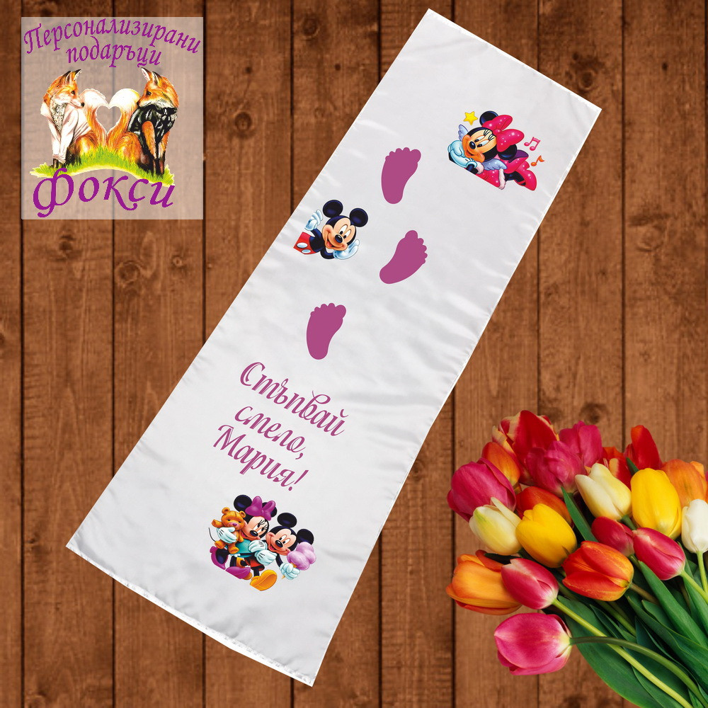 Прощъпулникът на детето е стара Българска традиция, която се практикува и до днес. Той е свързан с един важен в детското развитие момент – прохождането. Ритуалът се извършва, като на земята се постила платното за прощъпулник, питката се търкулва по него, а детето трябва да тръгне след нея и стигайки до предметите да избере един от тях. Според поверието първият предмет, който детето вземе, определя професията му. Платното за прощъпулник е изцяло персонализирано с текст пожелание, отпечатване на името на детето, любим герой и бебешки стъпки. При ваше желание може да се добави и датата на прощъпулника, като това няма да оскъпи продукта. Изработено е от плътен, непрозрачен, матов плат фин микрофибър,в бял цвят /100% полиестер/, с размери 50 х 150 см. Не се пързаля! Използва се директен печат /не се използват лепенки и стикери/. По този начин се елиминира възможността изображенията да се отмият или отлепят при пране или гладене. Цветовете са ярки, наситени и дълготрайни. 0878827475 www.foxy-wed.com
