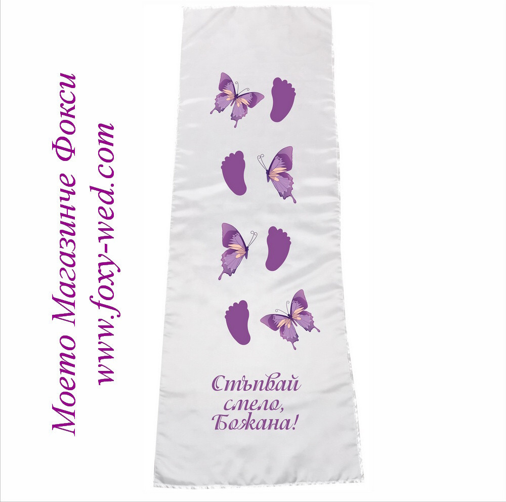 Прощъпулникът на детето е стара Българска традиция, която се практикува и до днес. Той е свързан с един важен в детското развитие момент – прохождането. Ритуалът се извършва, като на земята се постила платното за прощъпулник, питката се търкулва по него, а детето трябва да тръгне след нея и стигайки до предметите да избере един от тях. Според поверието първият предмет, който детето вземе, определя професията му. Платното за прощъпулник е изцяло персонализирано с текст пожелание, отпечатване на името на детето, любим герой и бебешки стъпки. При ваше желание може да се добави и датата на прощъпулника, като това няма да оскъпи продукта. Изработено е от плътен, непрозрачен, матов плат фин микрофибър,в бял цвят /100% полиестер/, с размери 50 х 150 см. Не се пързаля! Използва се директен печат /не се използват лепенки и стикери/. По този начин се елиминира възможността изображенията да се отмият или отлепят при пране или гладене. Цветовете са ярки, наситени и дълготрайни. 0878827475 www.foxy-wed.com