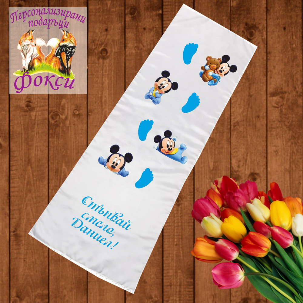 Прощъпулникът на детето е стара Българска традиция, която се практикува и до днес. Той е свързан с един важен в детското развитие момент – прохождането. Ритуалът се извършва, като на земята се постила платното за прощъпулник, питката се търкулва по него, а детето трябва да тръгне след нея и стигайки до предметите да избере един от тях. Според поверието първият предмет, който детето вземе, определя професията му. Платното за прощъпулник е изцяло персонализирано с текст пожелание, отпечатване на името на детето, любим герой и бебешки стъпки. При ваше желание може да се добави и датата на прощъпулника, като това няма да оскъпи продукта. Изработено е от плътен, непрозрачен, матов плат фин микрофибър,в бял цвят /100% полиестер/, с размери 50 х 150 см. Не се пързаля! Използва се директен печат /не се използват лепенки и стикери/. По този начин се елиминира възможността изображенията да се отмият или отлепят при пране или гладене. Цветовете са ярки, наситени и дълготрайни. 0878827475 www.foxy-wed.com