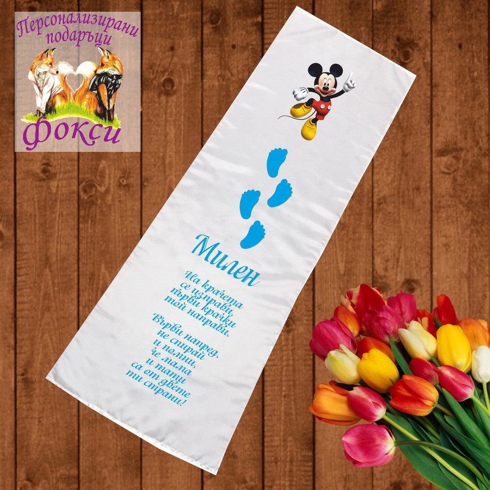 Прощъпулникът на детето е стара Българска традиция, която се практикува и до днес. Той е свързан с един важен в детското развитие момент – прохождането. Ритуалът се извършва, като на земята се постила платното за прощъпулник, питката се търкулва по него, а детето трябва да тръгне след нея и стигайки до предметите да избере един от тях. Според поверието първият предмет, който детето вземе, определя професията му. Платното за прощъпулник е изцяло персонализирано с текст пожелание, отпечатване на името на детето, любим герой и бебешки стъпки. При ваше желание може да се добави и датата на прощъпулника, като това няма да оскъпи продукта. Изработено е от плътен, непрозрачен, матов плат фин микрофибър,в бял цвят /100% полиестер/, с размери 50 х 150 см. Не се пързаля! Използва се директен печат /не се използват лепенки и стикери/. По този начин се елиминира възможността изображенията да се отмият или отлепят при пране или гладене. Цветовете са ярки, наситени и дълготрайни. 0878827475 www.foxy-wed.com