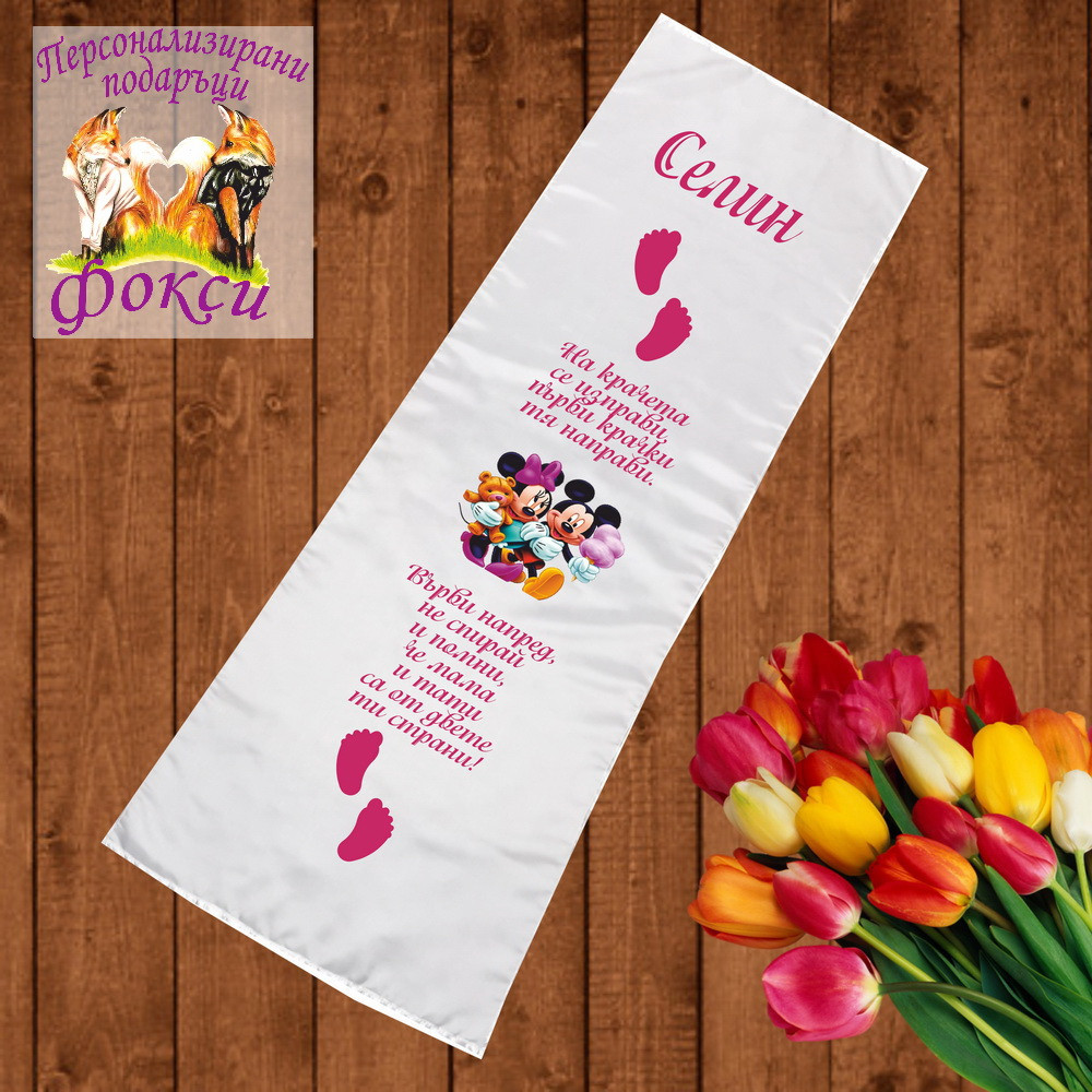 Прощъпулникът на детето е стара Българска традиция, която се практикува и до днес. Той е свързан с един важен в детското развитие момент – прохождането. Ритуалът се извършва, като на земята се постила платното за прощъпулник, питката се търкулва по него, а детето трябва да тръгне след нея и стигайки до предметите да избере един от тях. Според поверието първият предмет, който детето вземе, определя професията му. Платното за прощъпулник е изцяло персонализирано с текст пожелание, отпечатване на името на детето, любим герой и бебешки стъпки. При ваше желание може да се добави и датата на прощъпулника, като това няма да оскъпи продукта. Изработено е от плътен, непрозрачен, матов плат фин микрофибър,в бял цвят /100% полиестер/, с размери 50 х 150 см. Не се пързаля! Използва се директен печат /не се използват лепенки и стикери/. По този начин се елиминира възможността изображенията да се отмият или отлепят при пране или гладене. Цветовете са ярки, наситени и дълготрайни. 0878827475 www.foxy-wed.com