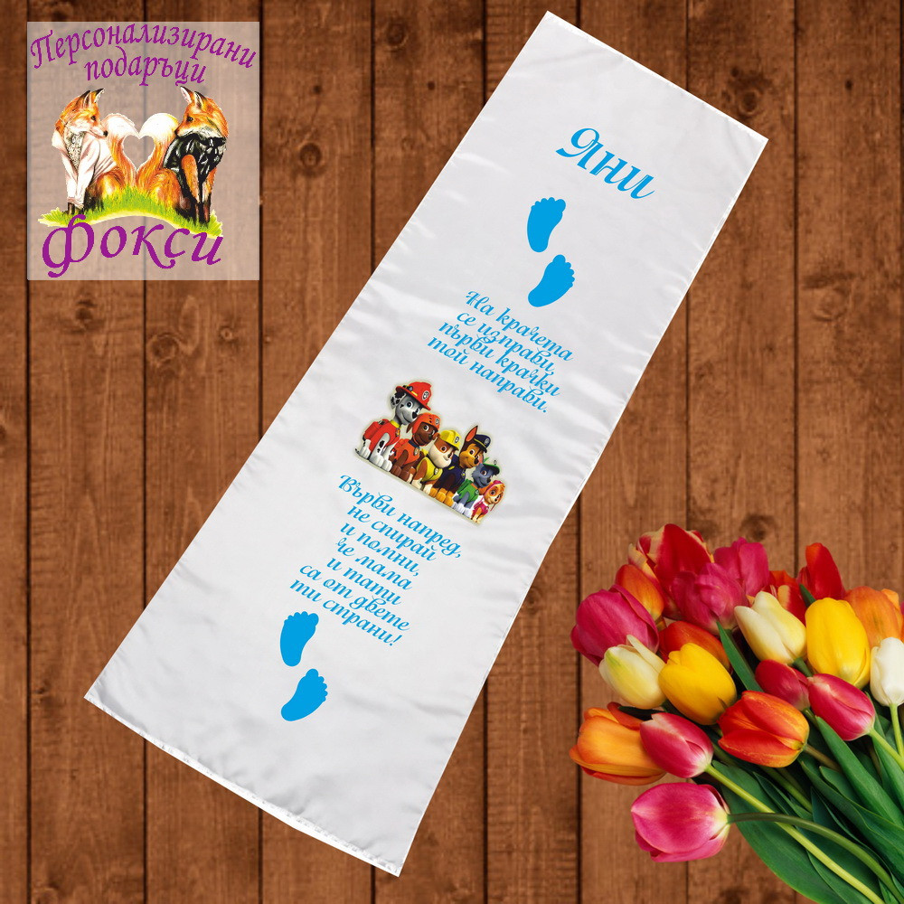 Прощъпулникът на детето е стара Българска традиция, която се практикува и до днес. Той е свързан с един важен в детското развитие момент – прохождането. Ритуалът се извършва, като на земята се постила платното за прощъпулник, питката се търкулва по него, а детето трябва да тръгне след нея и стигайки до предметите да избере един от тях. Според поверието първият предмет, който детето вземе, определя професията му. Платното за прощъпулник е изцяло персонализирано с текст пожелание, отпечатване на името на детето, любим герой и бебешки стъпки. При ваше желание може да се добави и датата на прощъпулника, като това няма да оскъпи продукта. Изработено е от плътен, непрозрачен, матов плат фин микрофибър,в бял цвят /100% полиестер/, с размери 50 х 150 см. Не се пързаля! Използва се директен печат /не се използват лепенки и стикери/. По този начин се елиминира възможността изображенията да се отмият или отлепят при пране или гладене. Цветовете са ярки, наситени и дълготрайни. 0878827475 www.foxy-wed.com