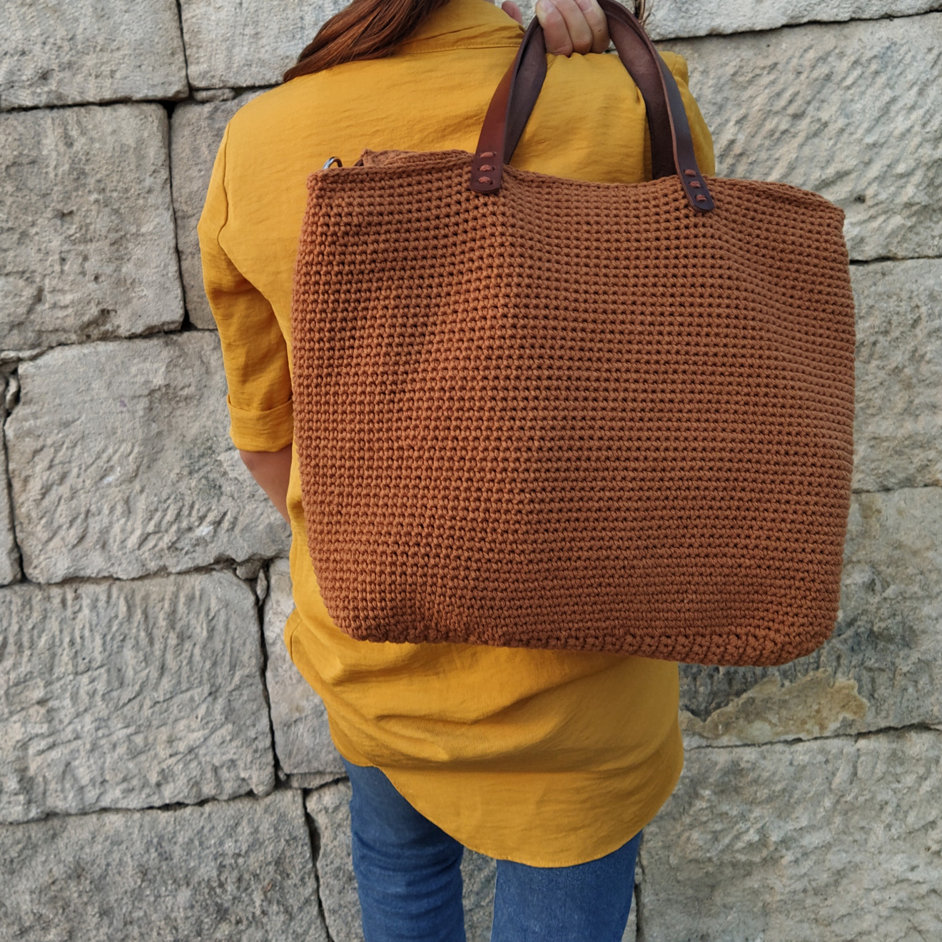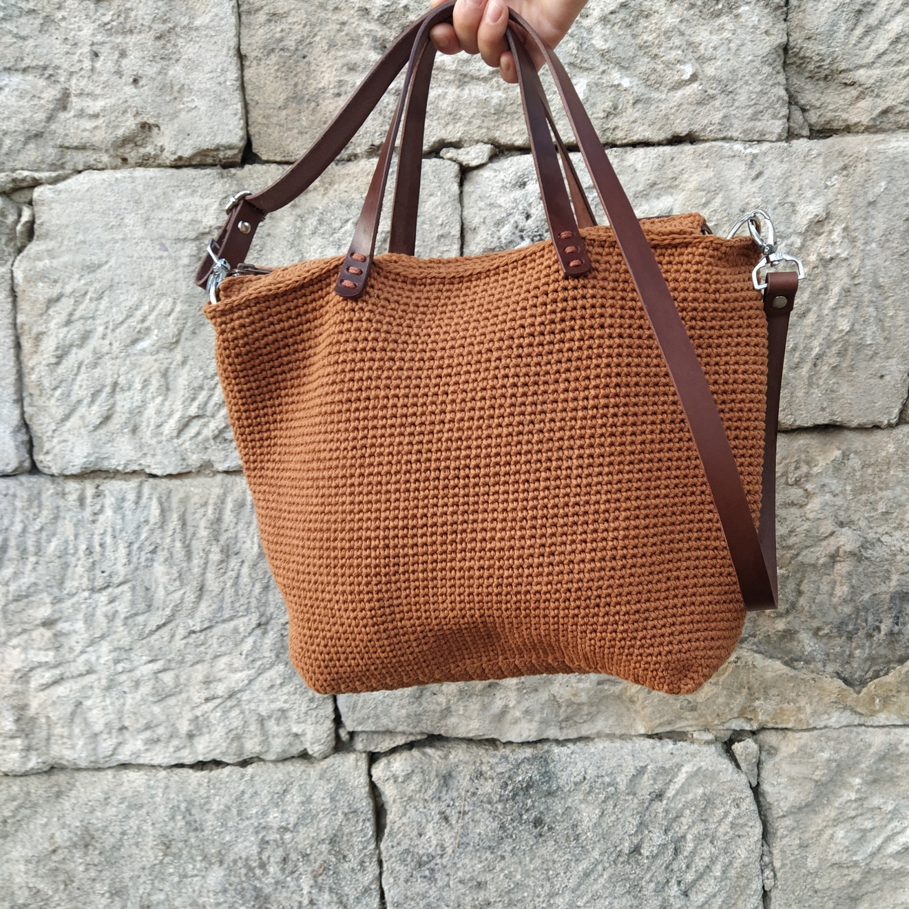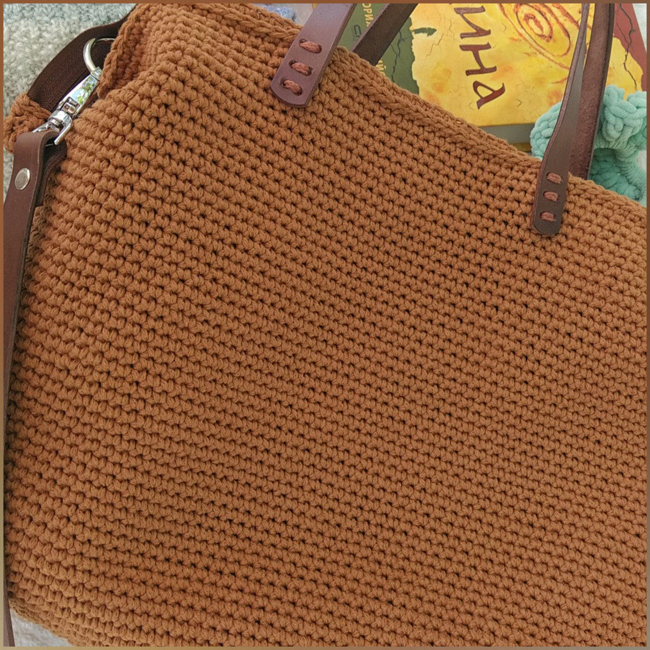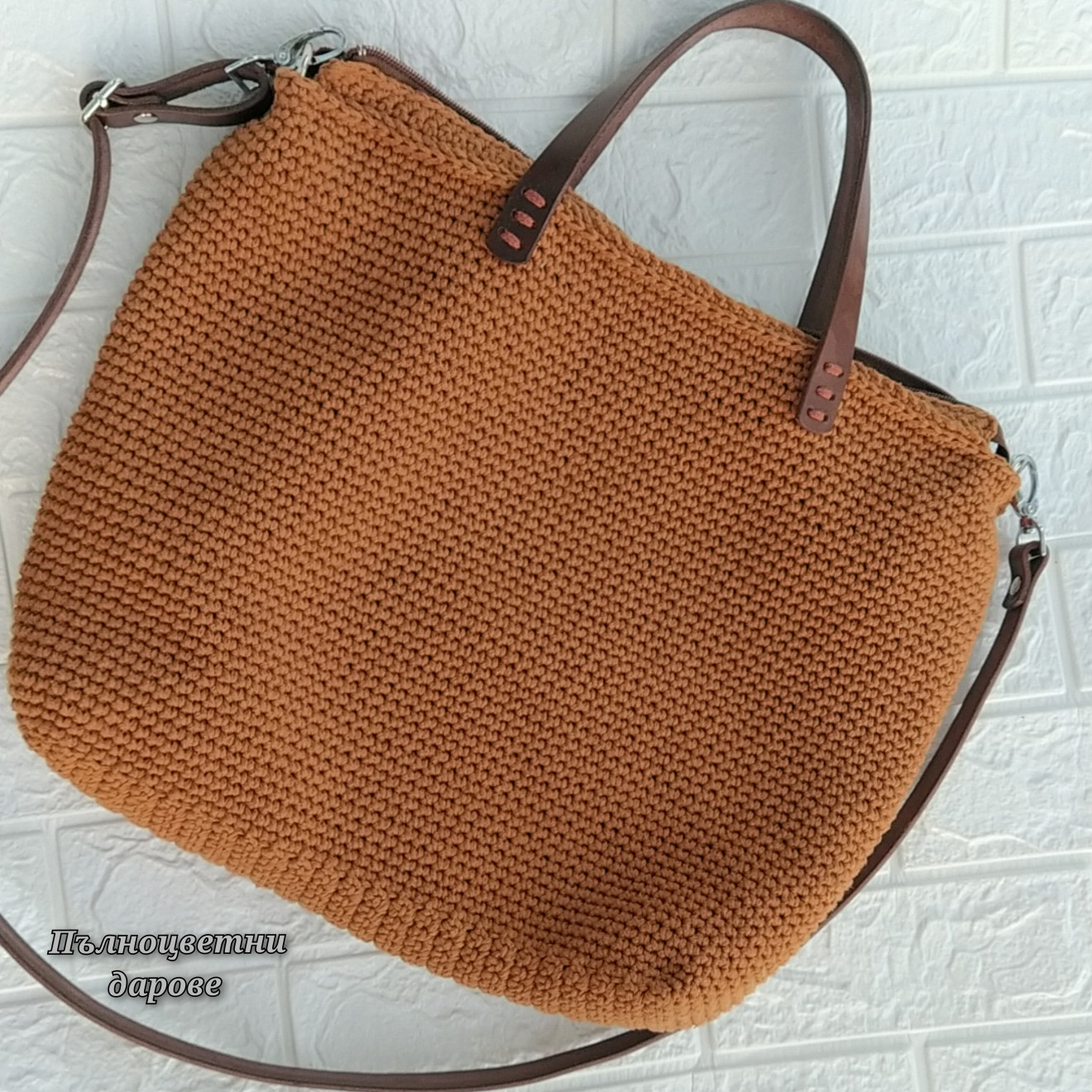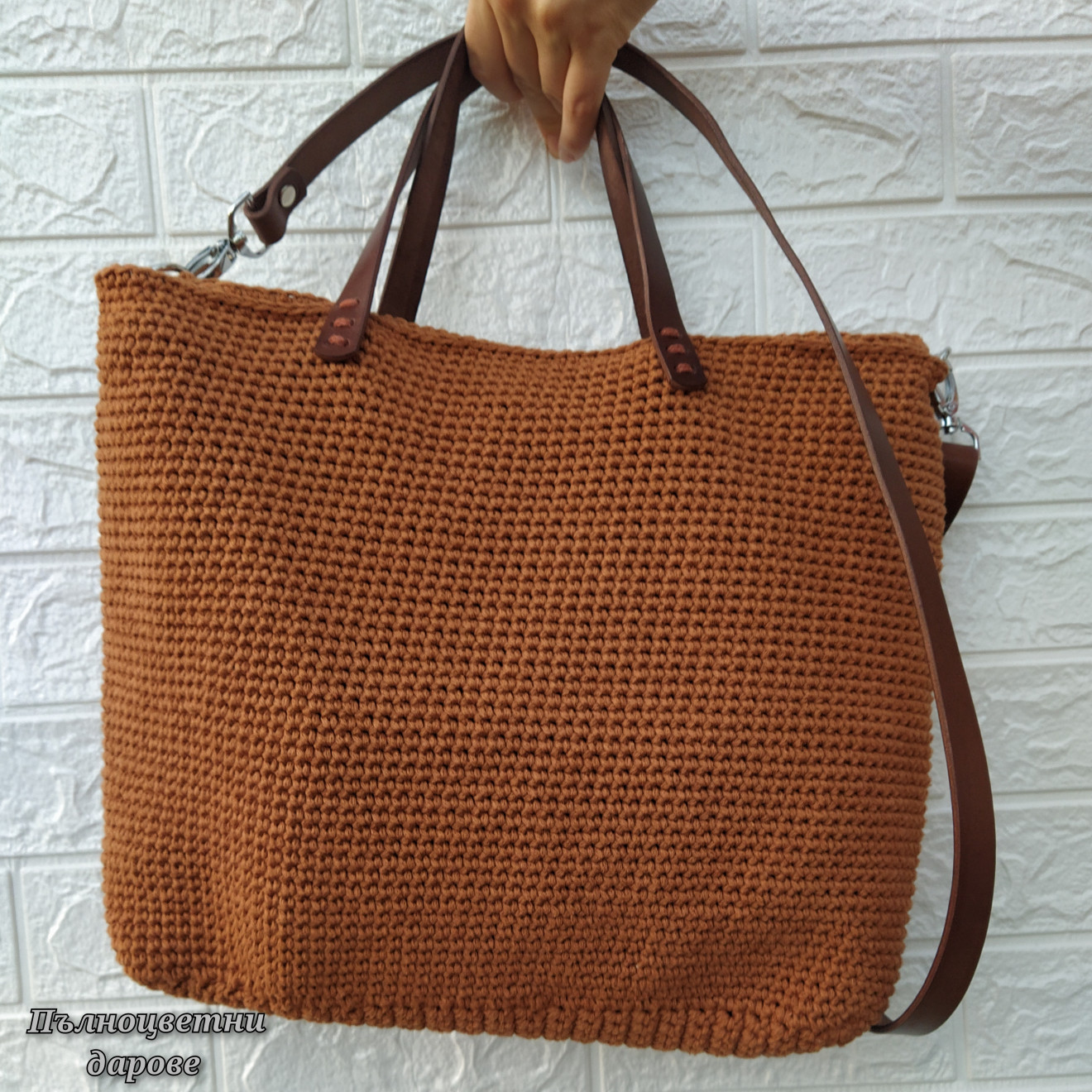 Голяма кафява дамска плетена чанта, която събира всичко необходимо за майка с две деца. Съчетанието от тънкото памучно въже и дръжките от здрава изкуствена кожа я правят изключително издръжлива. Приблизителни размери: Обиколка 86 см. Висока 33 см. Има подплата с два вътрешни джоба, защото така беше пожелана. Изработена е по поръчка и не е налична. На последната снимка се виждат част от нещата, които се събират в нея. И остава свободно място. Ако пожелаете подобна, напишете съобщение. Ще уточним детайлите за желан цвят, дръжки и брой вътрешни джобове. Чантите са изцяло ръчна изработка и подлежат на корекции, така че да отговарят на личните Ви нужди и идеи. Поздрави! Пълноцветни дарове ?