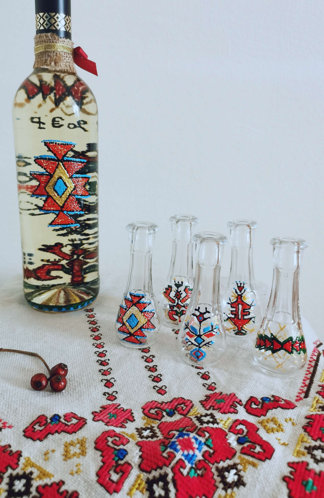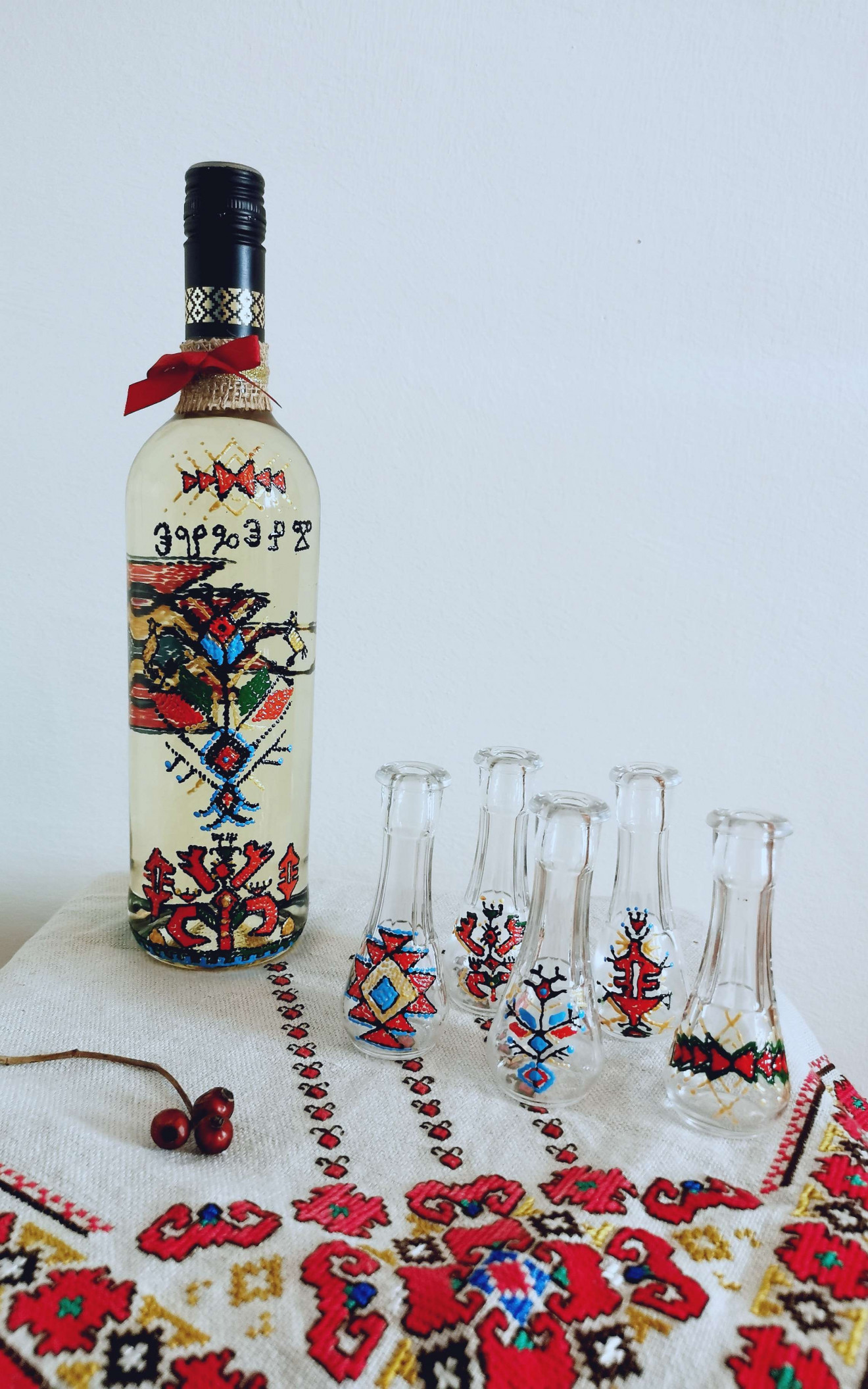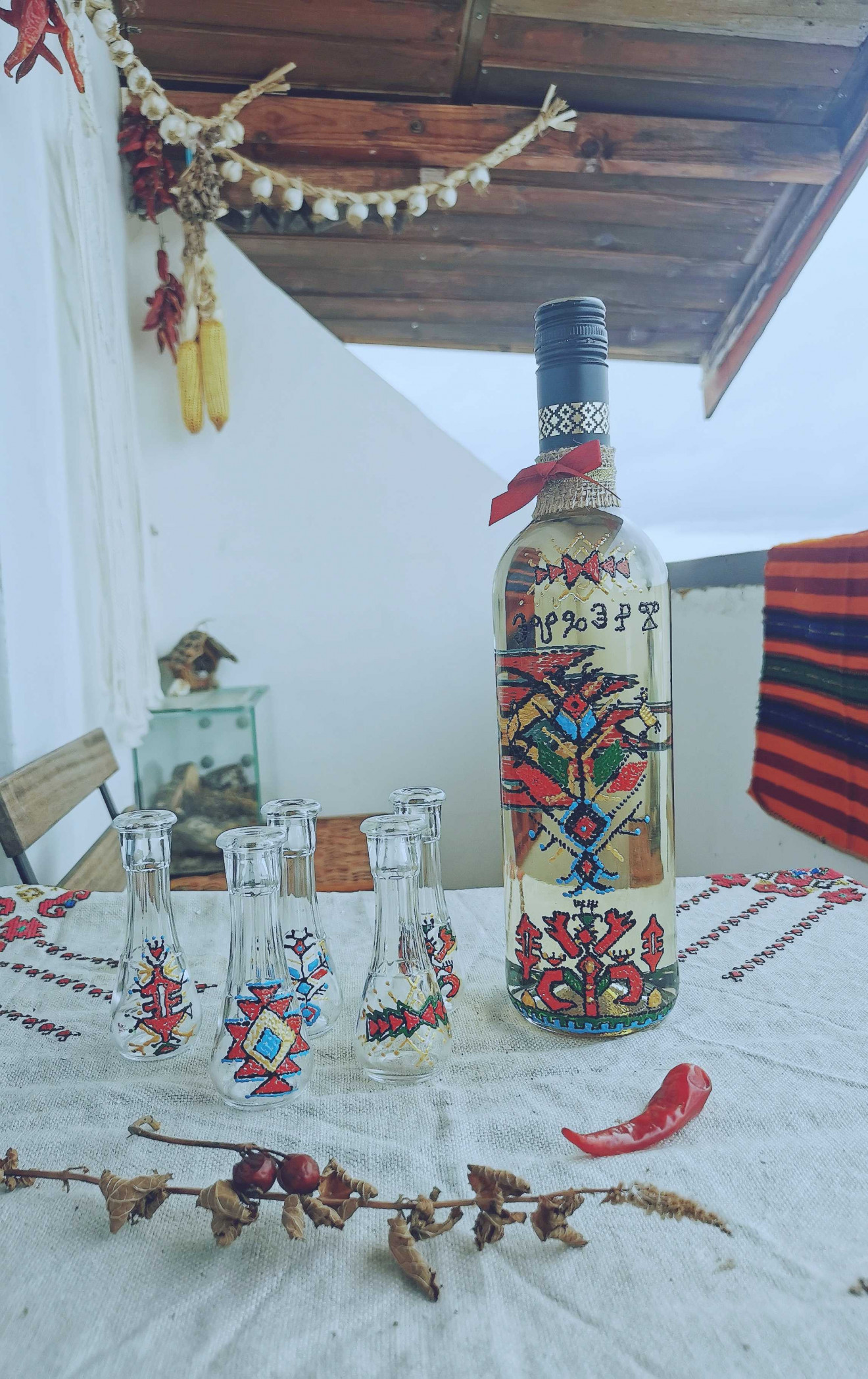 Ръчно рисувани с български, народни мотиви. Прекрасен подарък за мъж или цялото семейство! Комплекта съдържа 1бр.шише и 5бр.юсчета.