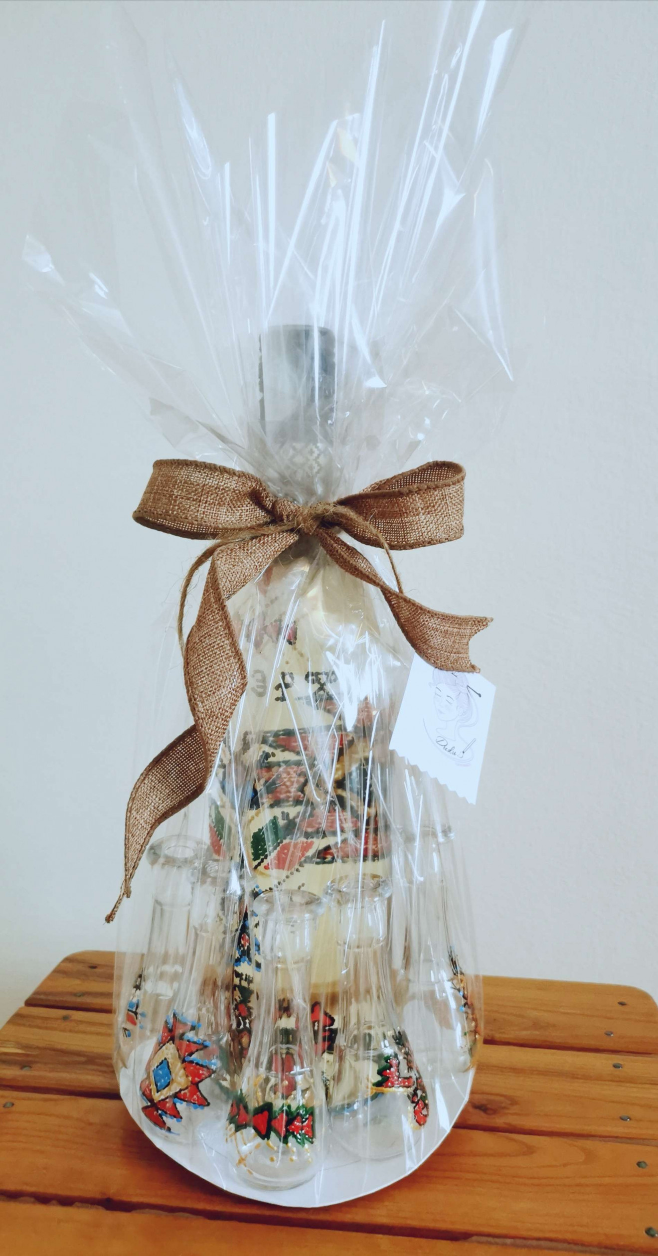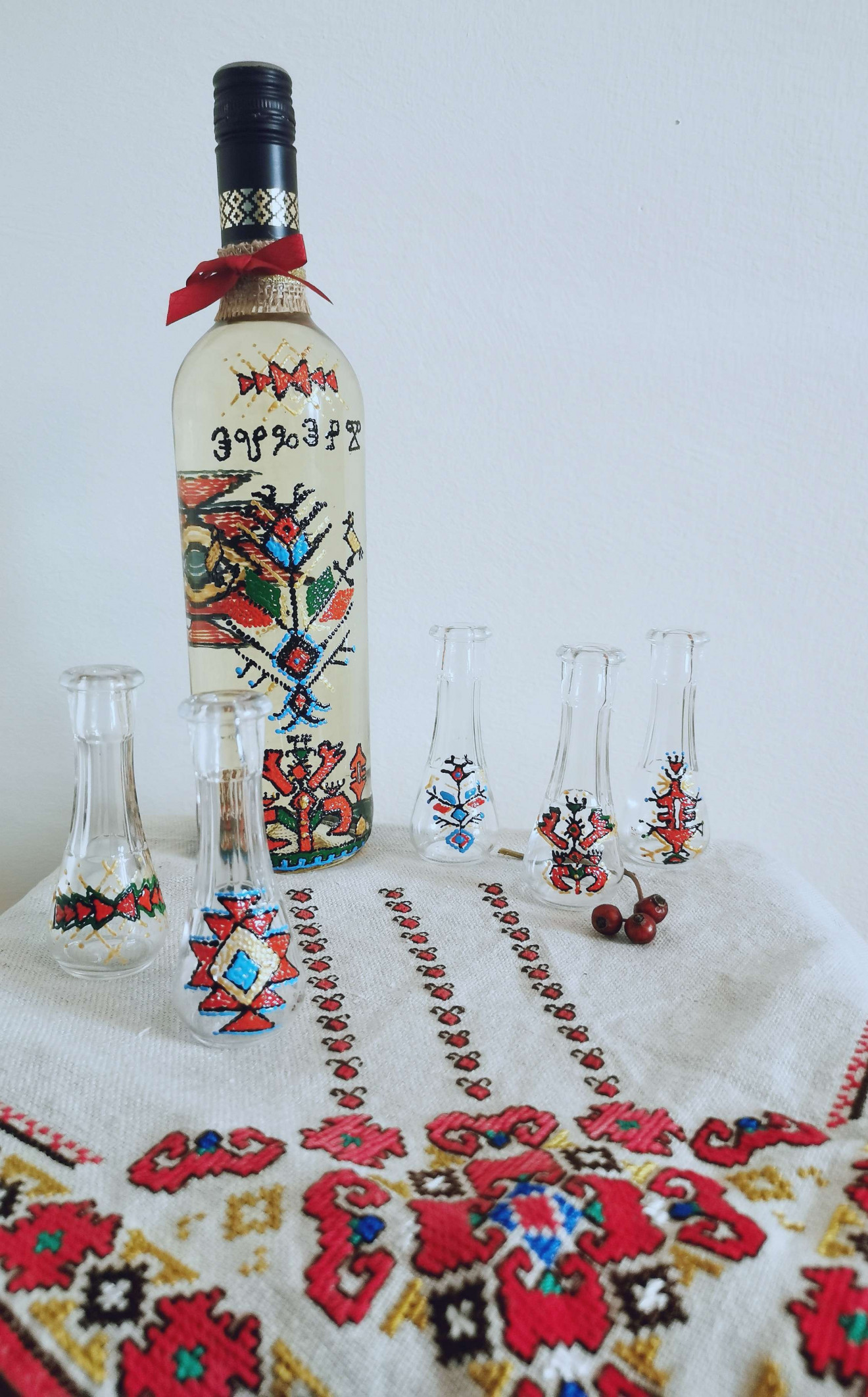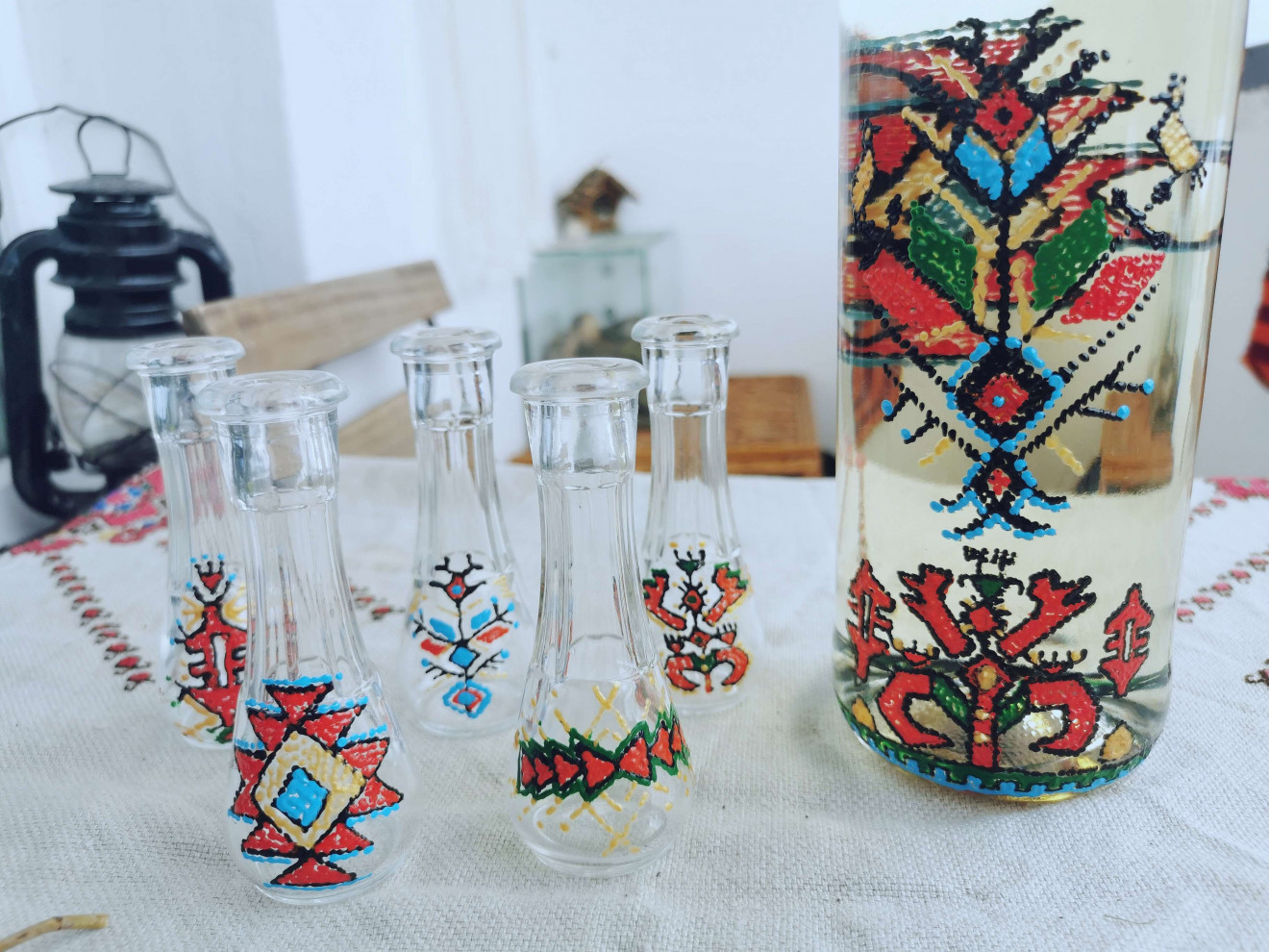 Ръчно рисувани с български, народни мотиви. Прекрасен подарък за мъж или цялото семейство! Комплекта съдържа 1бр.шише и 5бр.юсчета.