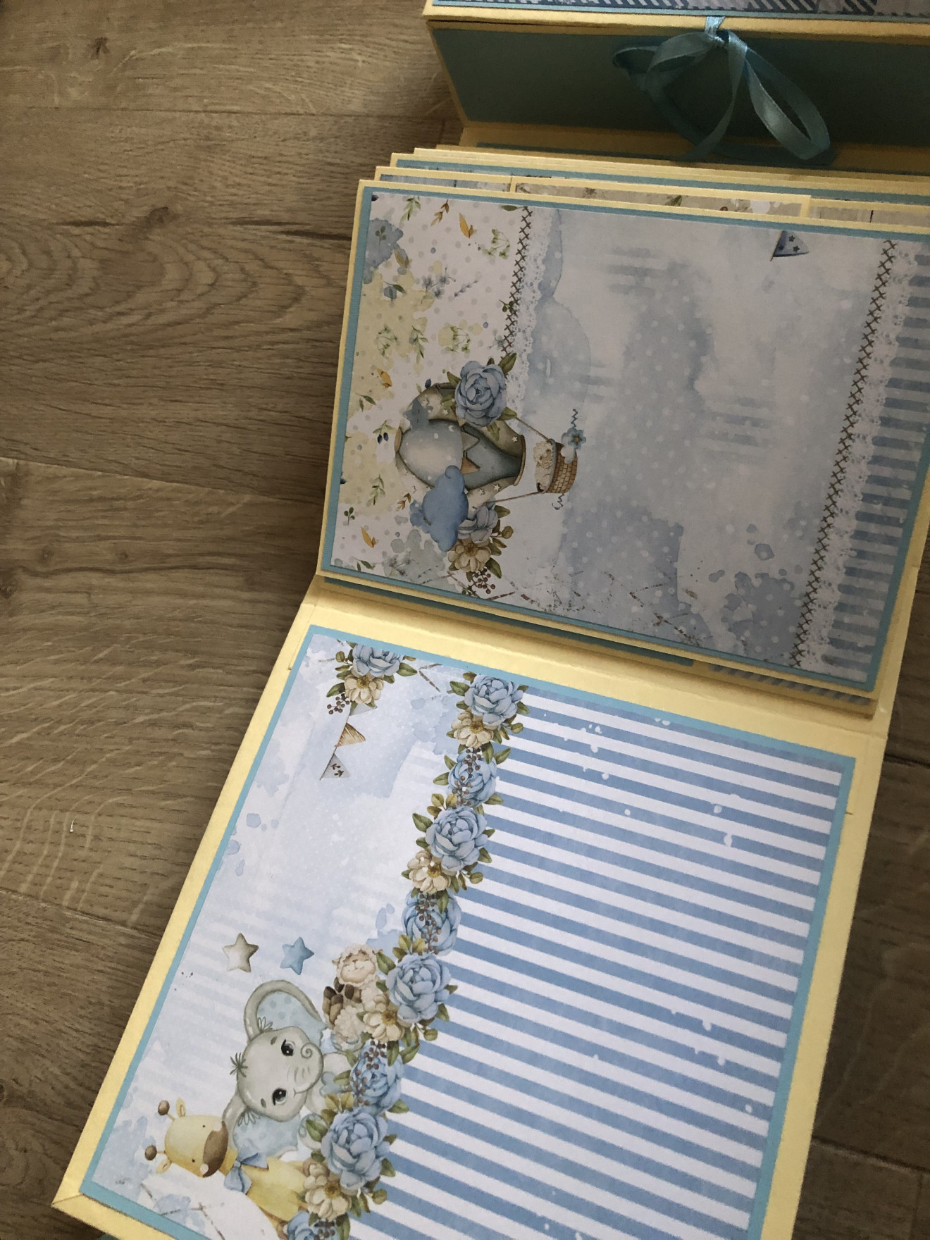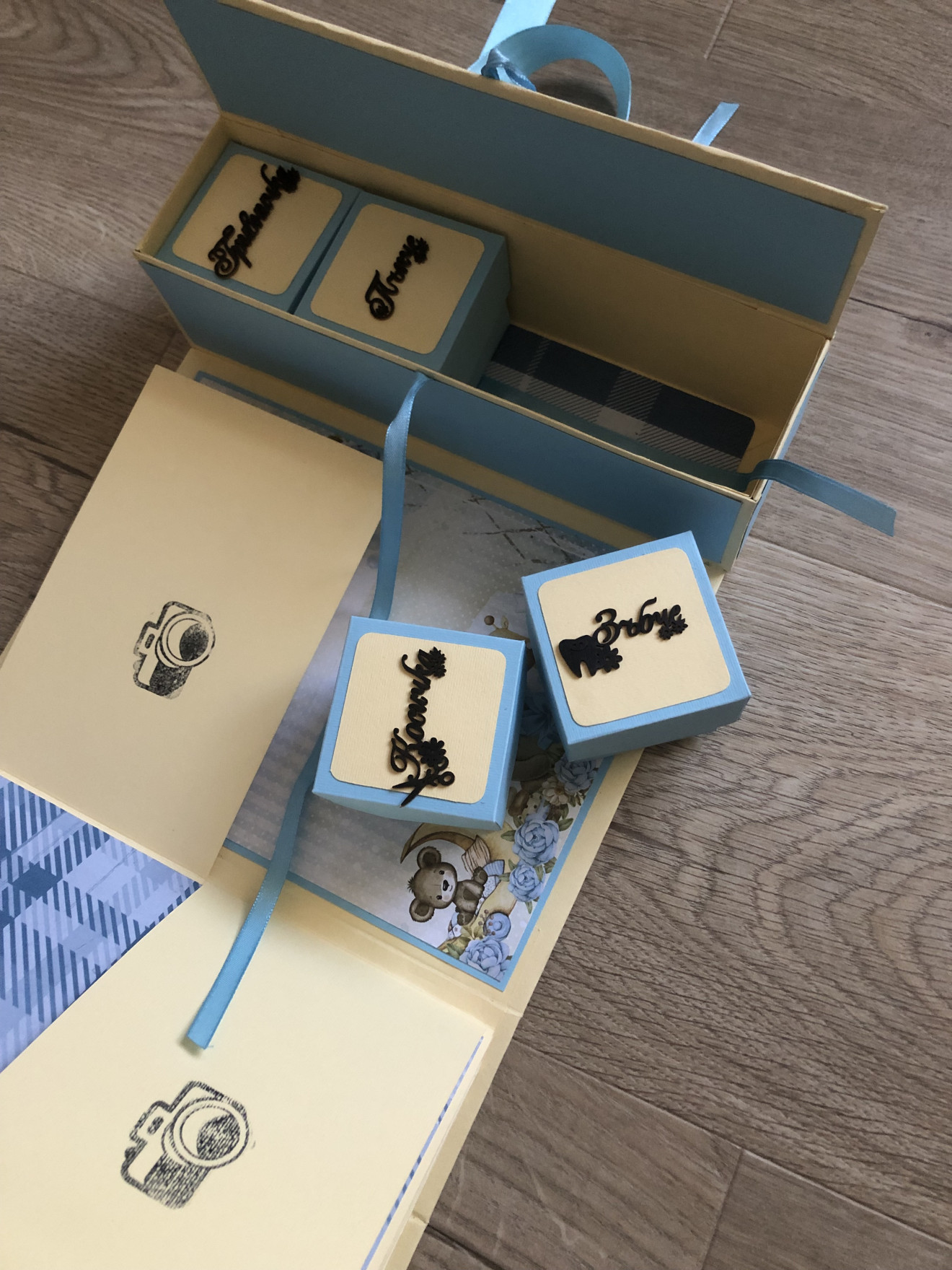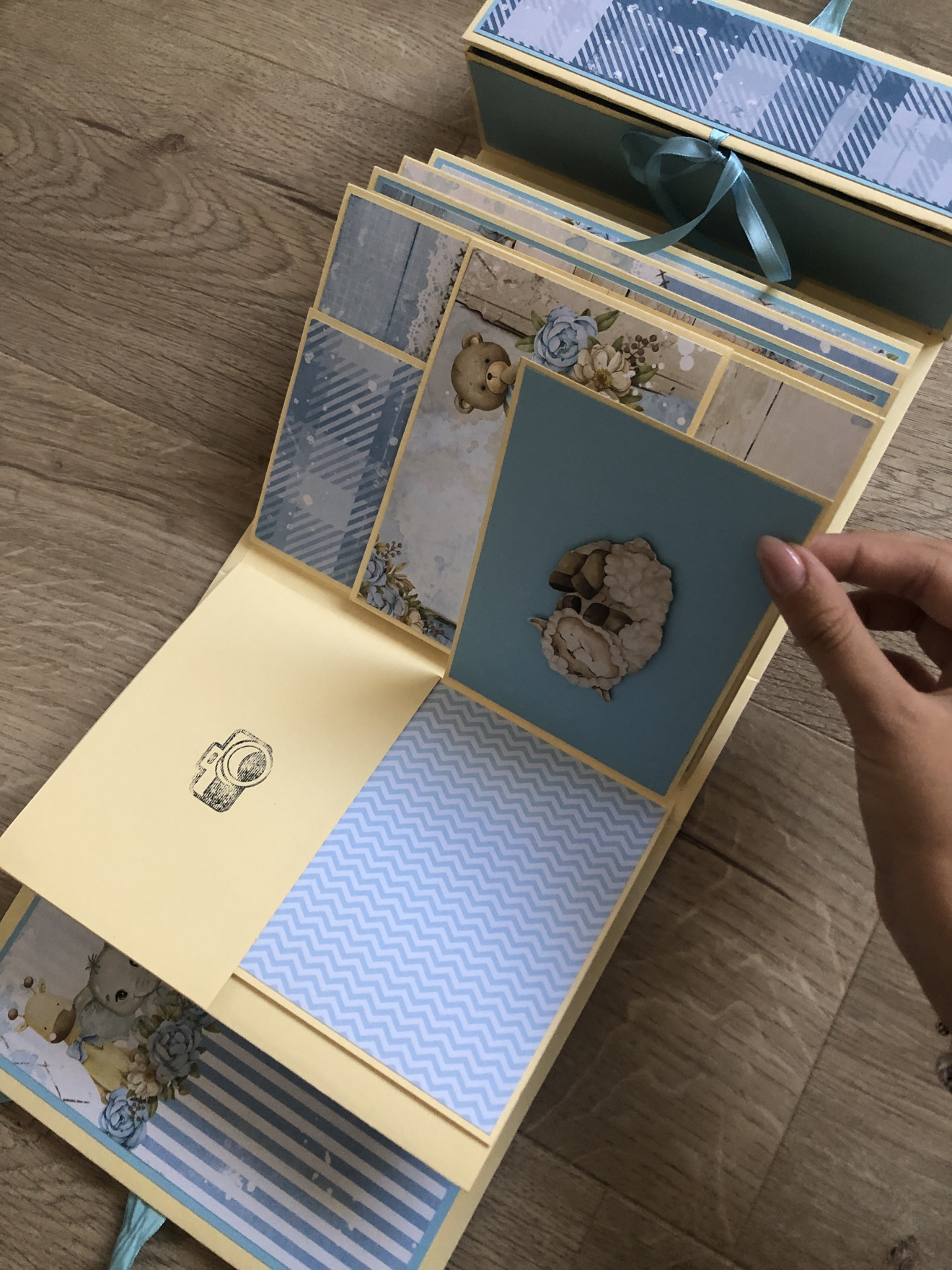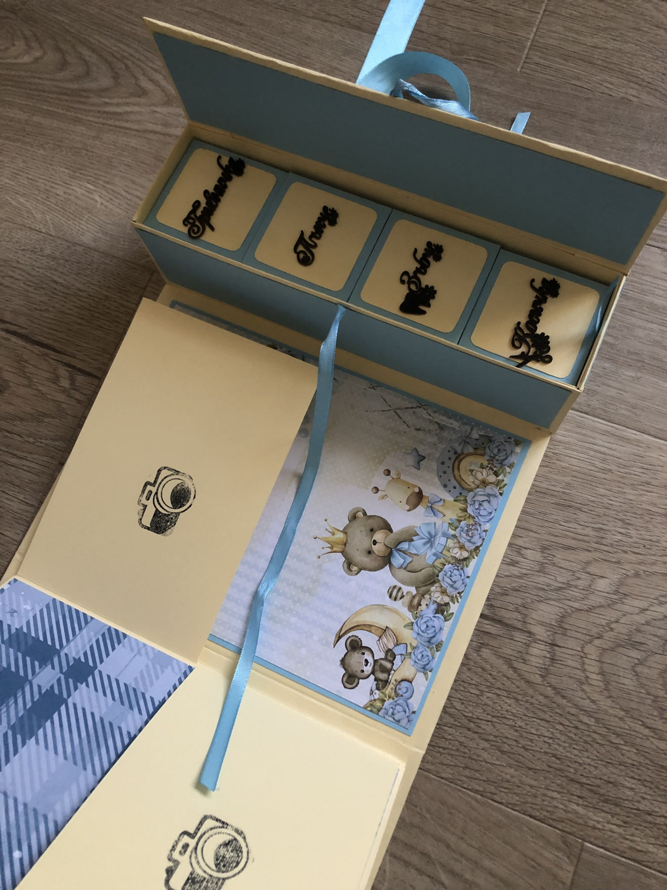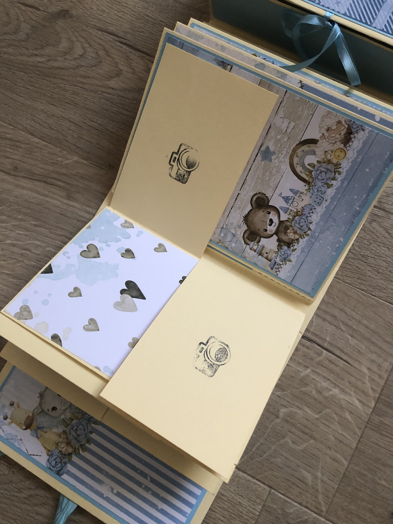 Бебешко албумче за момченце с вградена кутия за съкровища. Албумът може да бъде изработен на друга тематика. Съдържа място за над 60 снимки с размер 10*15 + четири кутийки за бебешки съкровища. Размери: 22,5*22,5см Подходящ за кръщене или погача.