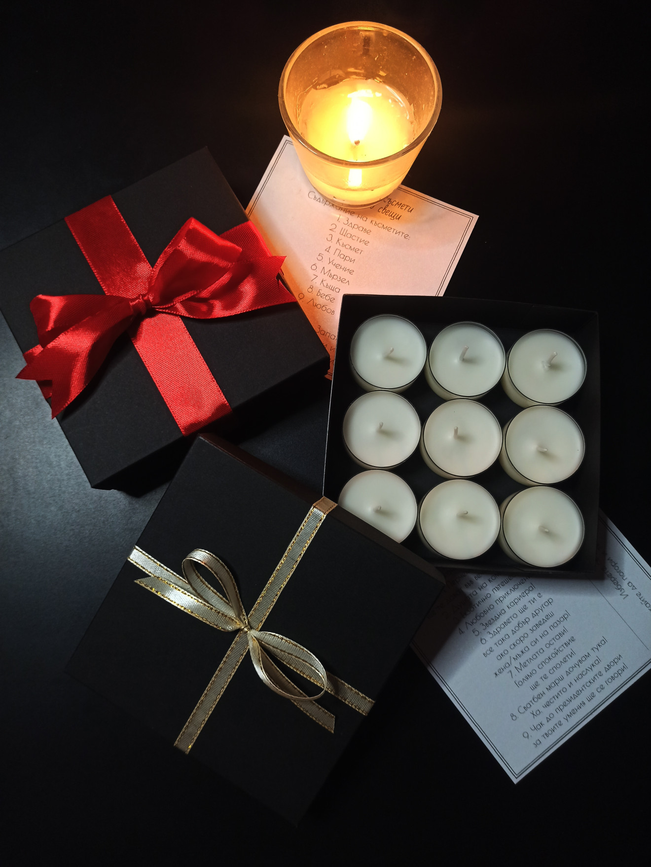 Подаръчна кутия за Коледа: представлява кутия от девет свещи със скрити в тях различни късмети. Нужно и да бъде запалена за да може да се прочете късмета в нея. Аромат: тиквен пай Размер на кутията: 12х12 см. Може да разгледате още предложения и да следите новости на: www.facebook.com/DaisyWorkshopGifts