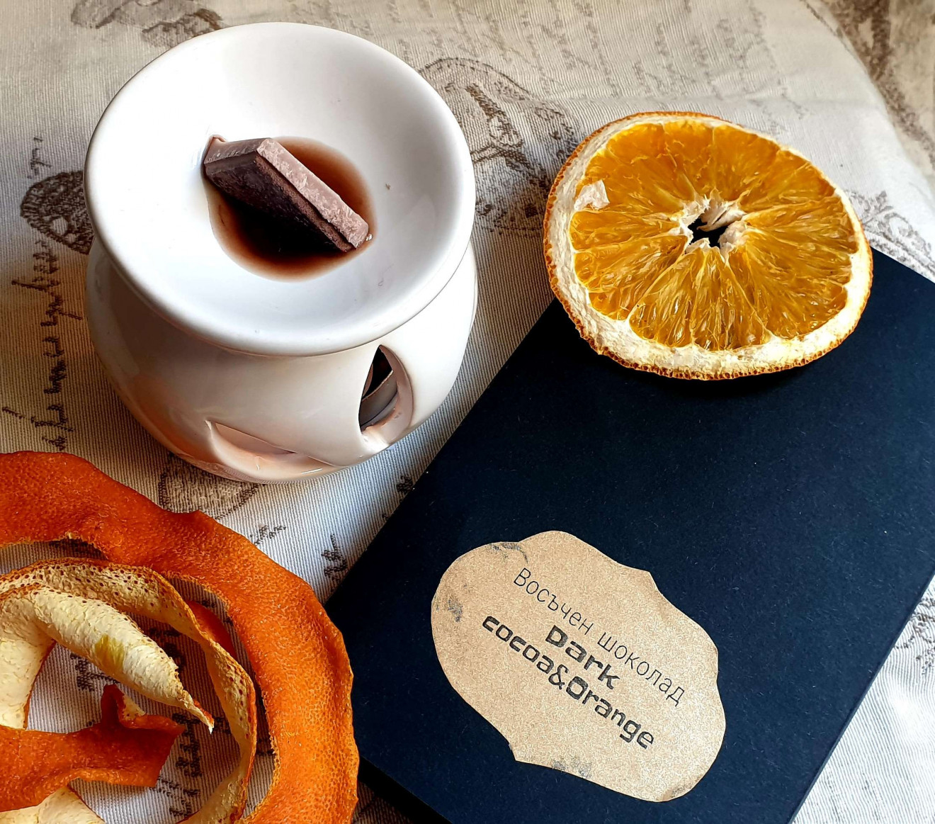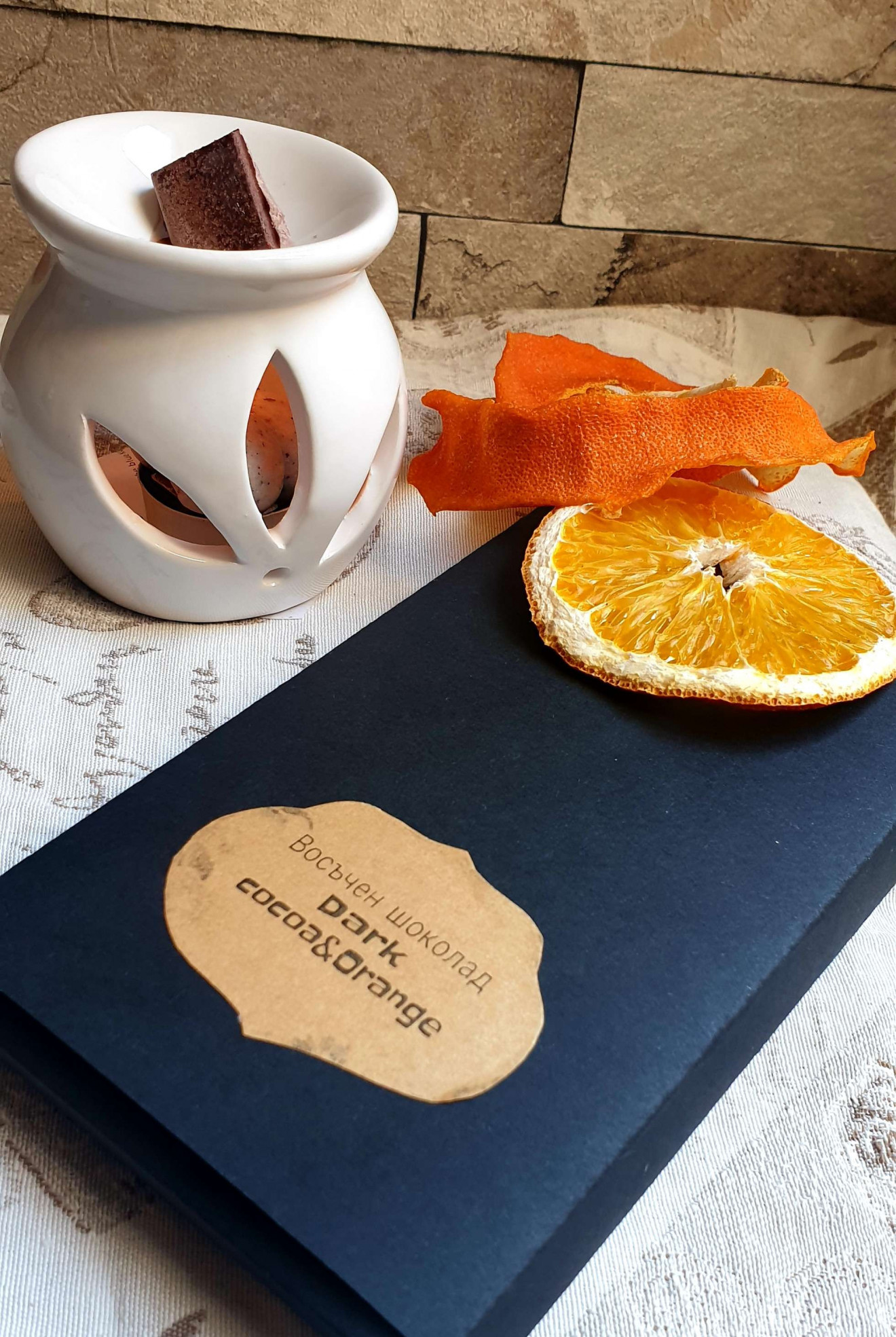 Комплект за ароматерапия: ☆ восъчен шоколад Dark chocolate&Orange ☆ арома лампа ☆ чаена свещичка арома лампа, в която се поставя малка чаена свещичка вътре (включена в комплекта) и парченце от восъчния шоколад отгоре, което след нагряването отделя нежен и приятен аромат. Ръчно изработен, с много любов и прецизност. Използвани са само натурални съставки - чист растителен восък и естествени аромати Зарадвайте любим човек с ръчно изработени и уникални свещи Внимание! Шоколадът е изработен от восък и не е годен за консумация, въпреки апетитния си вид.