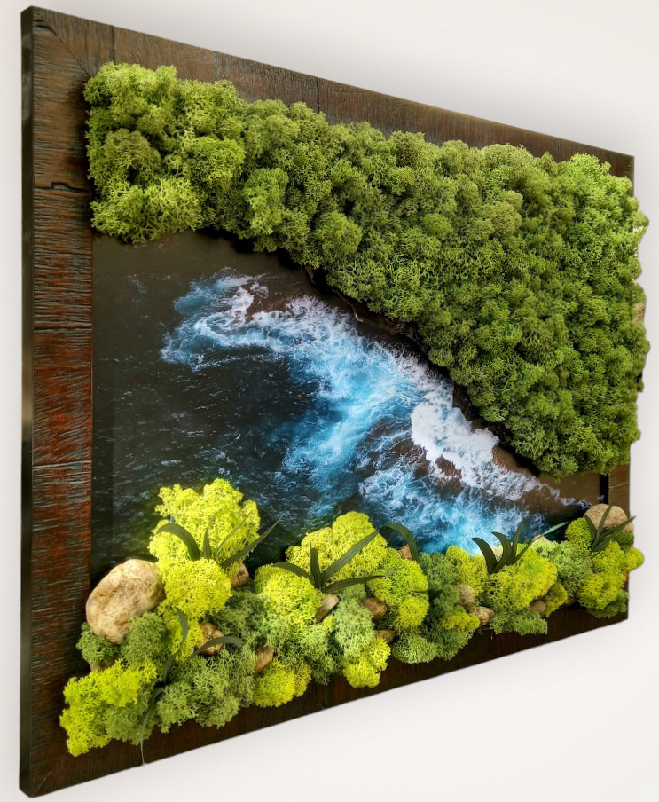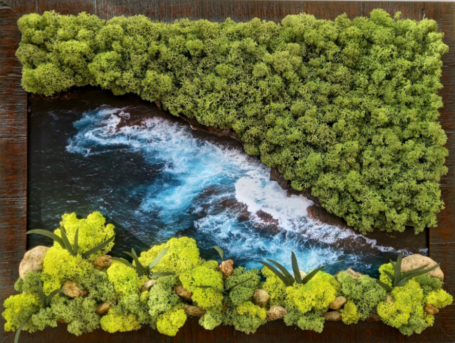 "На скалите", изработено изцяло с естествени материали. За направата са използвани скандинавски мъх, камъчета и стабилизирани растения. Размери 50/37см.