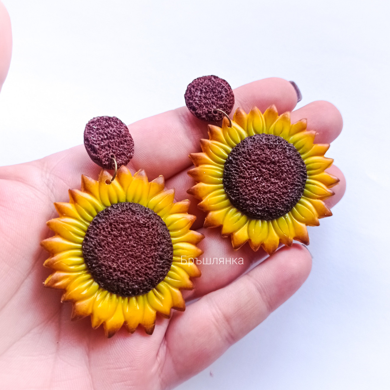 Ръчно изработени обеци Слънчогледи от полимерна глина от серията Големите цветя. Големи слънчогледи с размер 50мм, с окачване вграден винт и щифт от стомана и ринг античен месинг. Не предизвикват алергии. По поръчка могат да се изработят на гривна, пръстен, колие, ключодържател. За повече информация и поръчка може да се свържете на лично съобщение тук или във Фейсбук, на страницата ми Бръшлянка ?