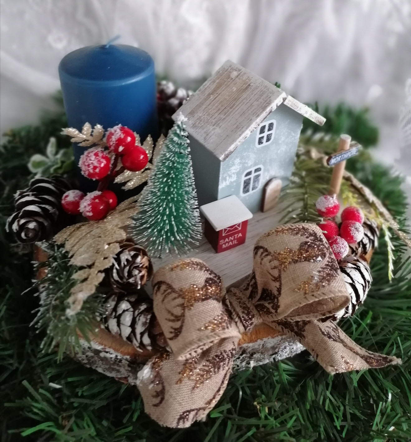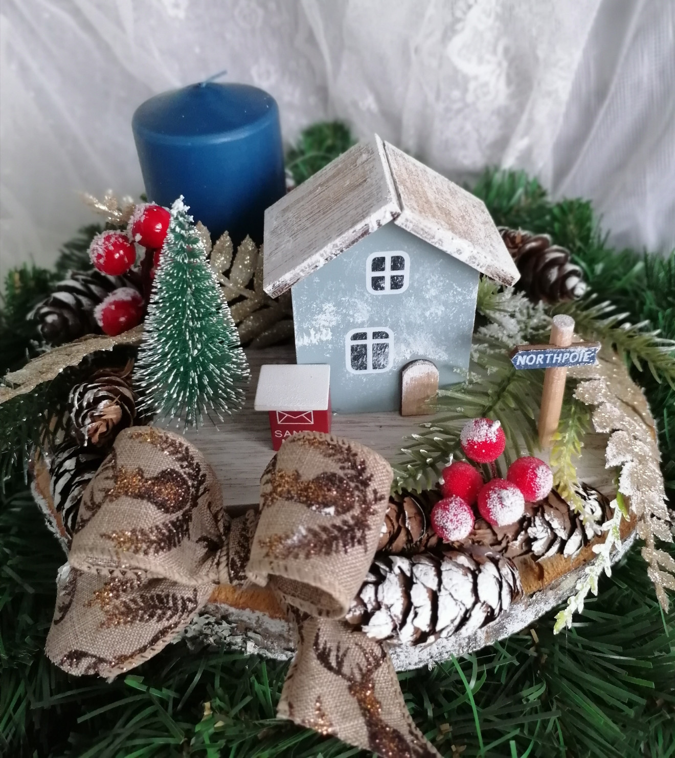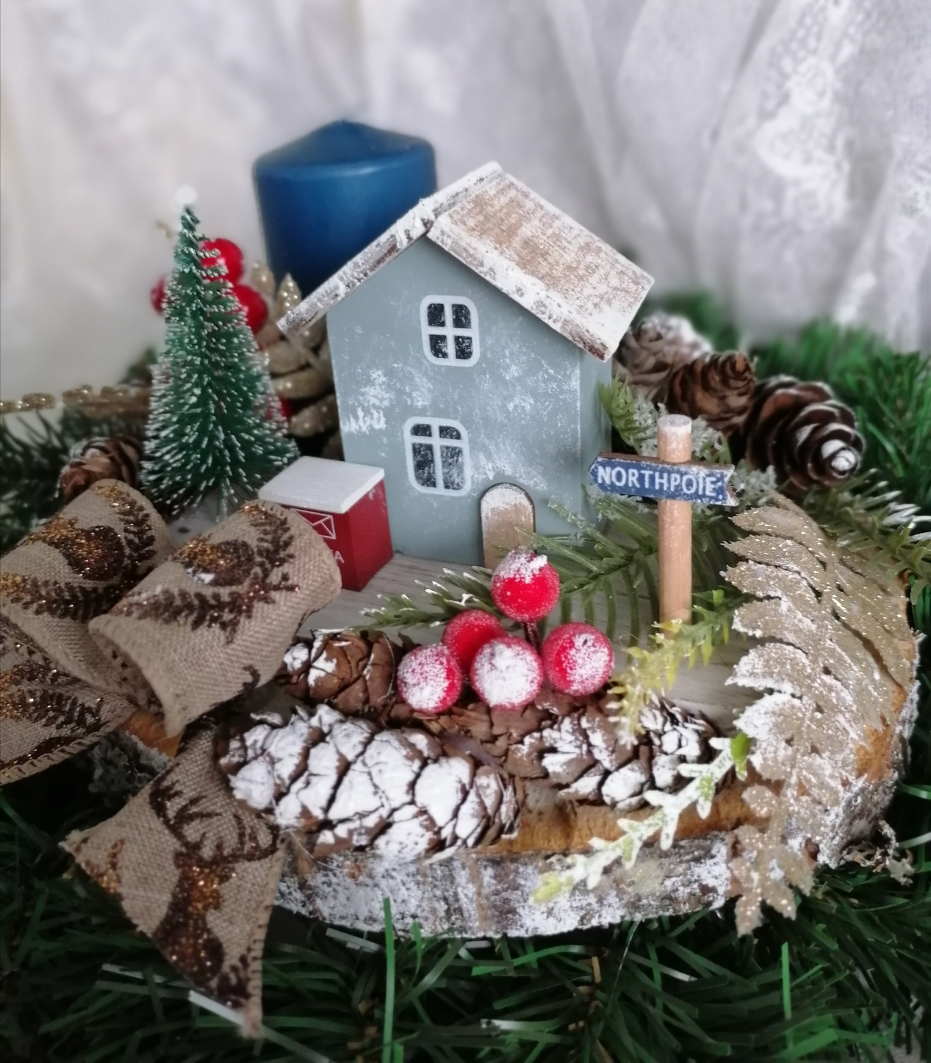 Дървена шайба, декорирана със свещ, джудже и декоративни елементи. Диаметърът на шайбата е около 20см