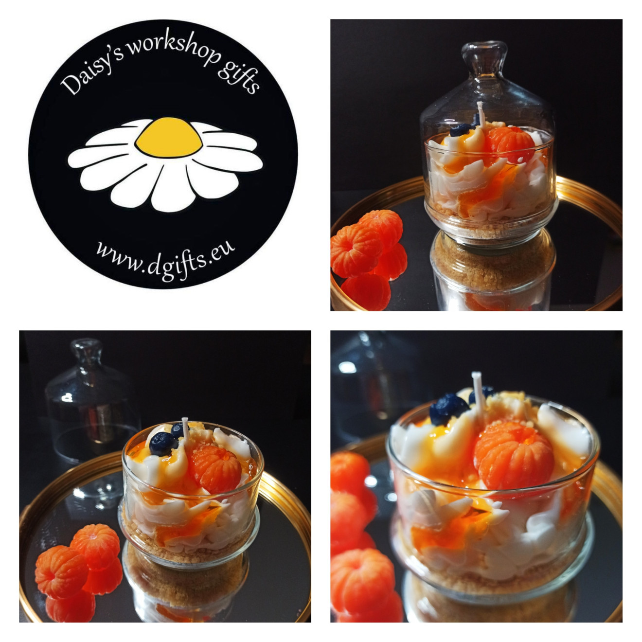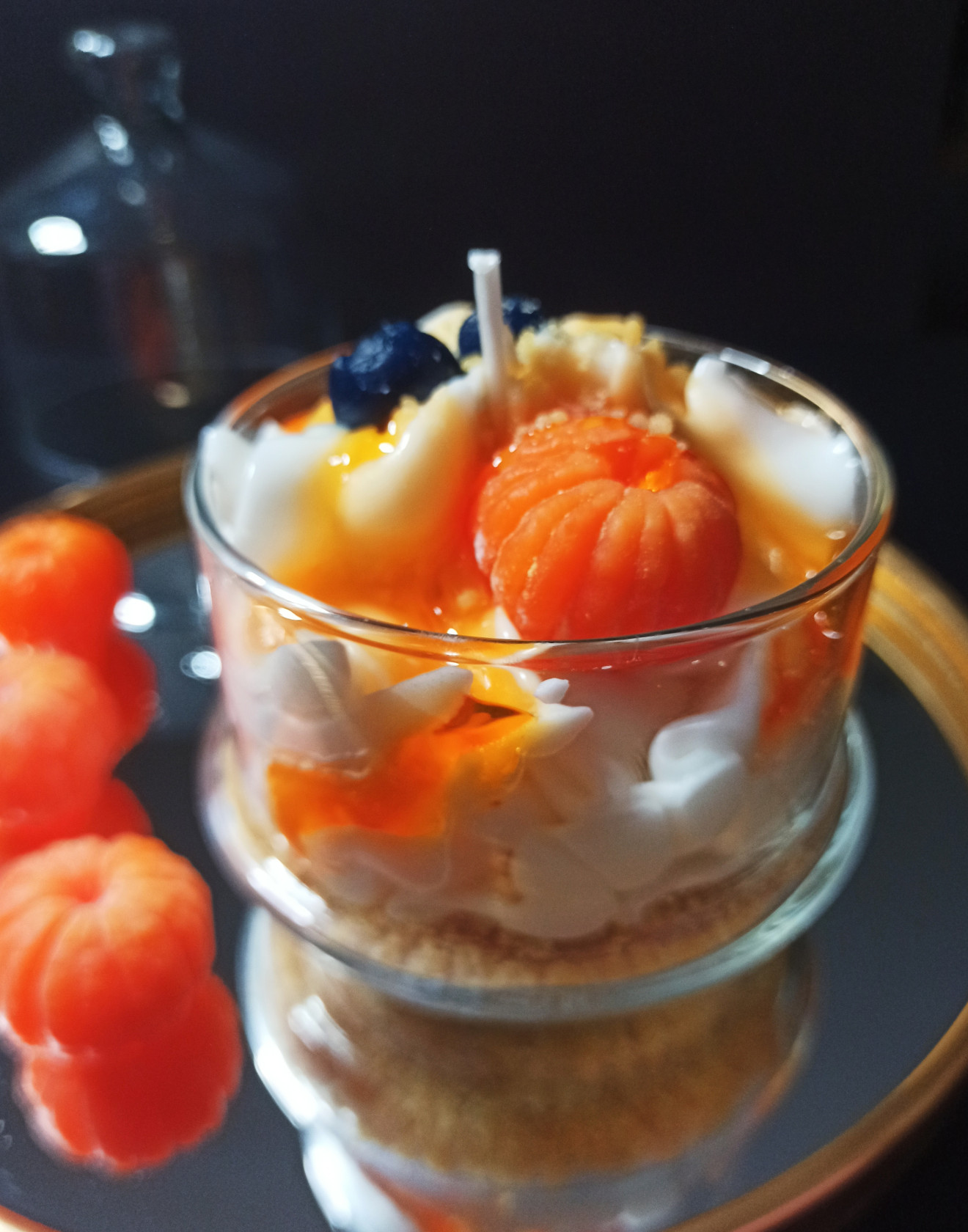 Пленяващ десерт в прекрасна стъкленица. Избрах парфюмна композиция с преобладаващ цитрусов аромат, който наистина заслужавате. Началните нотки са на мандарина и сочен портокал. В сърцето на аромата се разгръща лавандула и тъмно пачули. Накрая се отключва базата от кехлибар, ванилия и мускус. Обем на стъкленицата: 285 мл. Ще я изработвам само по поръчка до изчерпване на стъклениците.