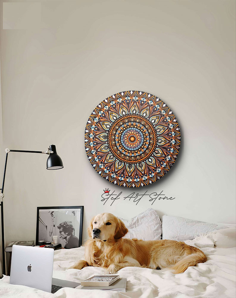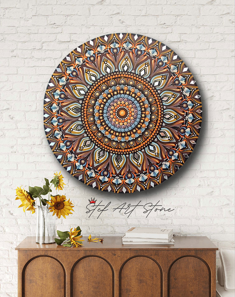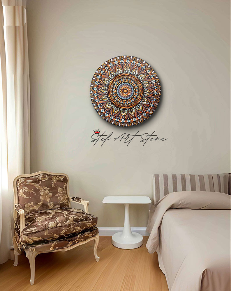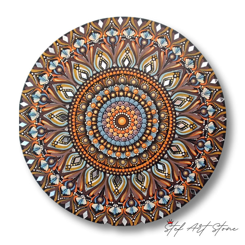 Картина за стена Мандала за Успех. Вашият Път към Успех с магията на Мандалата! Вдъхновяваща "Мандала за Успех" - картина, която ще обогати вашия дом с изкуство и символика. Тази ръчно рисувана мандала представя хармонично съчетание от цветове и геометрични форми, създадени, за да ви помогнат да привлечете успех и благополучие във всеки аспект на живота си. Помагайки за фокусиране върху целите ви, тя предоставя визуално наслаждение и спокойствие. Направете я част от своя дом и се насладете на положителната трансформация. Размер диаметър 50 см. Картината е ръчно рисувана върху дървена основа. Използвани са акрилни бои. За максимална устойчивост на боите е използвано защитно покритие, което позволява и почистване с хладка вода. Ще пристигне при вас готова за окачване и в кутия, удобна за подходящо декориране като подарък , както и за безопасно транспортиране. • СЕРТИФИКАТ за автентичност от автора. ⭐ За бърза поръчка телефон: 0876 668603