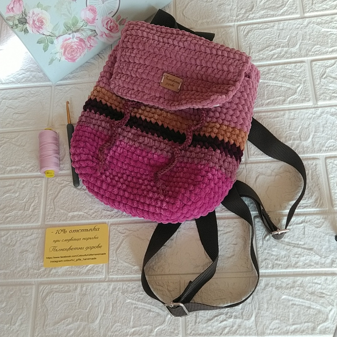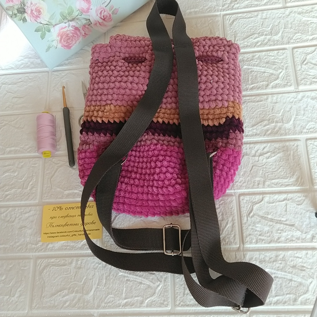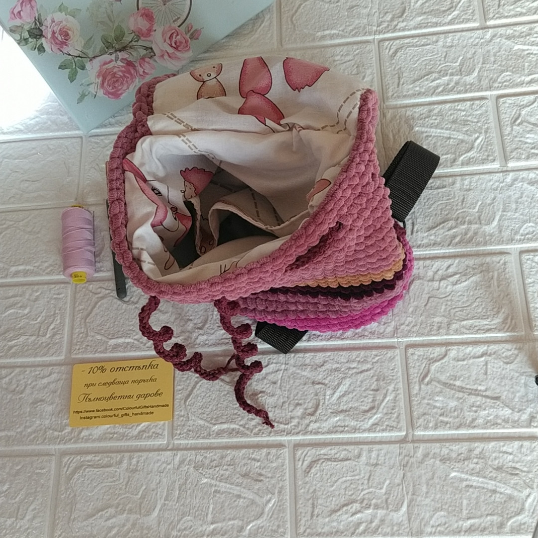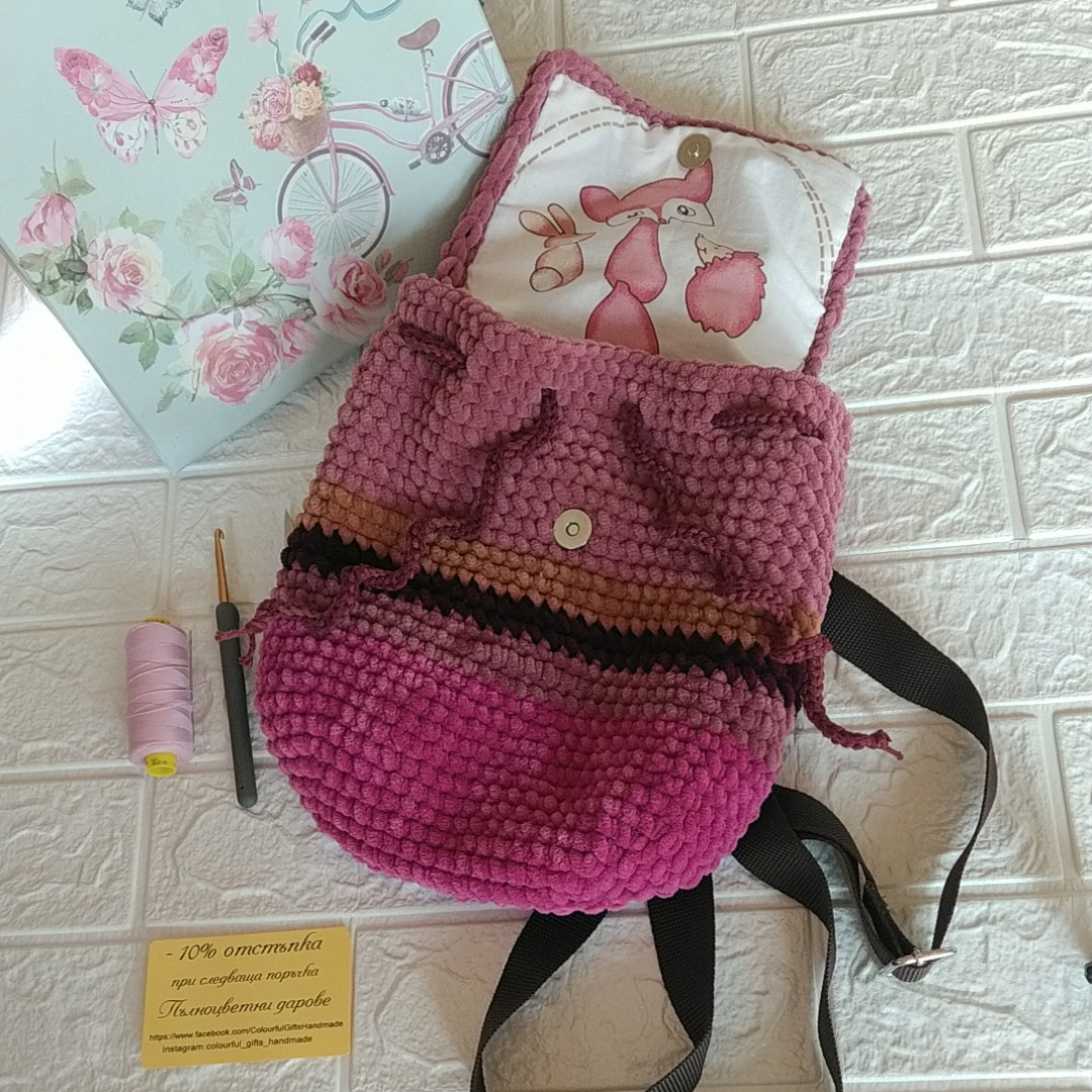 Налична плюшена раничка в няколко цвята. Вътрешна височина 24 см. Ширина 24 см. Закопчаване с магнитно копче на капака и въже за стягане. Подплата с един вътрешен джоб, със сърничка, зайче и птичета. Текстилни дръжки, които се регулират. Преди време бях скептична към този тип ранички, но се оказаха изненадващо издръжливи. Пристигат опаковани в кутия с панделка, готови за подаряване. С инструкция за пране и поддържане. Възможност за добавяне на лично послание и картичка с името на получателя. Поздрави! Пълноцветни дарове ?