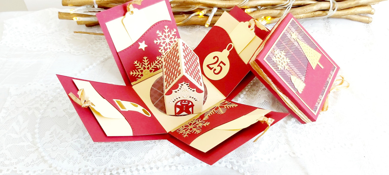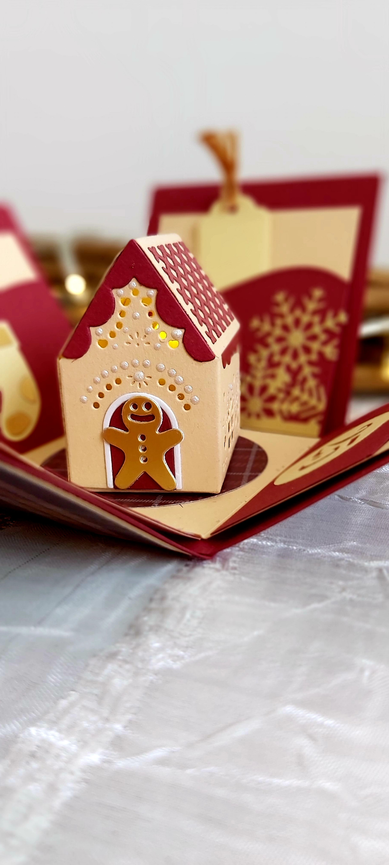 3D коледна експлодираща кутийка с 4 тагчета за пожелания, а в центъра й е сгушена малка къщичка, осветена със светеща LED светлина за една по-уютна Коледа.