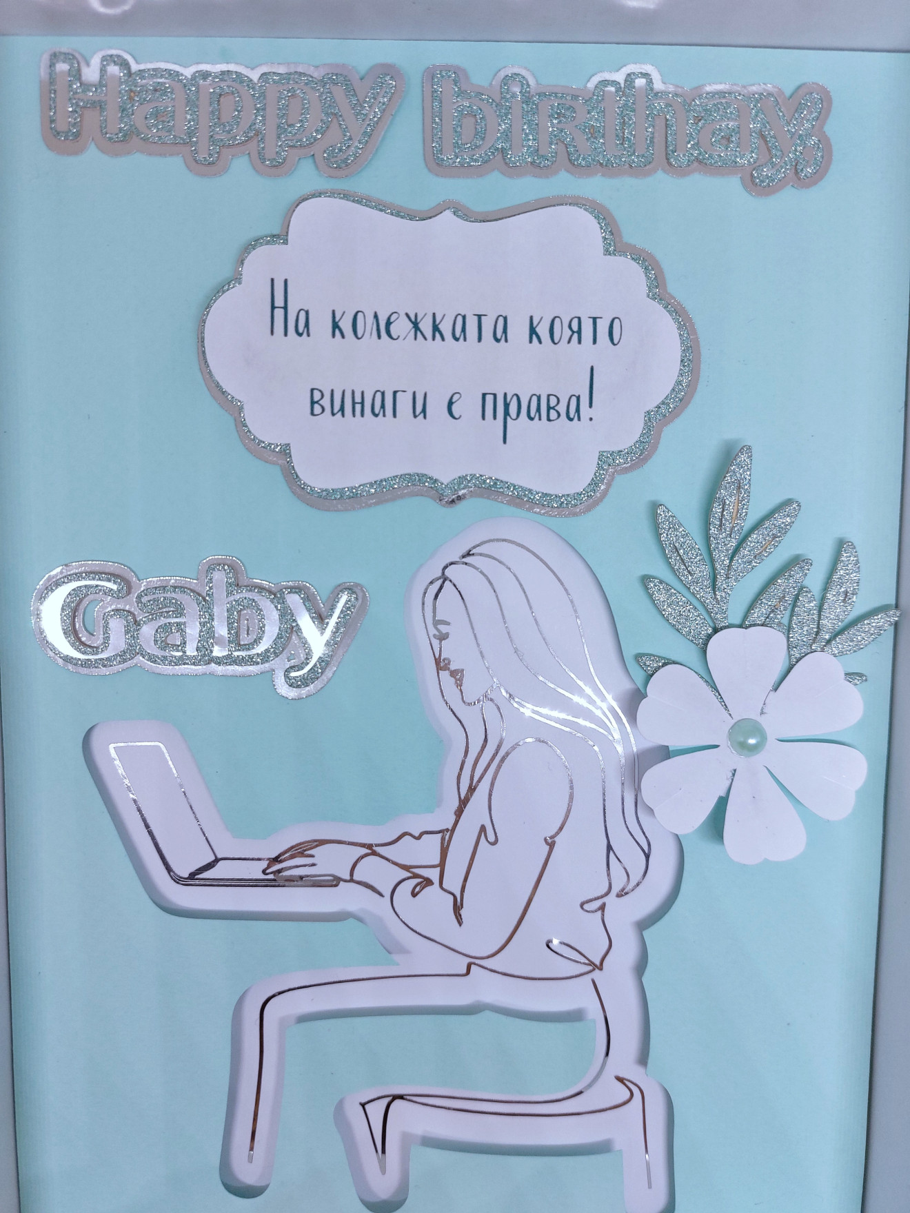 Съчетавайки изкуство и емоции, тази уникална рамка с 3D елементи от картон ще направи нейния специален ден още по-специален. На долния слой се изобразява силует на работеща жена, което напомня за нейната сила и усърдие. Горният слой излъчва елегантност със своя висококачествен картон в нежен ментов цвят. На този вълнуващ фон са залепени 3D елементи, които включват закачлив надпис ""За Колежка"", върху който се прелива кристален блясък. Освен това, има и надпис ""HAPPY BIRTHDAY"", който излъчва радост и щастие. Завършете уникалната персонализация с името на вашата колежка, за да направите този момент още по-особен. За допълнително усещане за радост и красота, рамката е декорирана с нежно цветенце от хартия. Ние сме горди да ви предложим възможността да изберете цветовата гама на вашата рамка според вкуса на вашата колежка.