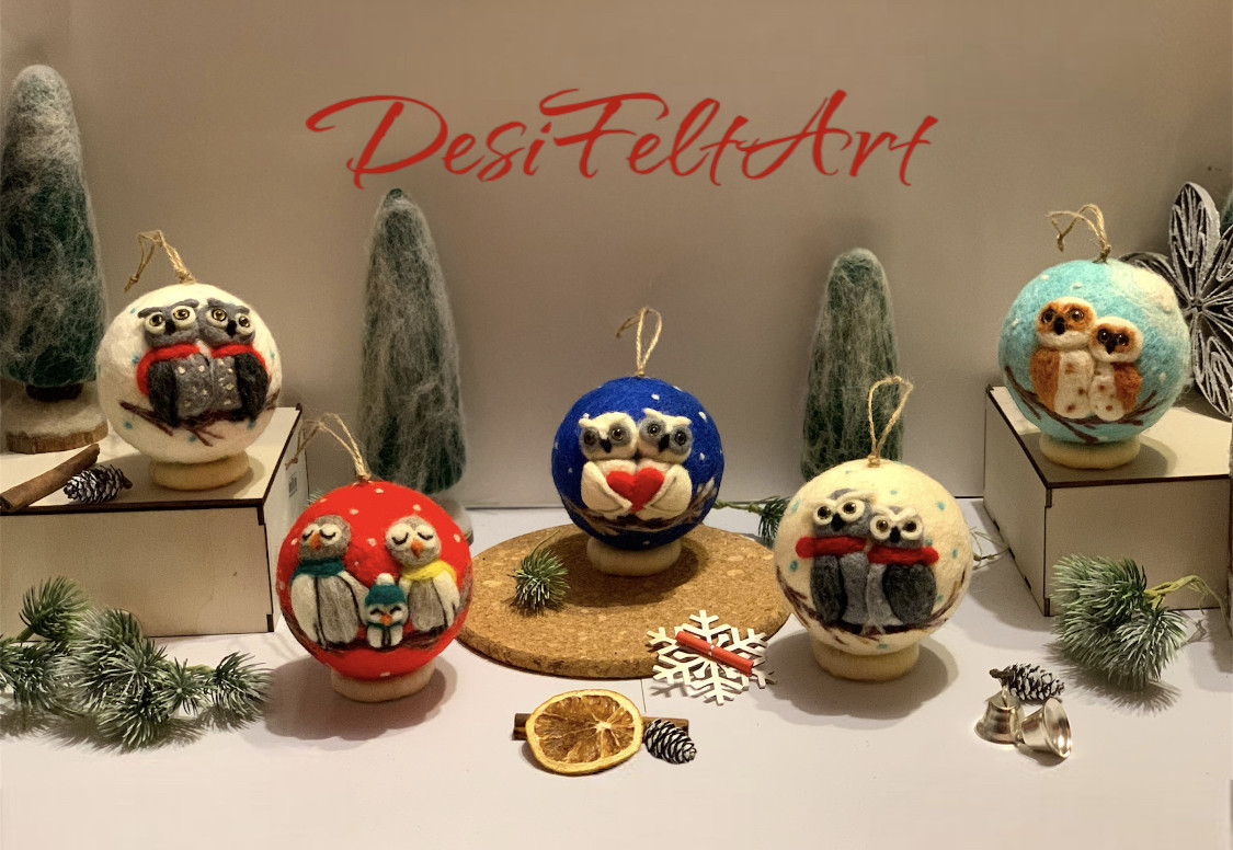 Ръчно декорирани топки с мериносова вълна, чрез комбинирана техника (сухо и мокро плъстене). За основа съм използвала стиропор с размер 9см. Цената е за 1 брой Топките за елха са незаменима част от Коледната декорация